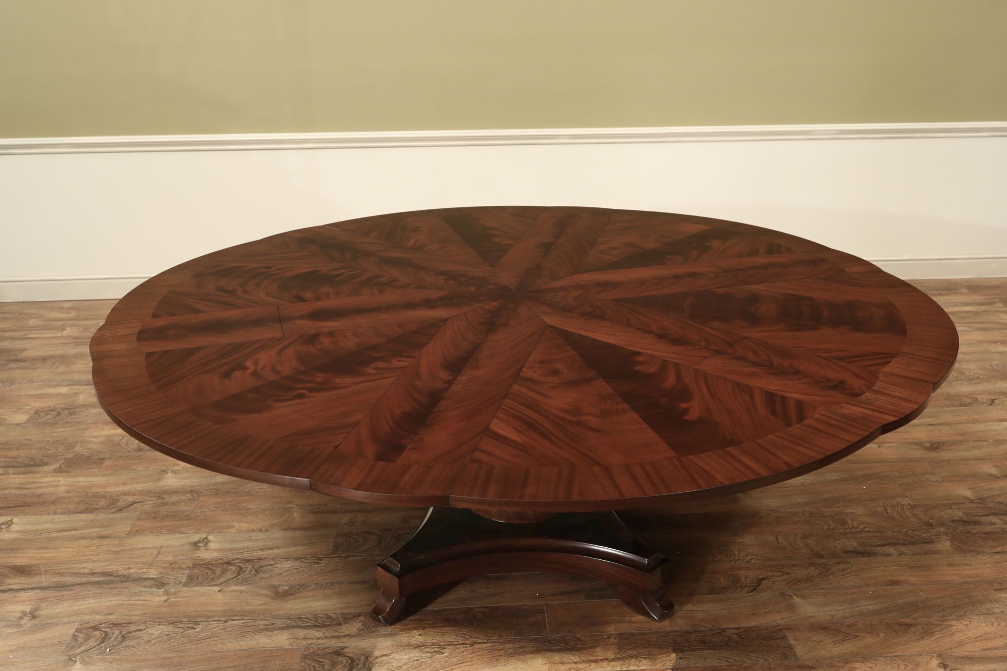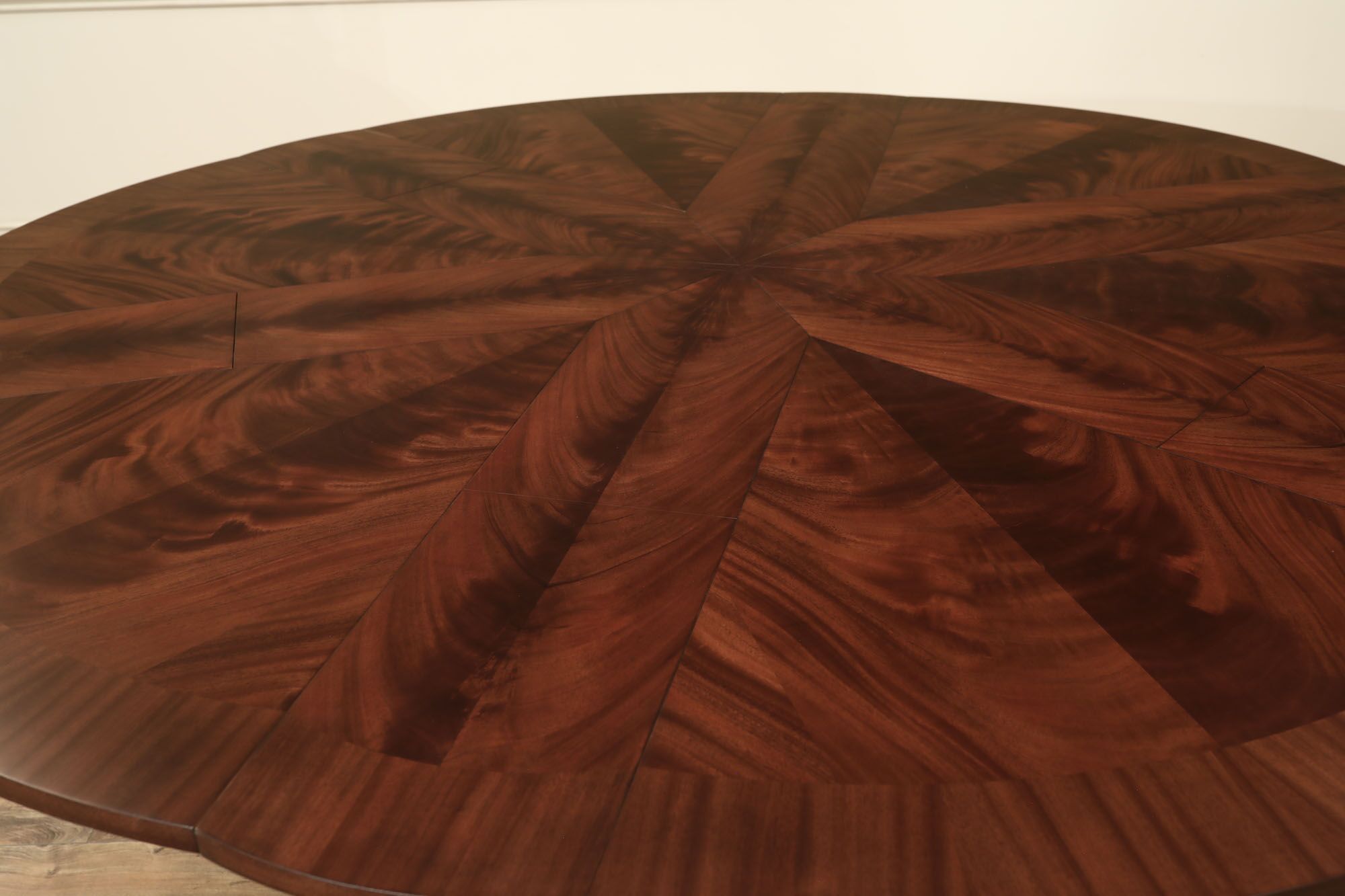 Brown mahogany finish and lighter sapele border to coordinate with most furniture. Use this table in a formal or casual setting. The simple patented jupe mechanism is not fussy and will prove to be quite dependable over the years, as there are very few moving parts. Measurements: 66″ to 86″ round, 30″ tall…