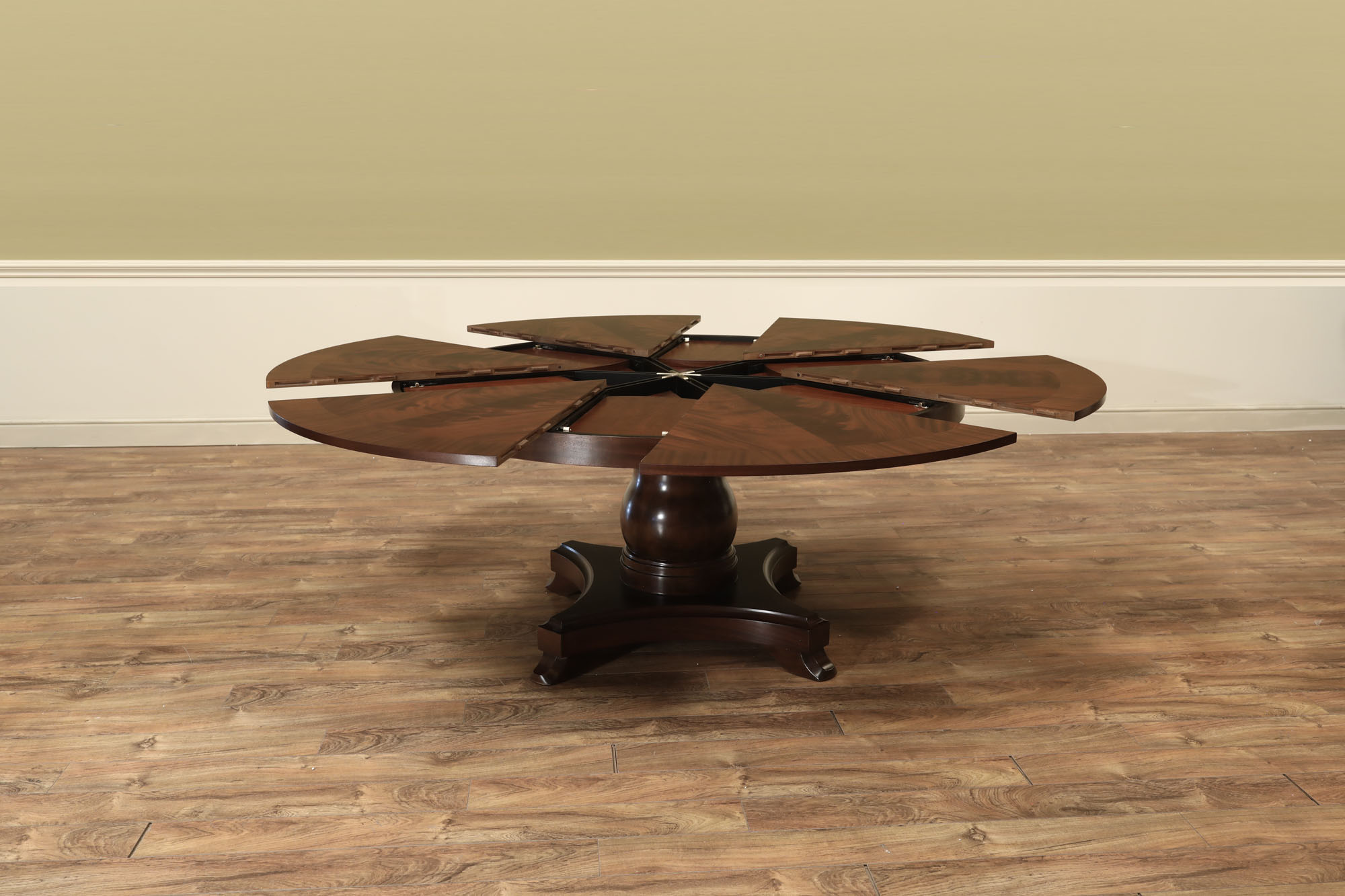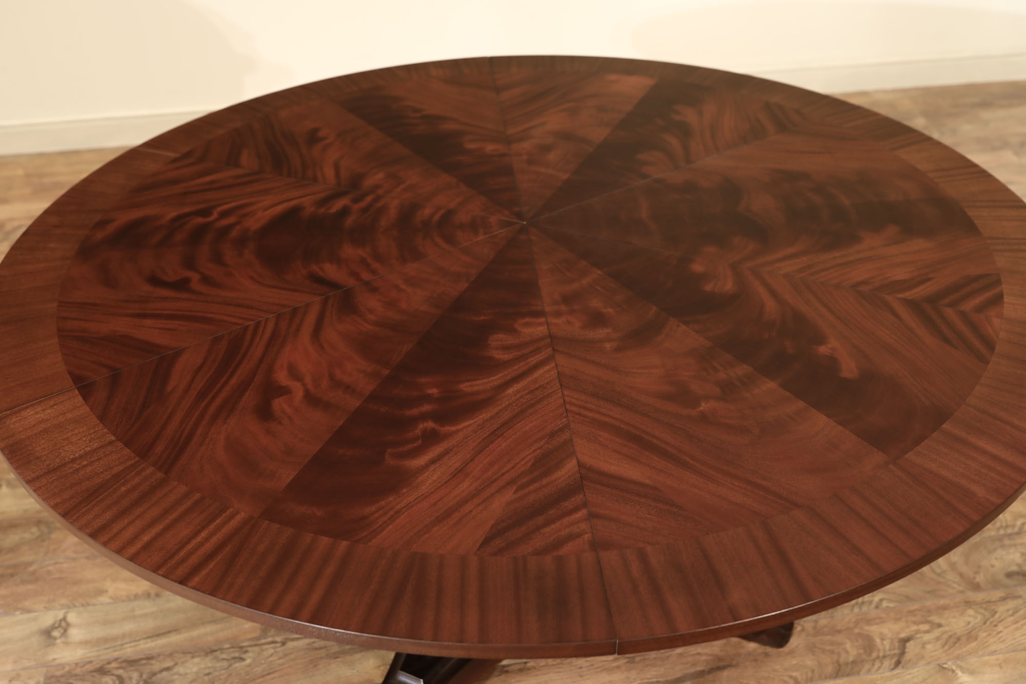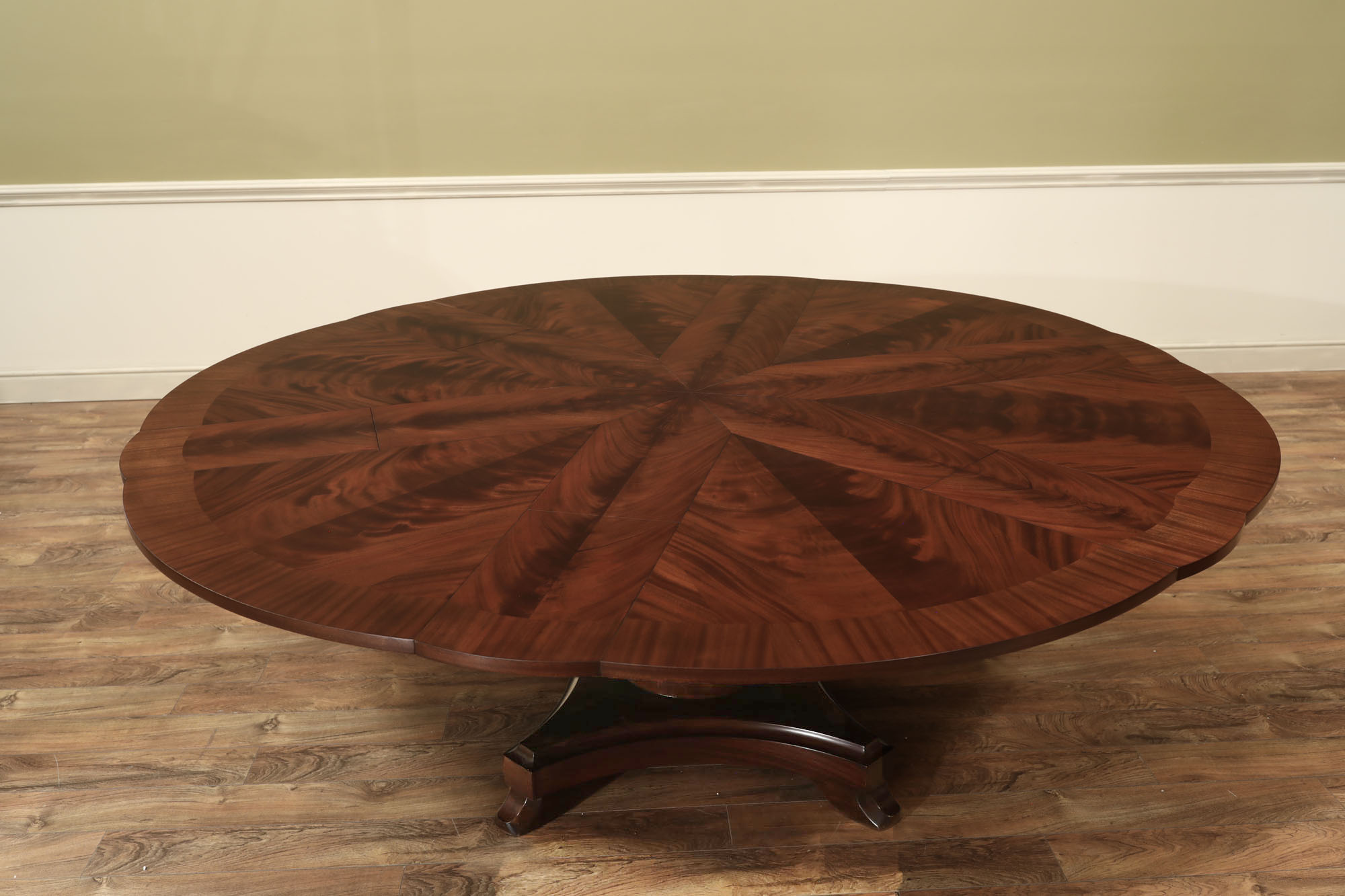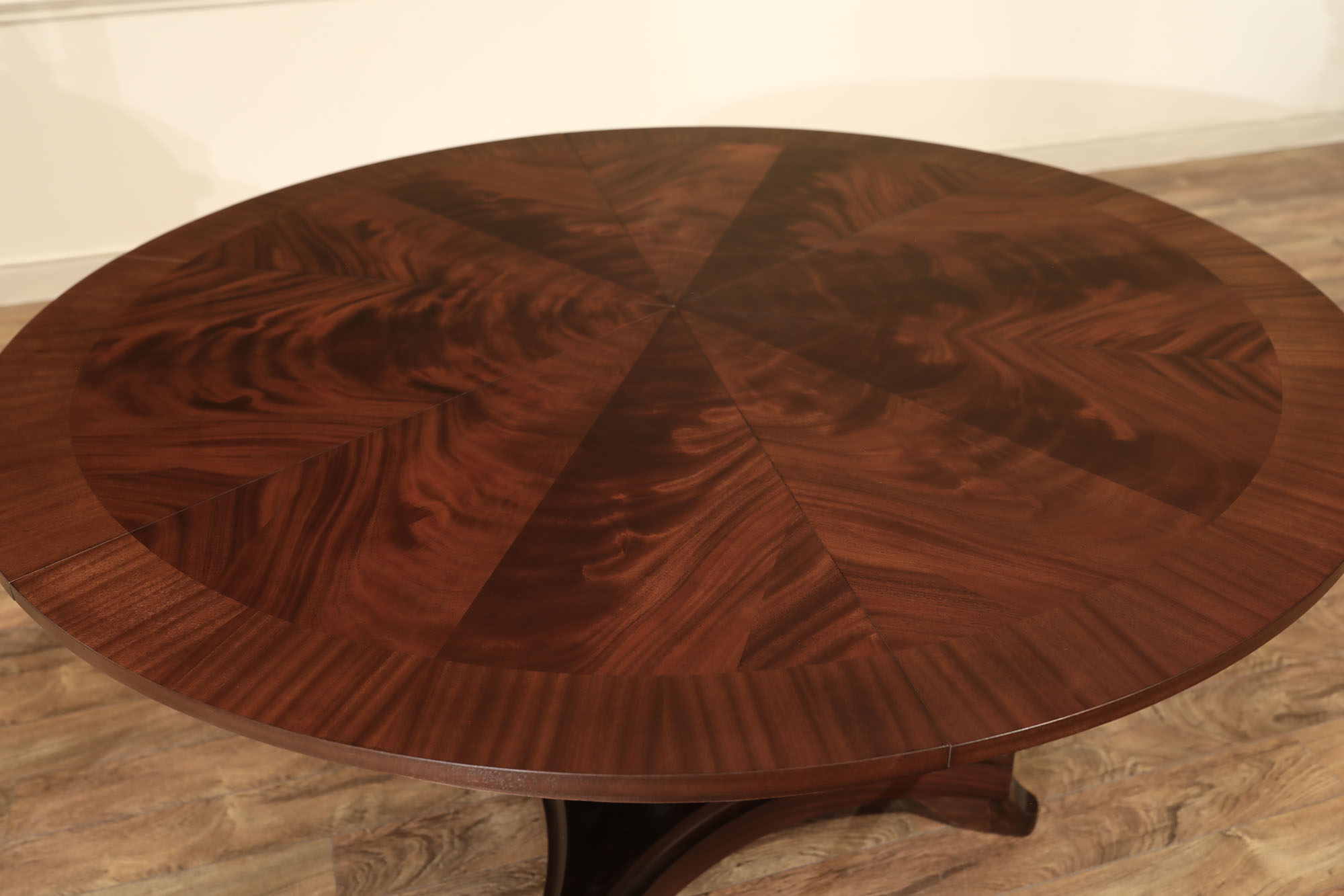 Flame mahogany Jupe dining room table with self-storing leaves, an AP Exclusive by AntiquePurveyor. A sturdy single-column, wide-platform base and an exclusively designed table built for our online store. This Jupe dining table also features an original & copyrighted foot from our King Demure collection. Brown mahogany finish and lighter sapele border to coordinate with most furniture. Use this table in a formal or casual setting. The simple, patented jupe mechanism is not fussy and will prove quite dependable over the years, thanks to its very few moving parts.