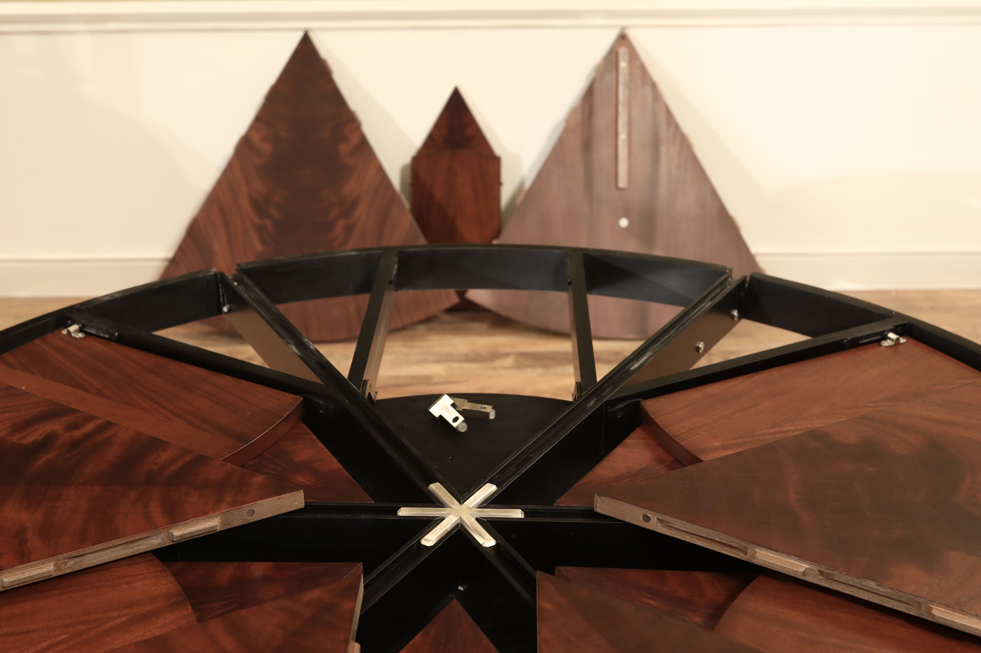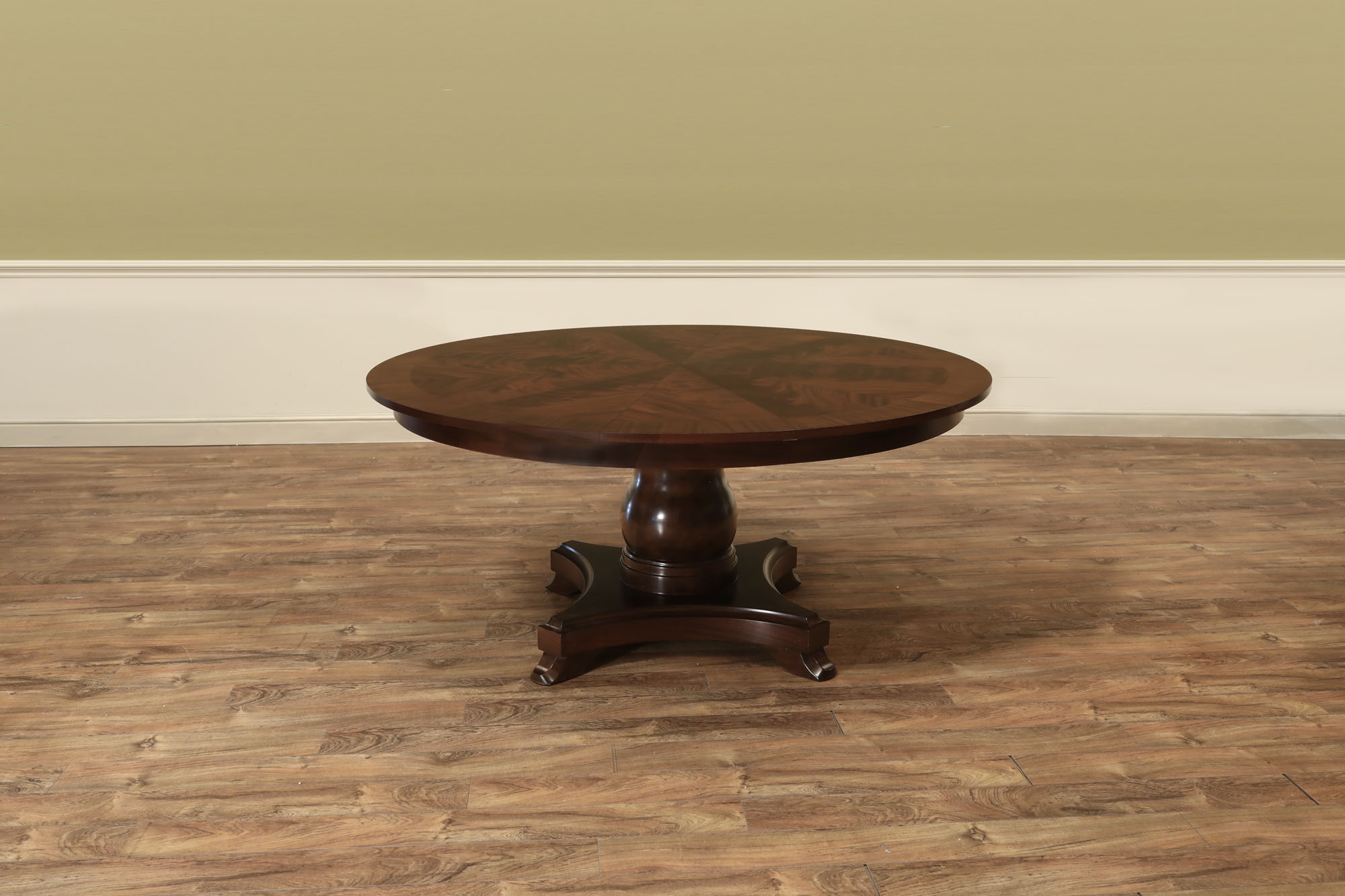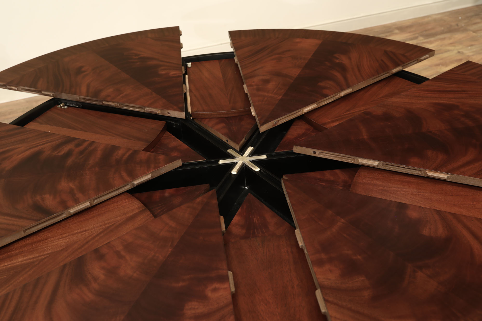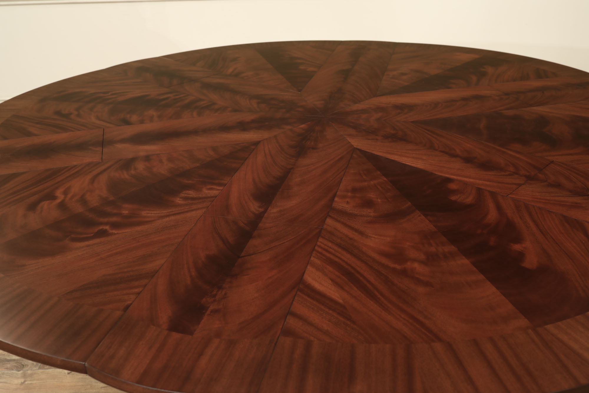 Flame mahogany Jupe dining room table with self-storing leaves, an AP Exclusive by AntiquePurveyor. A sturdy single-column, wide-platform base and an exclusively designed table built for our online store. This Jupe dining table also features an original & copyrighted foot from our King Demure collection. Brown mahogany finish and lighter sapele border to coordinate with most furniture. Use this table in a formal or casual setting. The simple, patented jupe mechanism is not fussy and will prove quite dependable over the years, thanks to its very few moving parts.