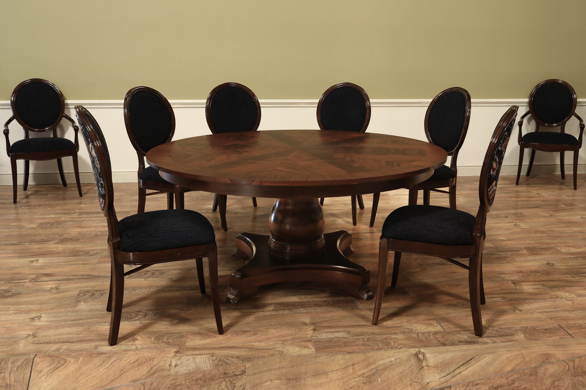 Home » Catalog » Mahogany Jupe table. 64 inch round to round solid dining table with brown mahogany finish. an AP Exclusive by AntiquePurveyor