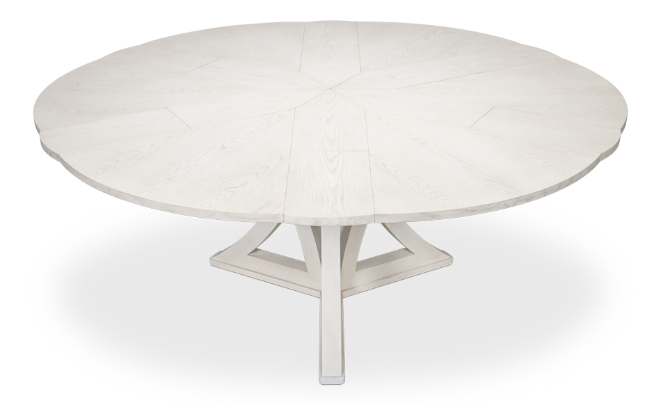 Casual white jupe table. Transitional family-friendly working white finished table with self-storing leaves. Expansion table for seating 6 to 10 people. Sturdy table with magnetic leaf fasteners. Saber leg expansion table. Great table for the modern dining room or kitchen. The table forms a true round shape in its closed configuration. When extended, it has an imperfect round profile. Please see the final gallery images for this detail.
