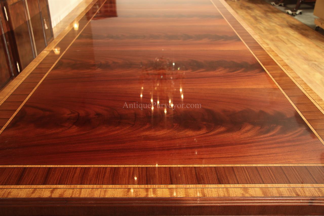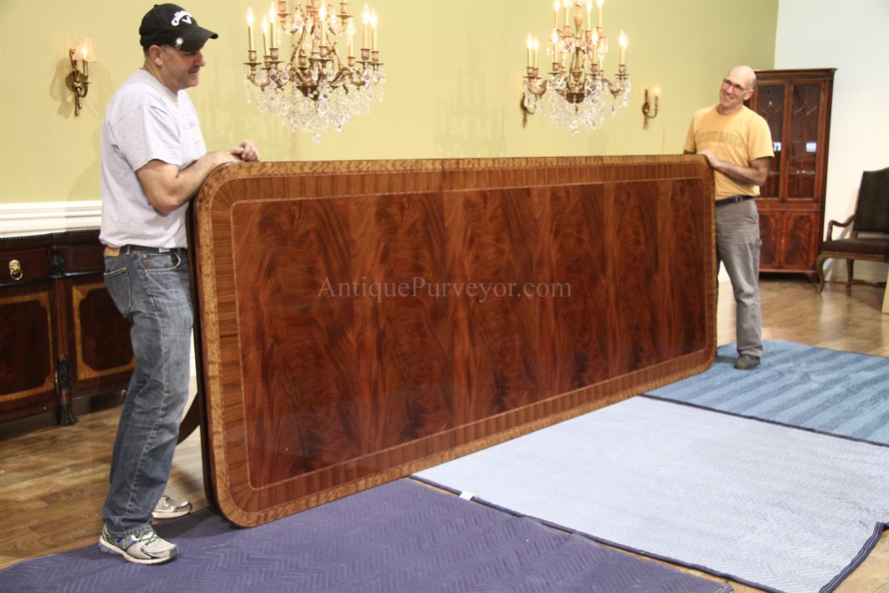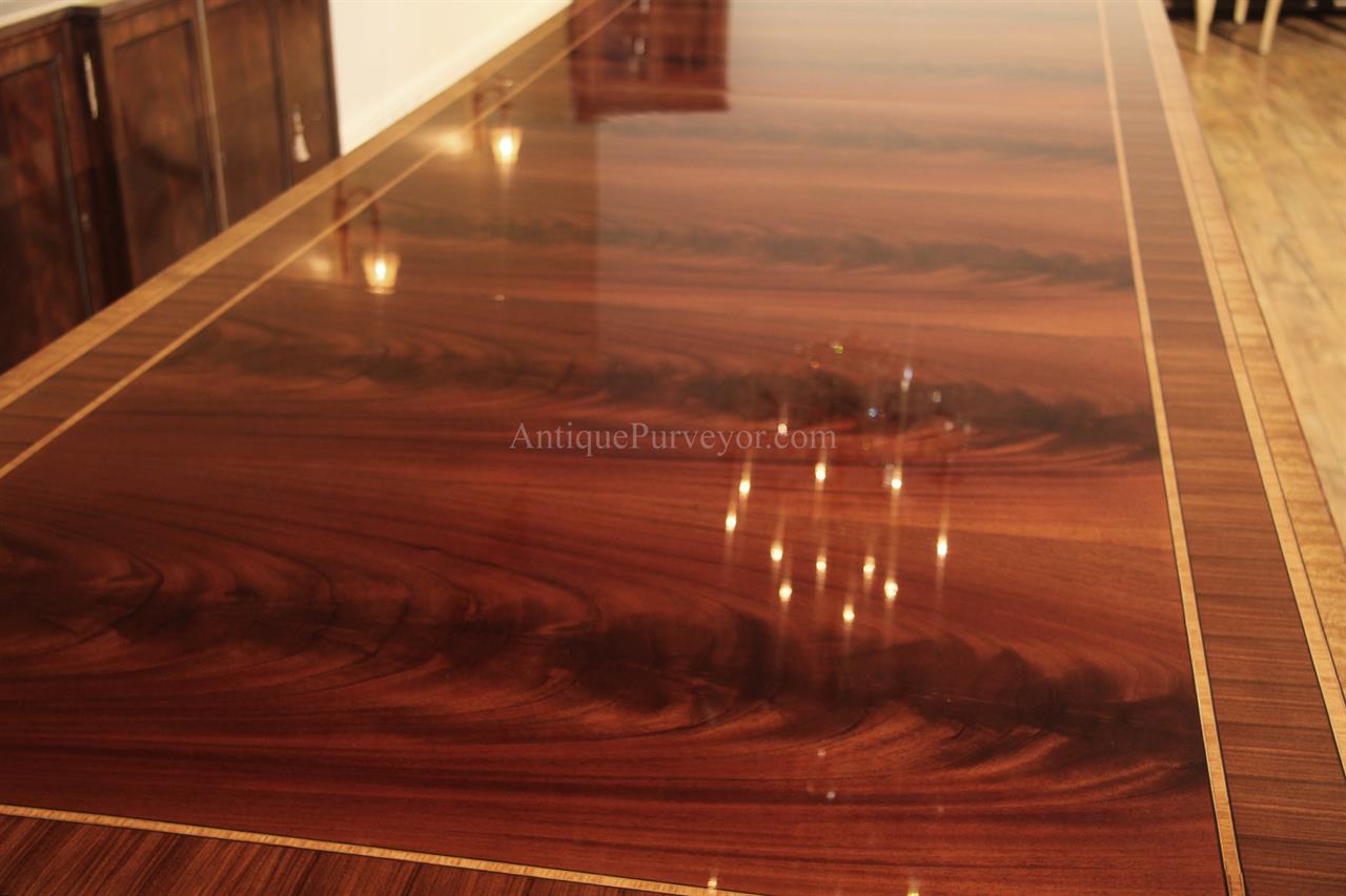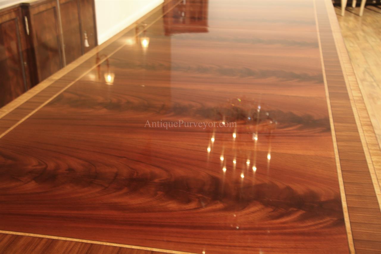 This is a very sturdy table. The table starts out at 8 feet long and has two 4-foot leaves. This 16-foot by 52-inch wide dining table is finished with a razor-thin lacquer top coat, which is perfectly clear and captures lots of light and shows off wood grain. The rich flame mahogany Veneers are like a hologram, changing appearance as you walk around the table.