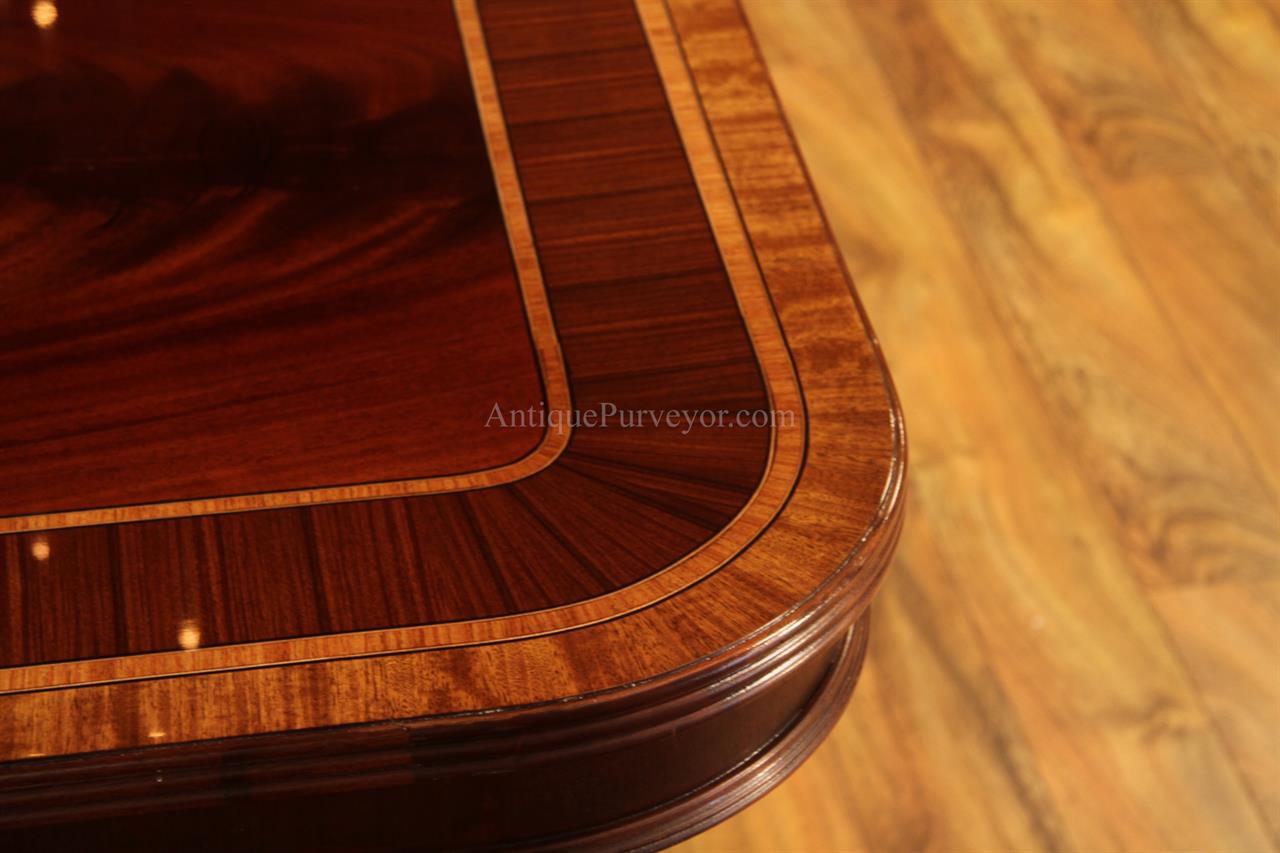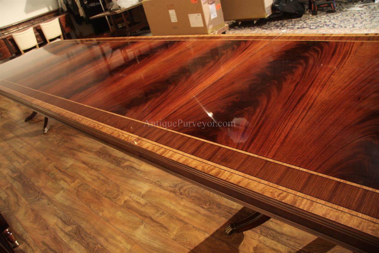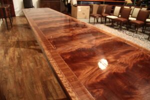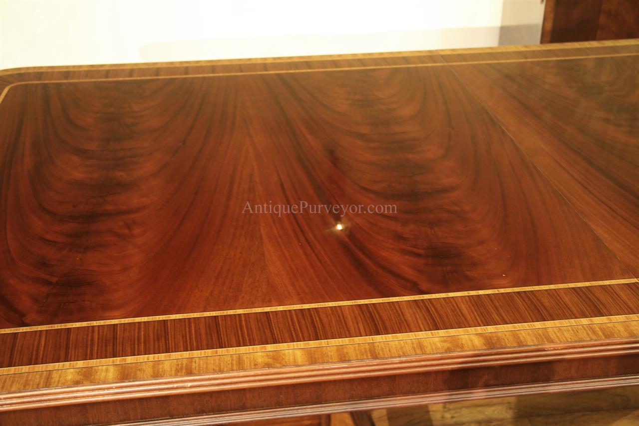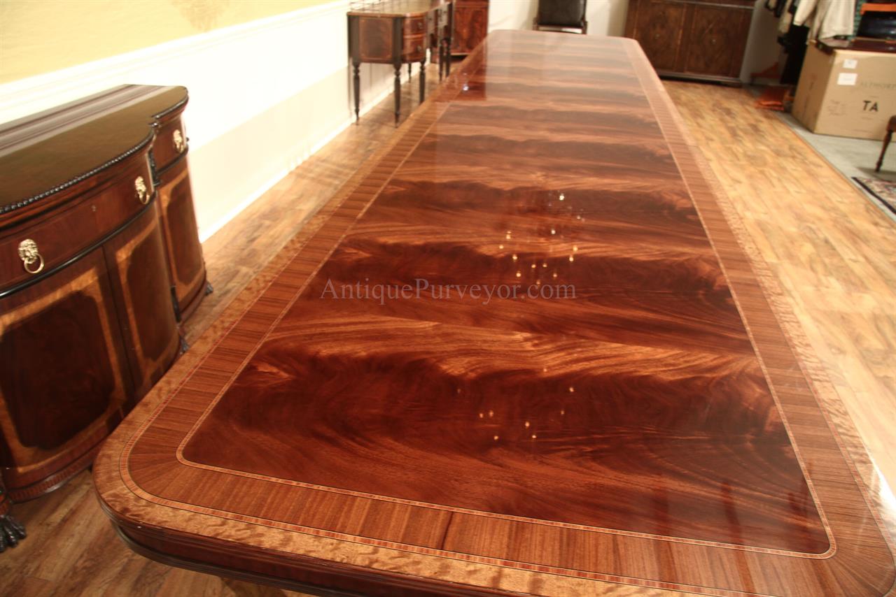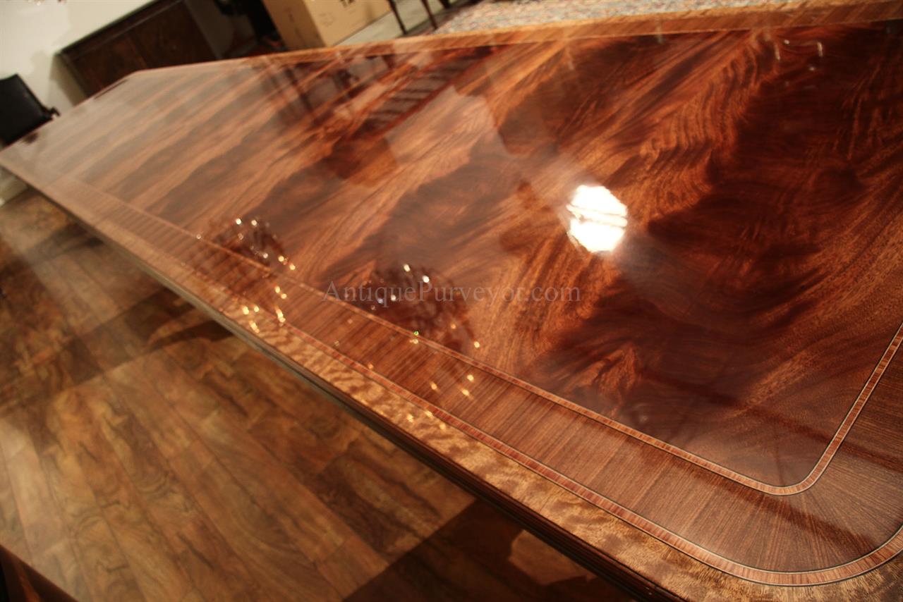 This is a very sturdy table. The table starts out at 8 feet long and has two 4-foot leaves. This 16-foot by 52-inch wide dining table is finished with a razor-thin lacquer top coat, which is perfectly clear and captures lots of light and shows off wood grain. The rich flame mahogany Veneers are like a hologram, changing appearance as you walk around the table.