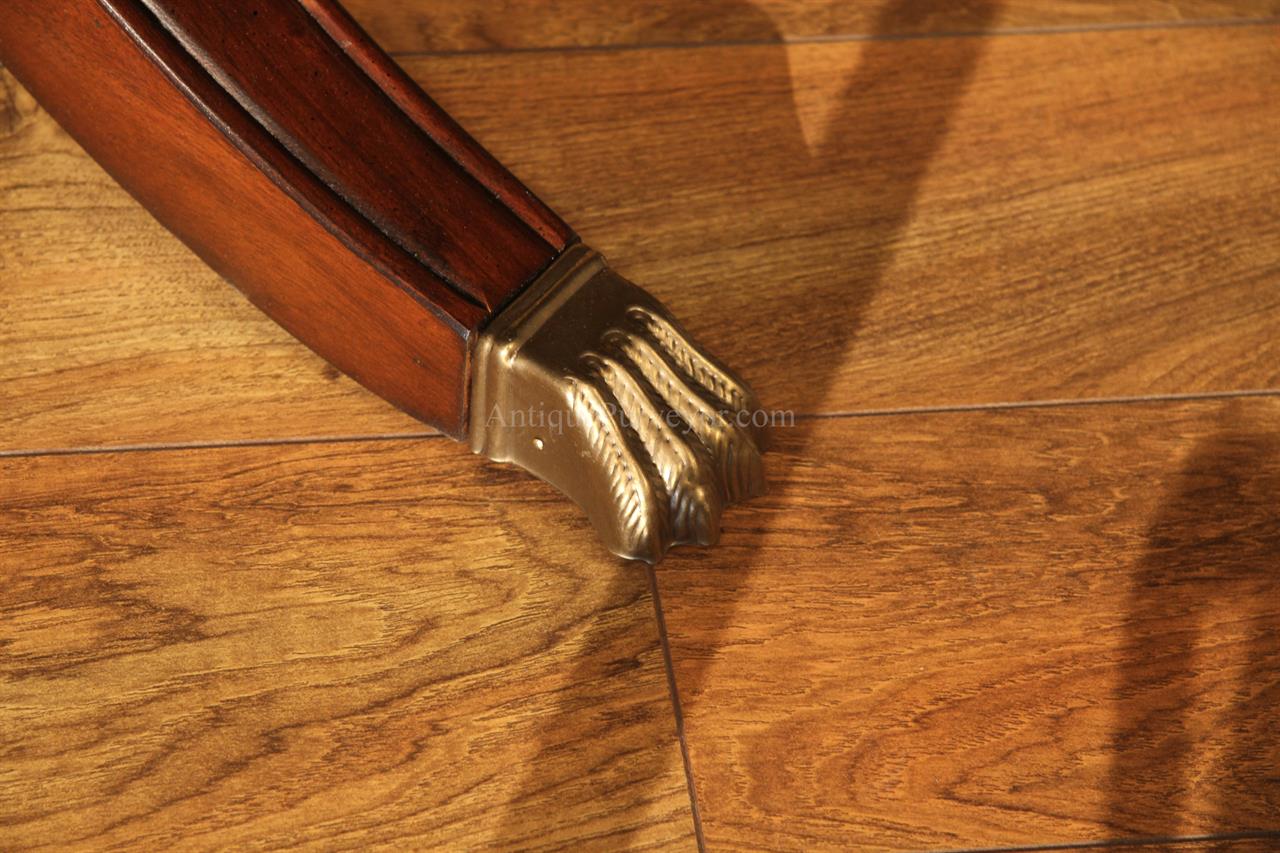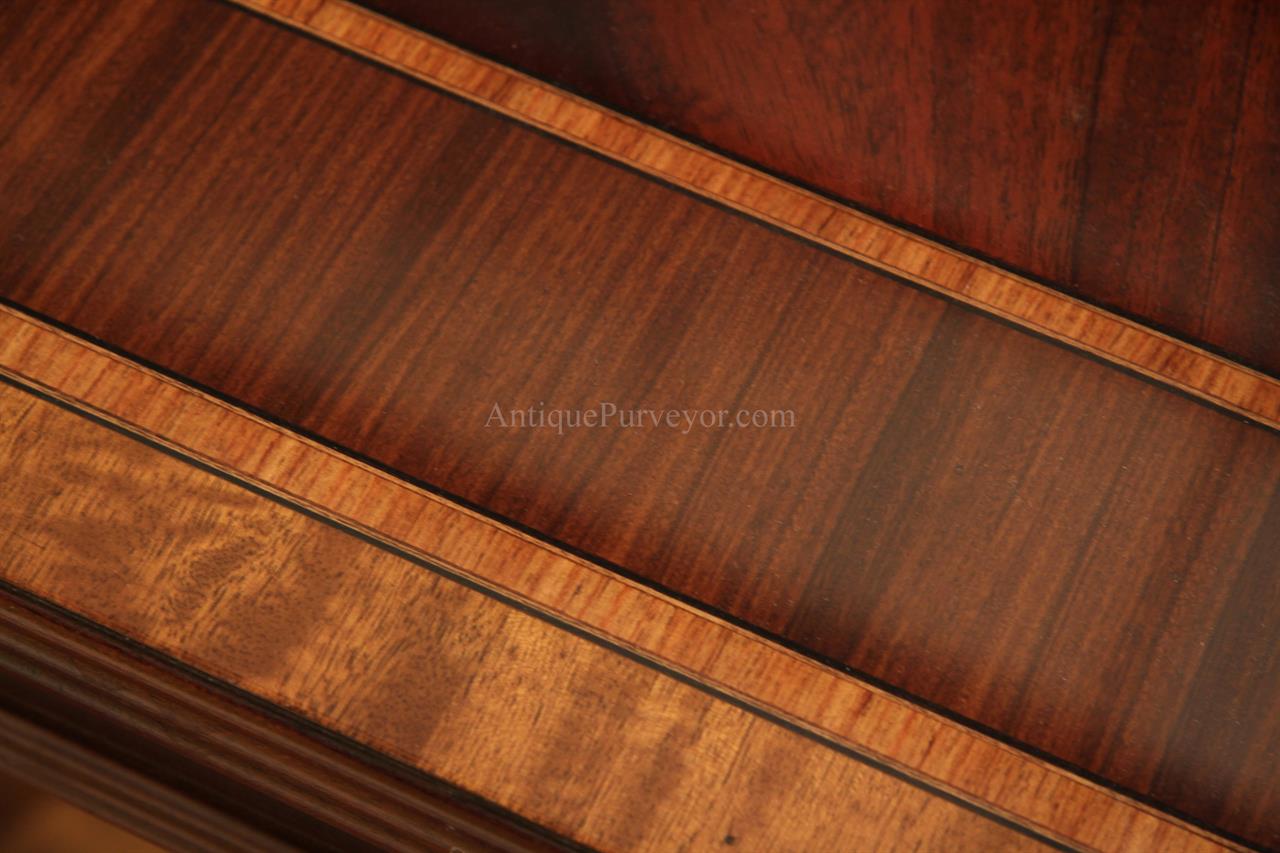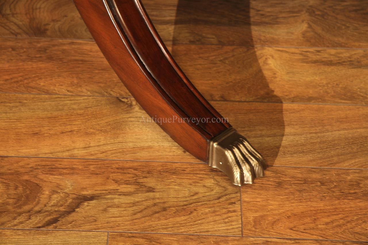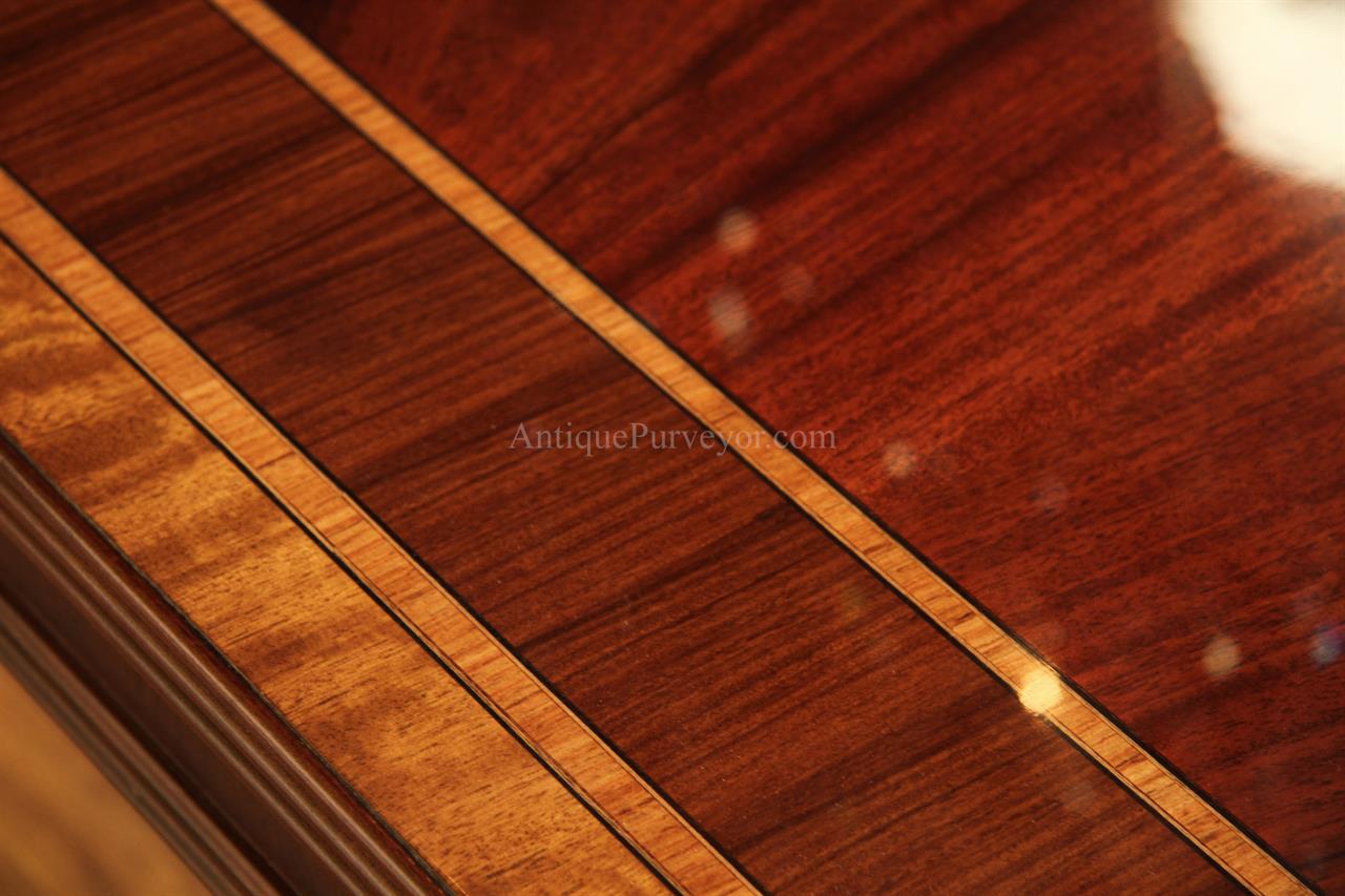 This is a very sturdy table. The table starts out at 8 feet long and has two 4-foot leaves. This 16-foot by 52-inch wide dining table is finished with a razor-thin lacquer top coat, which is perfectly clear and captures lots of light and shows off wood grain. The rich flame mahogany Veneers are like a hologram, changing appearance as you walk around the table.