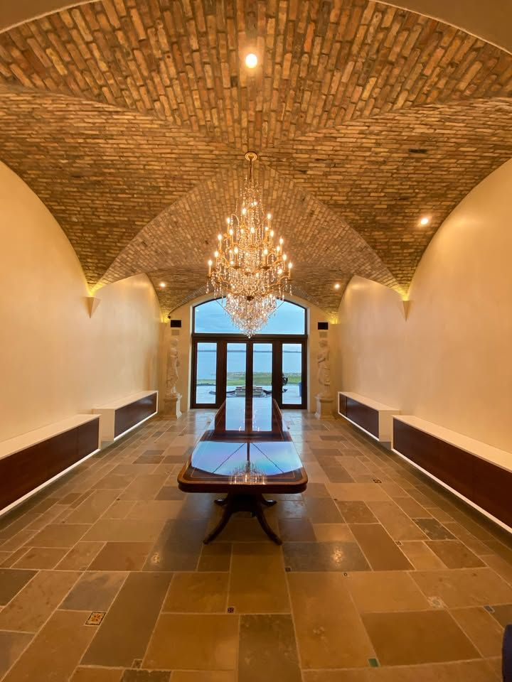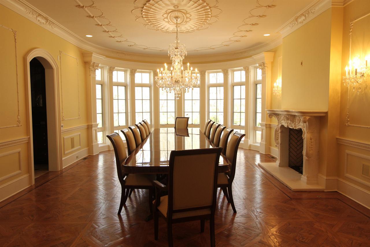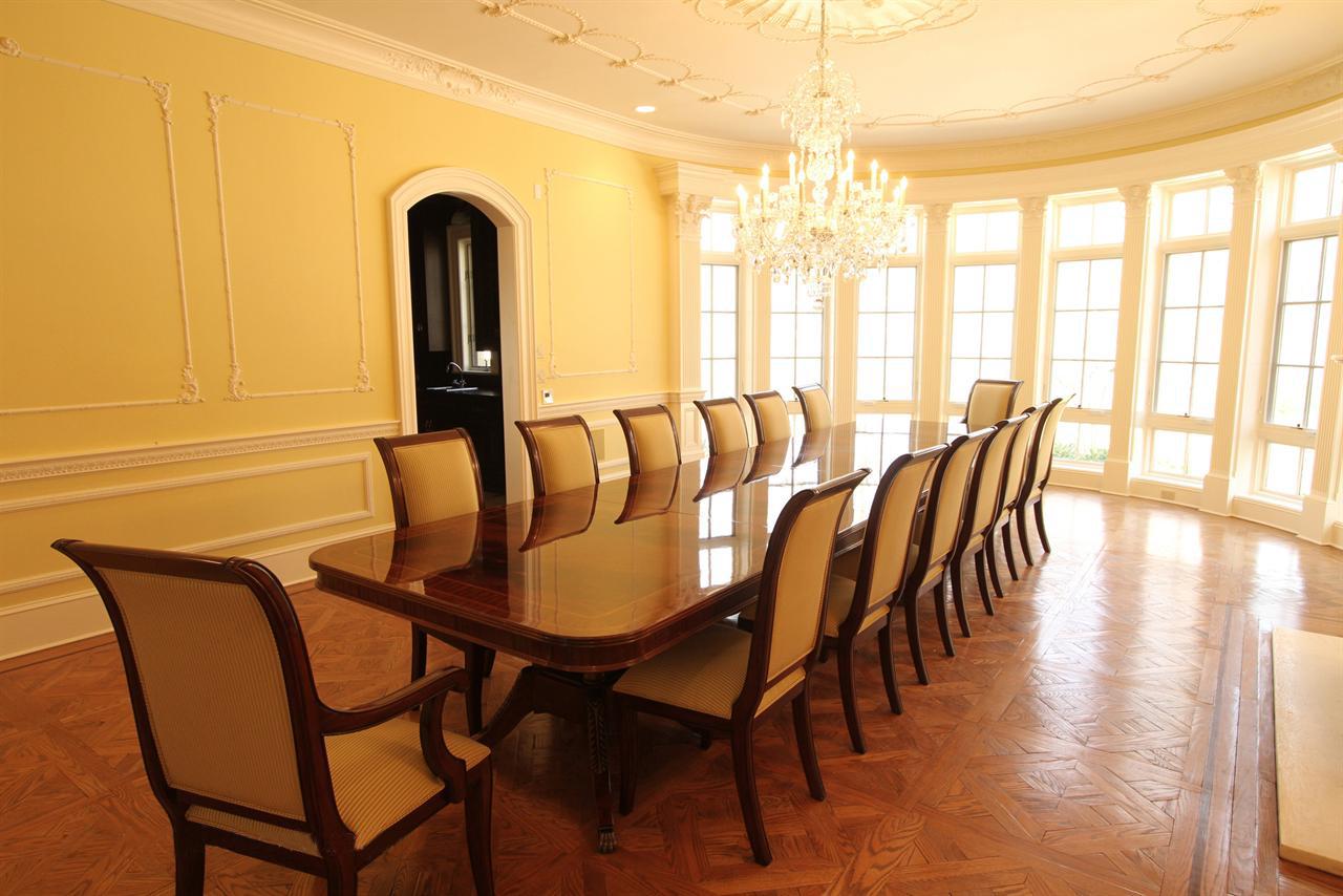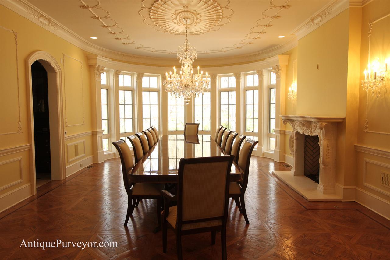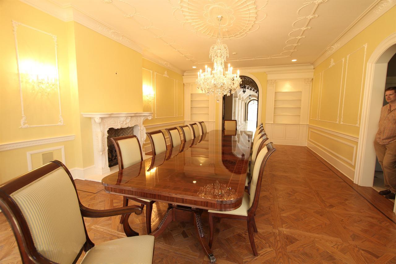 This is a very sturdy table. The table starts out at 8 feet long and has two 4-foot leaves. This 16-foot by 52-inch wide dining table is finished with a razor-thin lacquer top coat, which is perfectly clear and captures lots of light and shows off wood grain. The rich flame mahogany Veneers are like a hologram, changing appearance as you walk around the table.