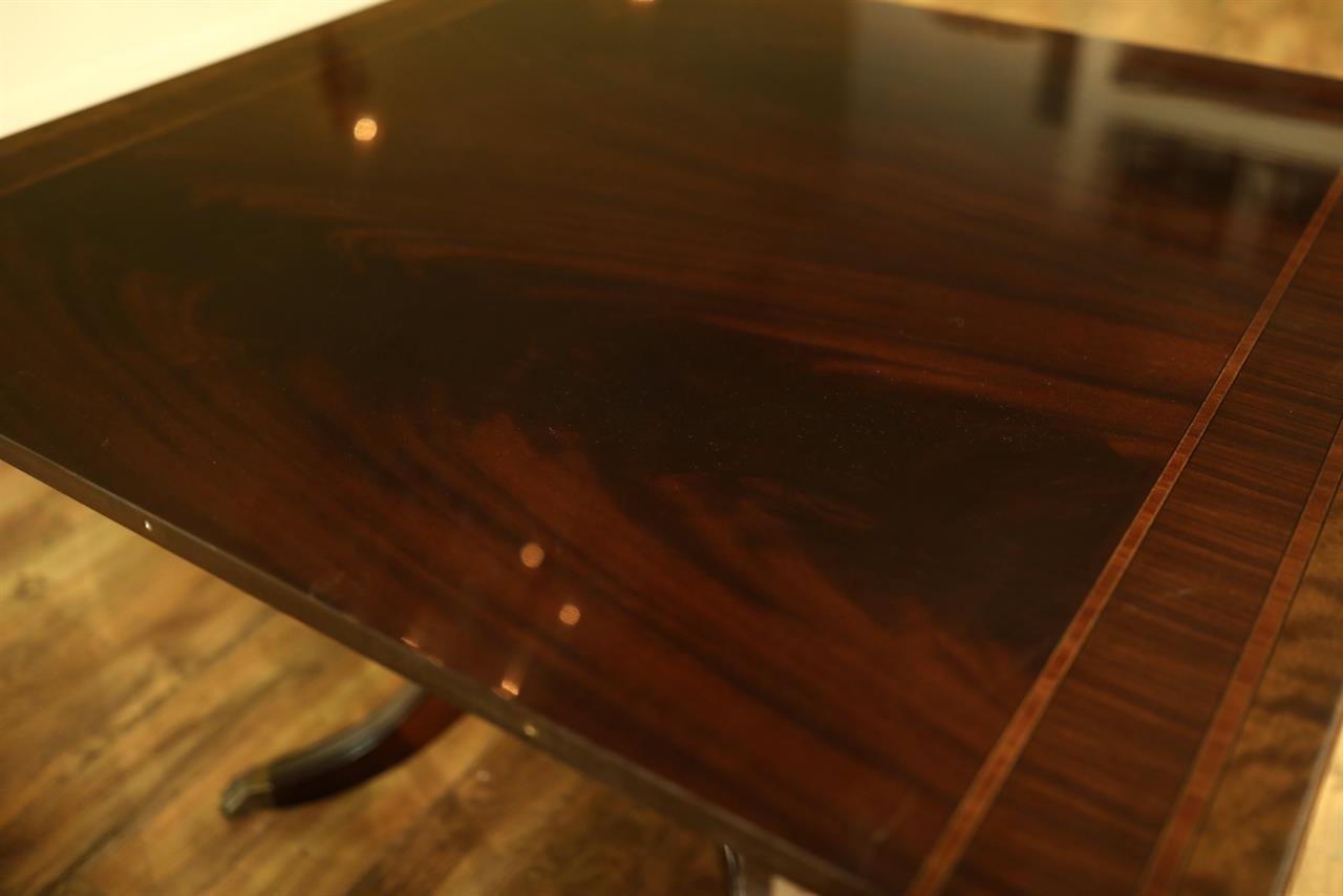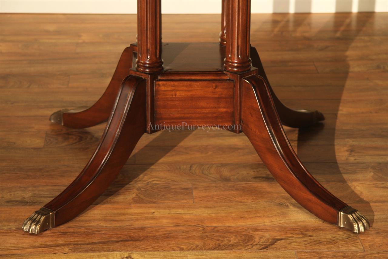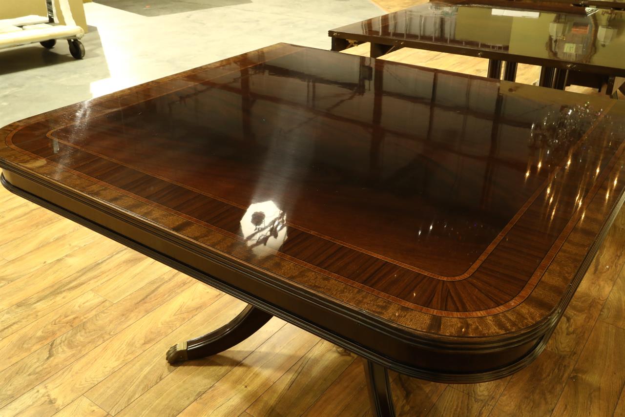 Extra large and long American-made high-end mahogany dining room table. This is an eight to sixteen-foot extra-long dining table that can seat 20 people. It is a Duncan Phyfe pedestal table that has two oversized leaves, birdcage pedestals, and outswept legs.