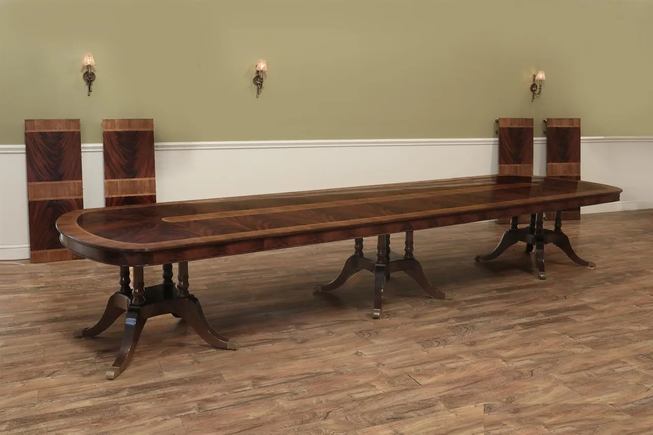 Extra-large satinwood inlaid mahogany dining room table. This table can be used from 9 to 21 feet long, and it is 52 inches wide. It features a D-shape end, a wide satinwood inlaid border, a crotch mahogany perimeter apron, and a sunburst-inlaid crotch mahogany field. The table is easy to maneuver because it starts at a manageable 9-foot-long length consisting of three 36-inch sections. Each of these primary sections gets its large birdcage pedestal, which is strongly made with steel braces at each leg and solid brass foot caps and adjustable levelers.