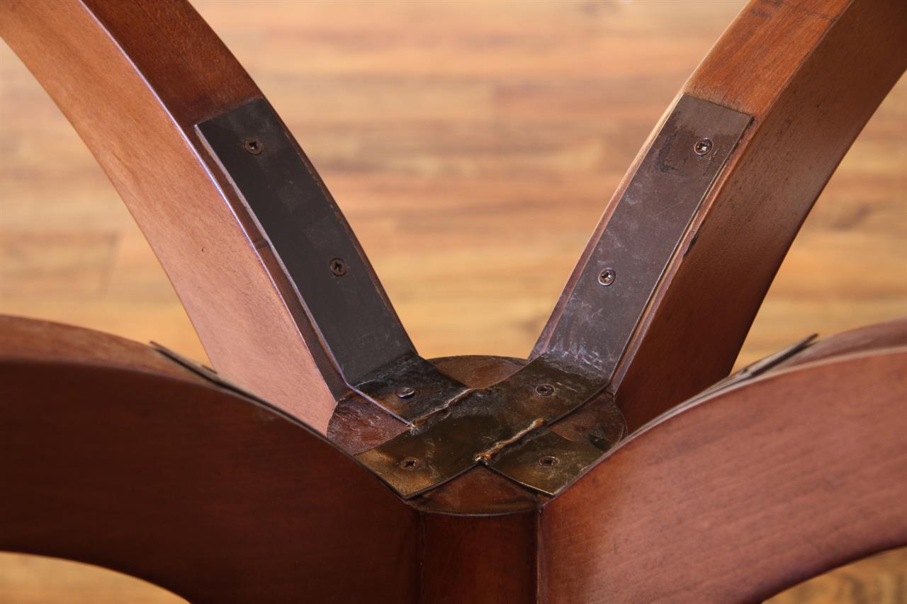 American made Heirloom quality scallop corner mahogany dining table opens to 140 inches and seats 14 people. This table has an unusual Veneer lay up which runs the length of the table with one bookmatch seam down the center. It is extremely rare to see a table made like this. Finding crotch mahogany Veneers of this magnitude is impossible in the open market. This table’s Veneers are custom cut and milled at a Veneer plant just for this model table. A Stately dining room table which will last many generations. This table is 100% American made and finisihed in the USA for unmatched quality. The table has our proprietary finish which is a brown mahogany and a caramel brown satinwood banding.