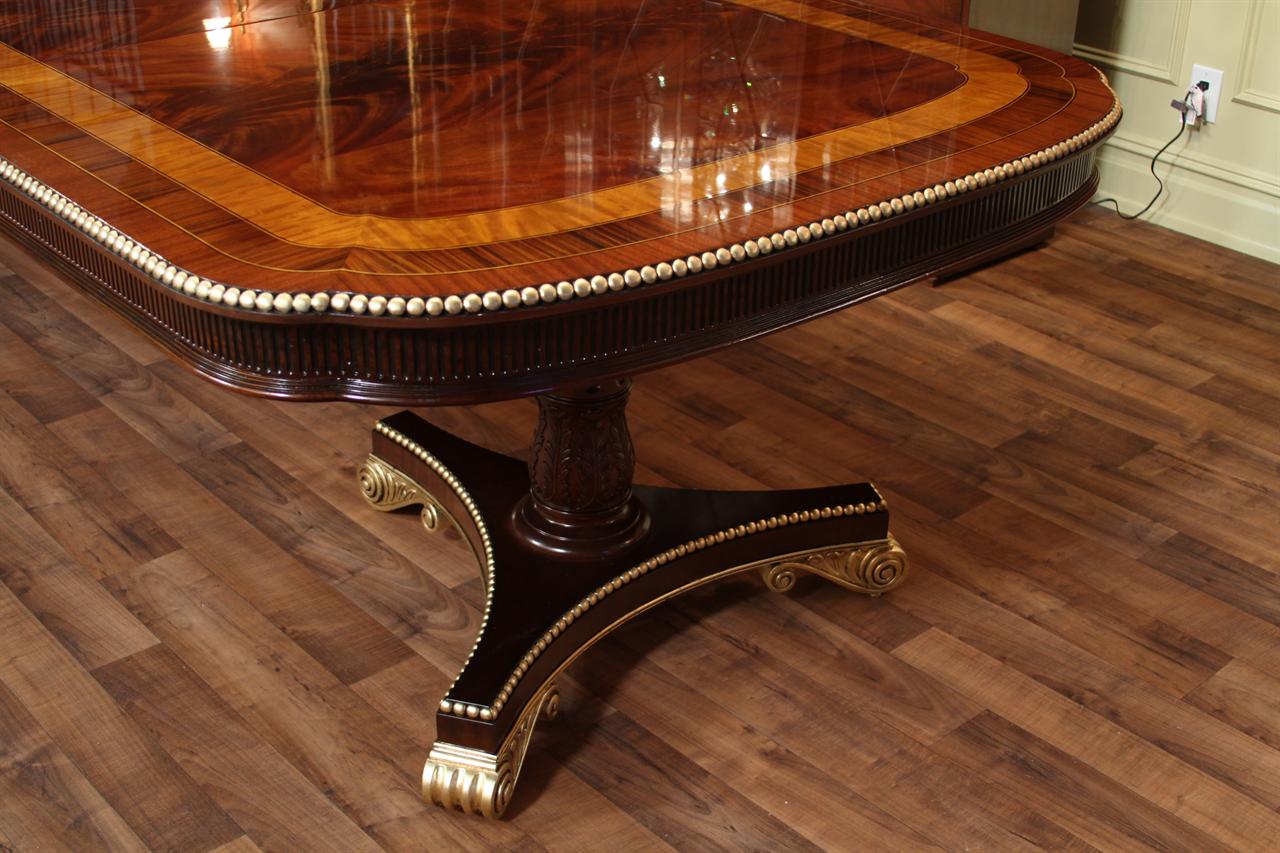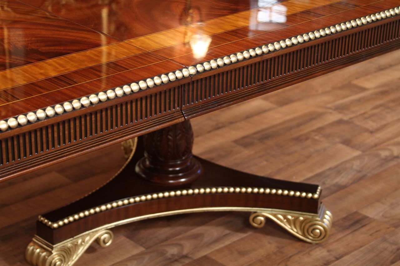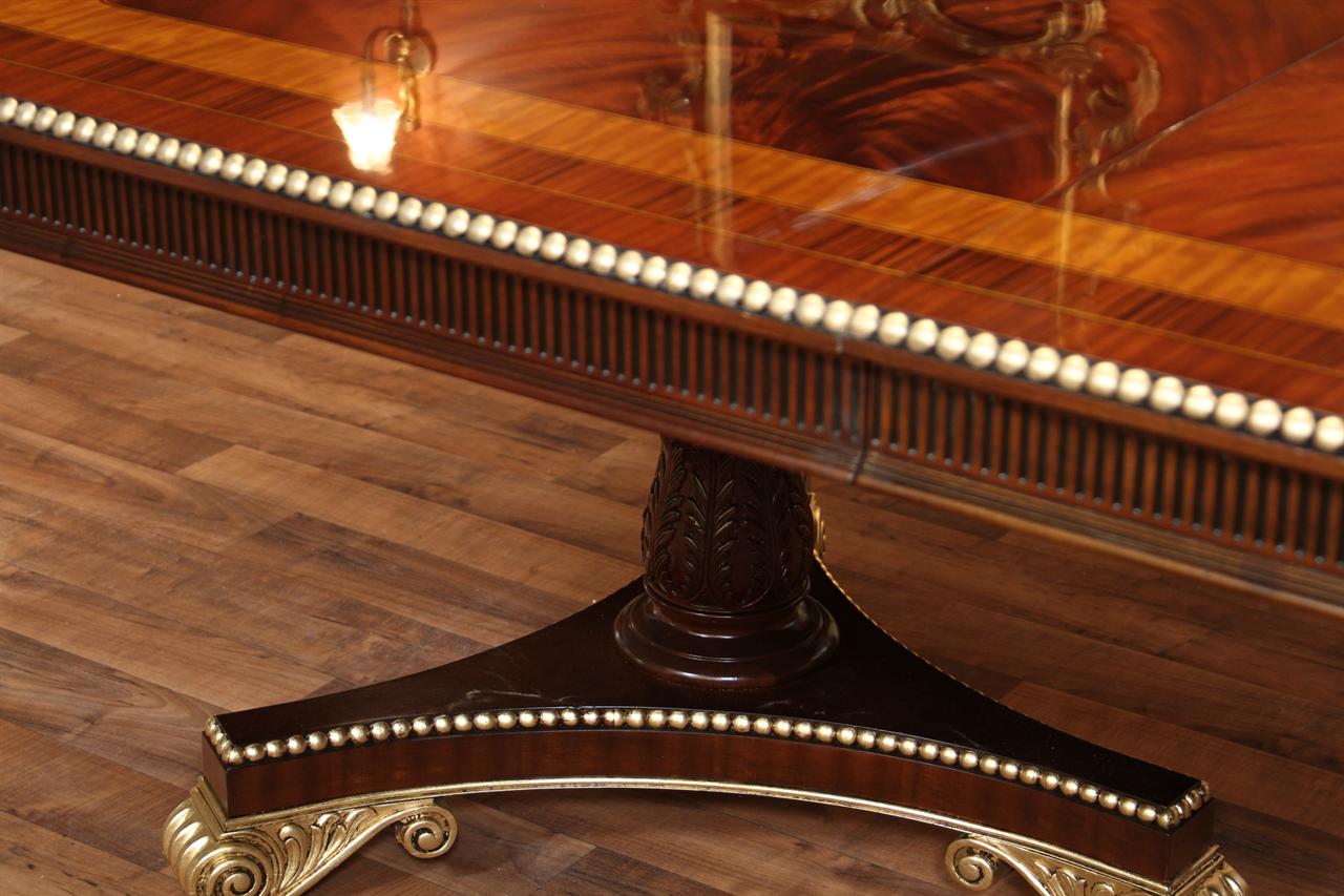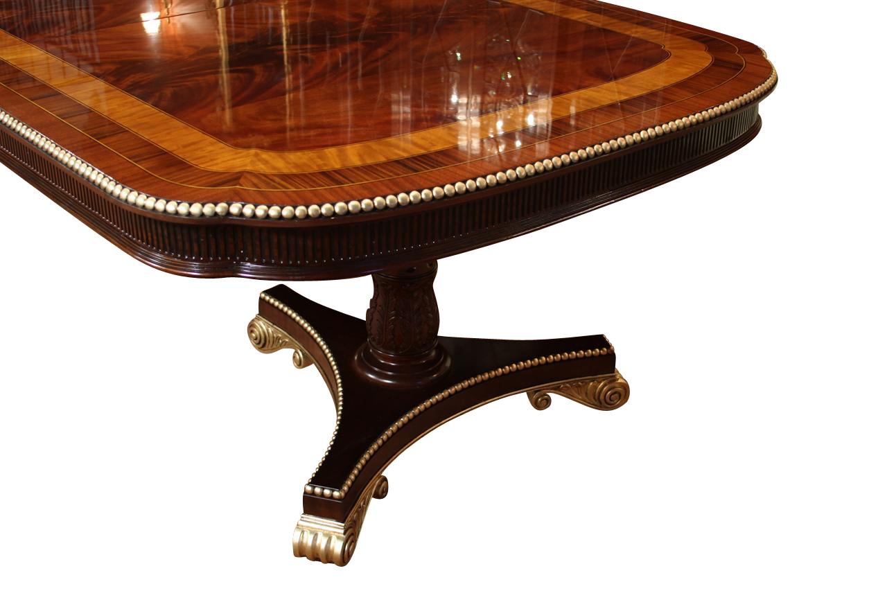 American Empire or Regency-style dining table. Extra wide (54-inch) mahogany dining table with robust carvings and details. A modern regency table fit for the higher-end home. This table starts at 89 inches long and can extend to 156 inches with three leaves or extensions. You can use one, two, or all three leaves. The table features an embellished apron, adding to its uniqueness. This table is finished in the USA. The tabletop has wide multi-banded satinwood, rosewood, and straight-grain mahogany inlays. The apron has round marble-sized carved edges and a fluted apron.