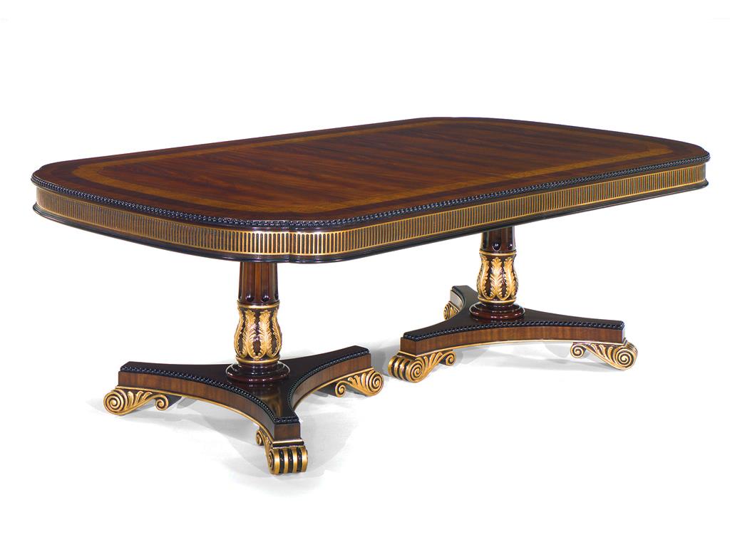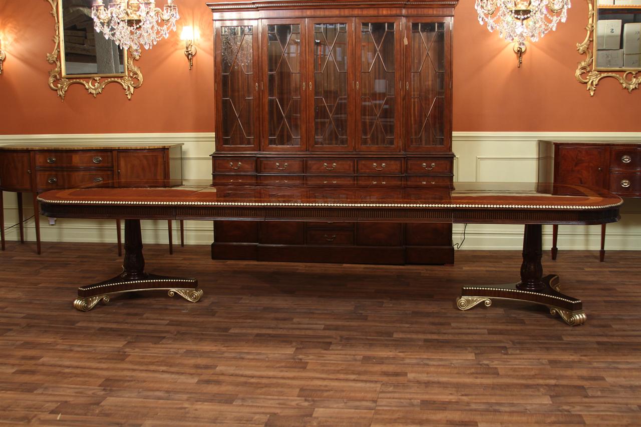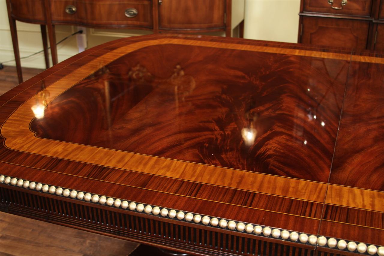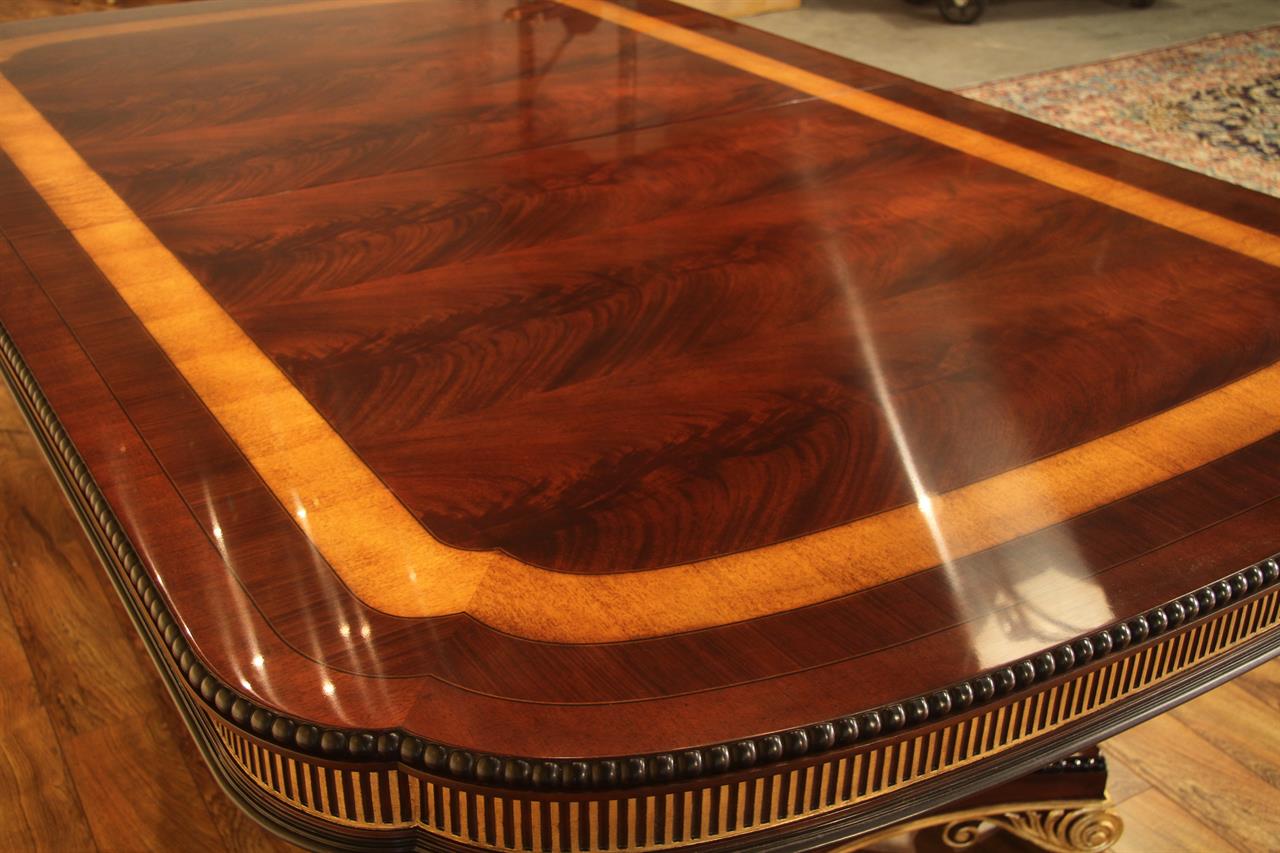 American Empire or Regency-style dining table. Extra wide (54-inch) mahogany dining table with robust carvings and details. A modern regency table fit for the higher-end home. This table starts at 89 inches long and can extend to 156 inches with three leaves or extensions. You can use one, two, or all three leaves. The table features an embellished apron, adding to its uniqueness. This table is finished in the USA. The tabletop has wide multi-banded satinwood, rosewood, and straight-grain mahogany inlays. The apron has round marble-sized carved edges and a fluted apron.