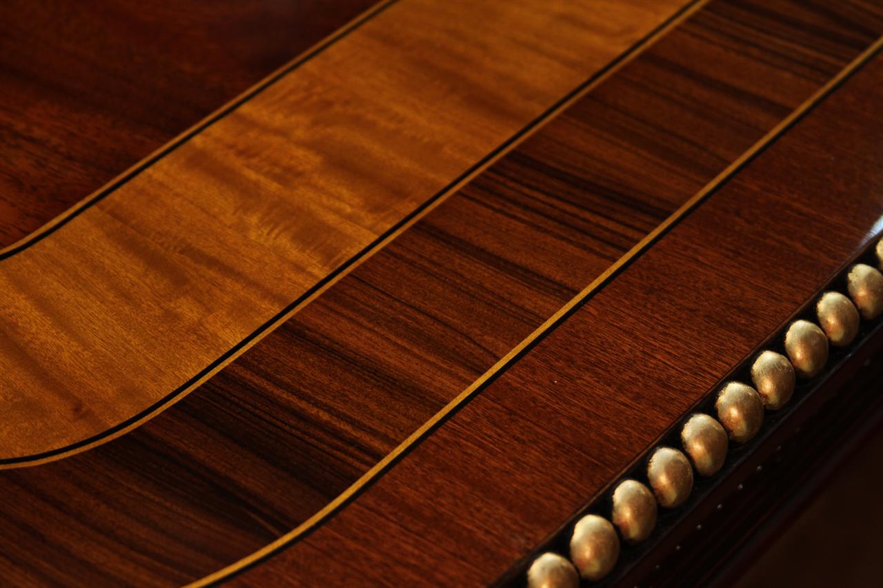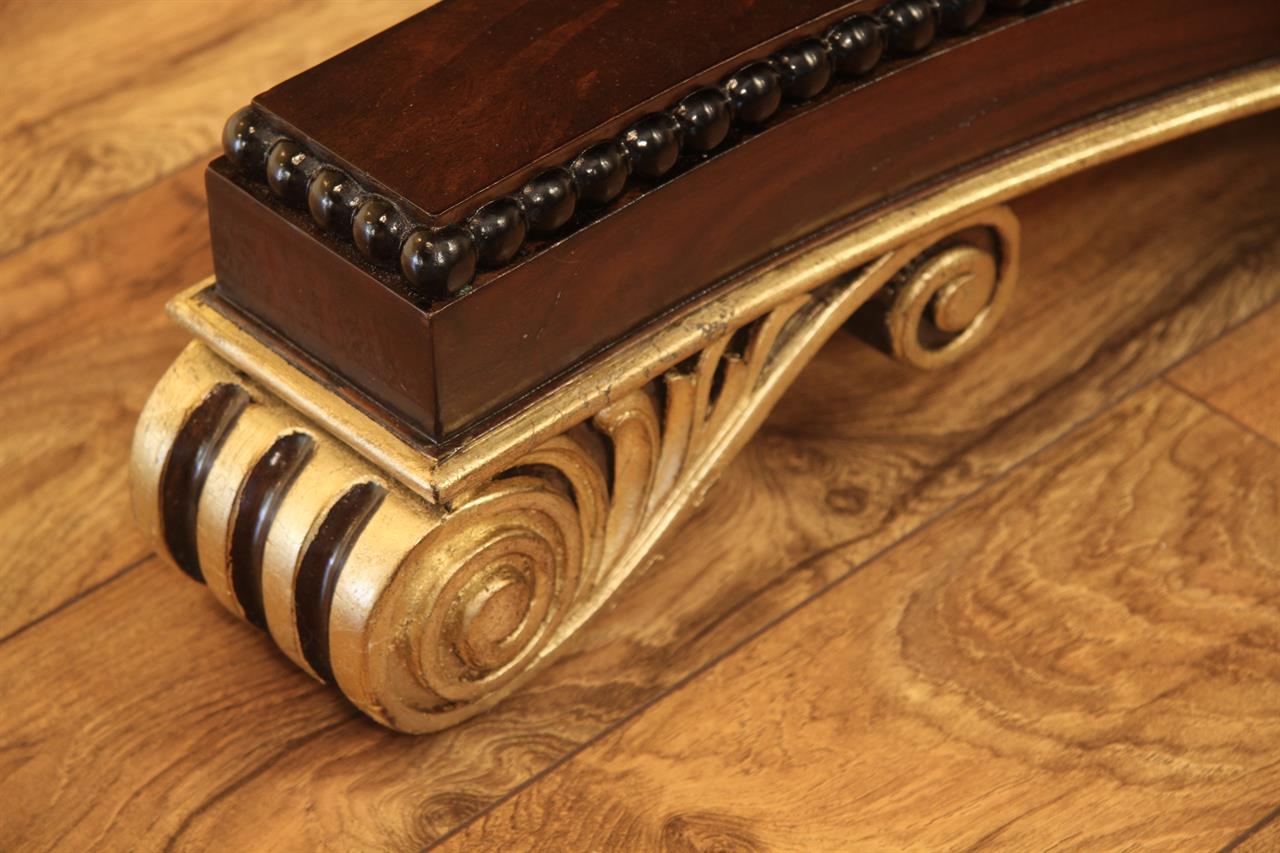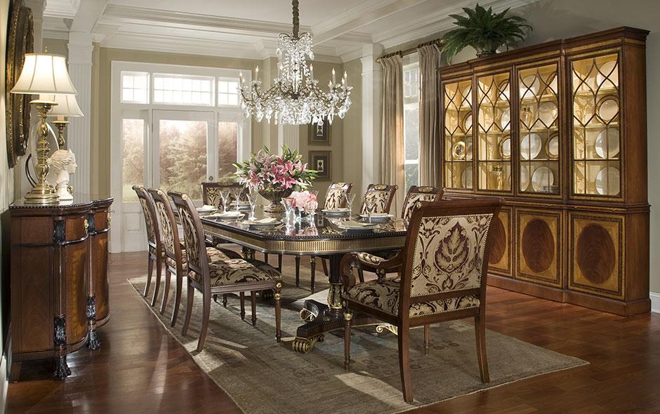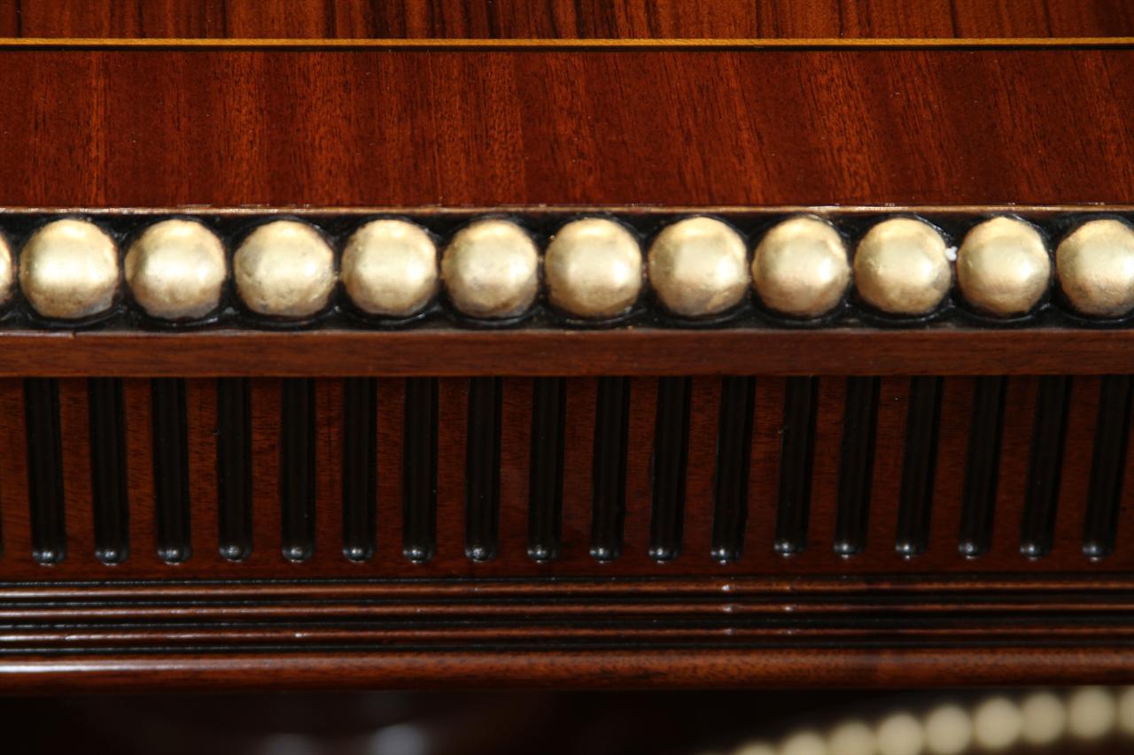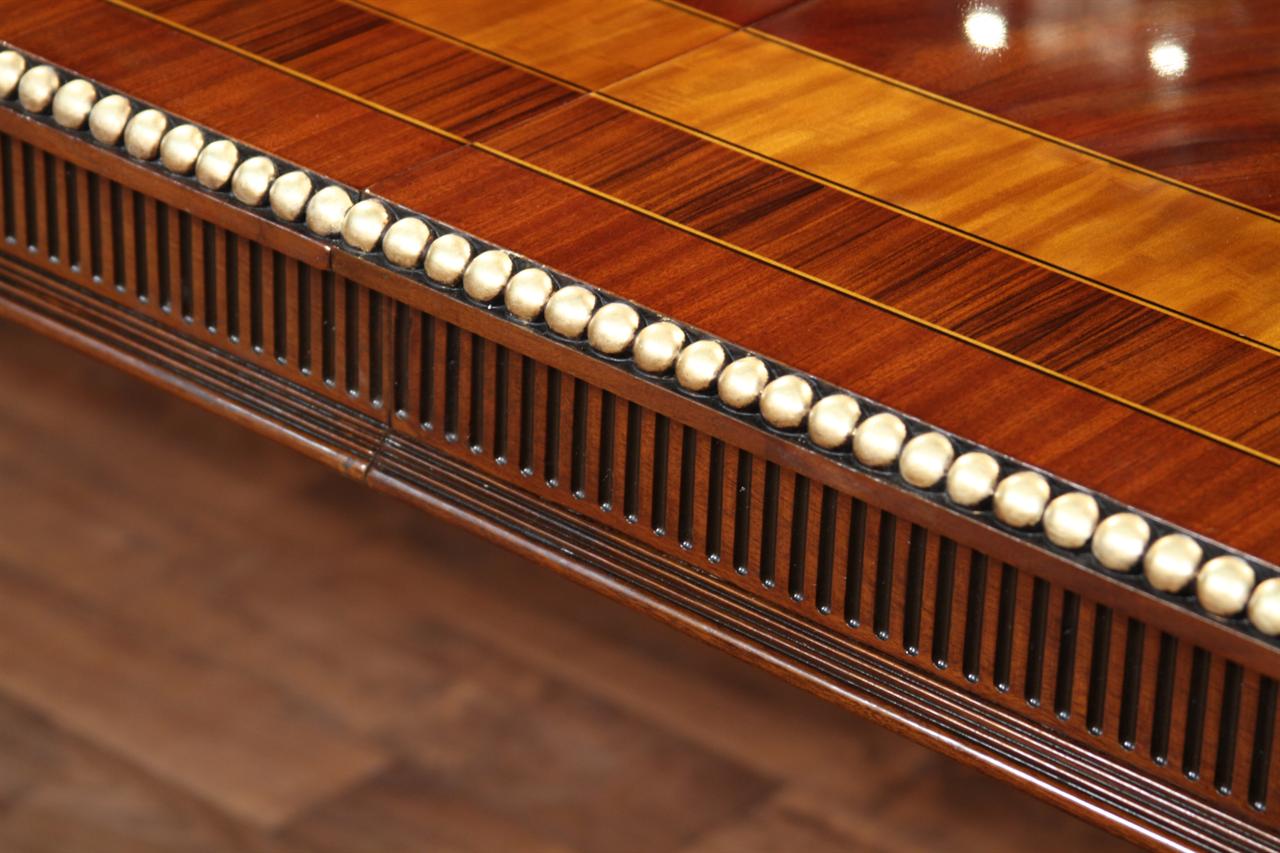 American Empire or Regency-style dining table. Extra wide (54-inch) mahogany dining table with robust carvings and details. A modern regency table fit for the higher-end home. This table starts at 89 inches long and can extend to 156 inches with three leaves or extensions. You can use one, two, or all three leaves. The table features an embellished apron, adding to its uniqueness. This table is finished in the USA. The tabletop has wide multi-banded satinwood, rosewood, and straight-grain mahogany inlays. The apron has round marble-sized carved edges and a fluted apron.