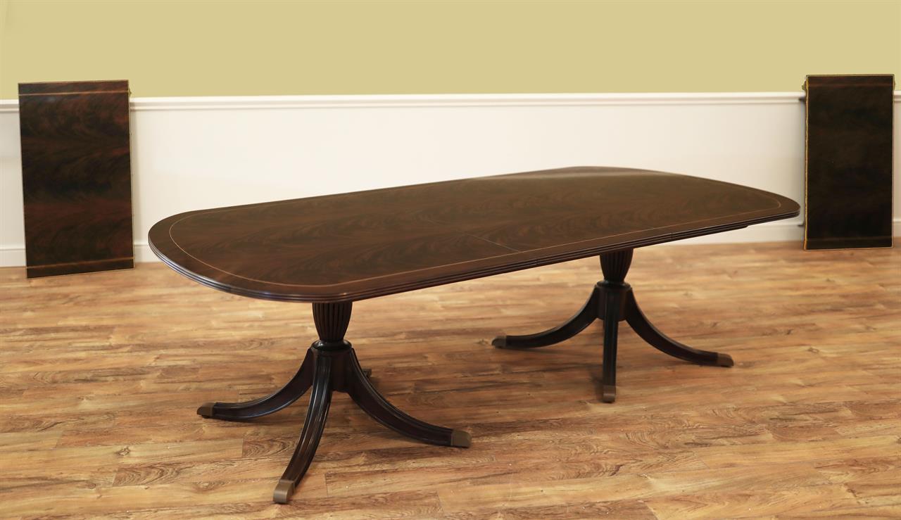 An exclusive double pedestal mahogany dining room table for seating up to 14 people. It has an unusually long-grain crotch mahogany field finished in a dark espresso brown color. This mahogany dining table sits on two sturdy Duncan Phyfe pedestals, which are capped with custom-forged brass caps, feet, and levelers. Table features a polished 90% sheen top for a rich, deep blackish-brown finish suitable for modern spaces. Measurements: 75″Wx47″Dx30″H, Table opens to 144″ with three leaves.
