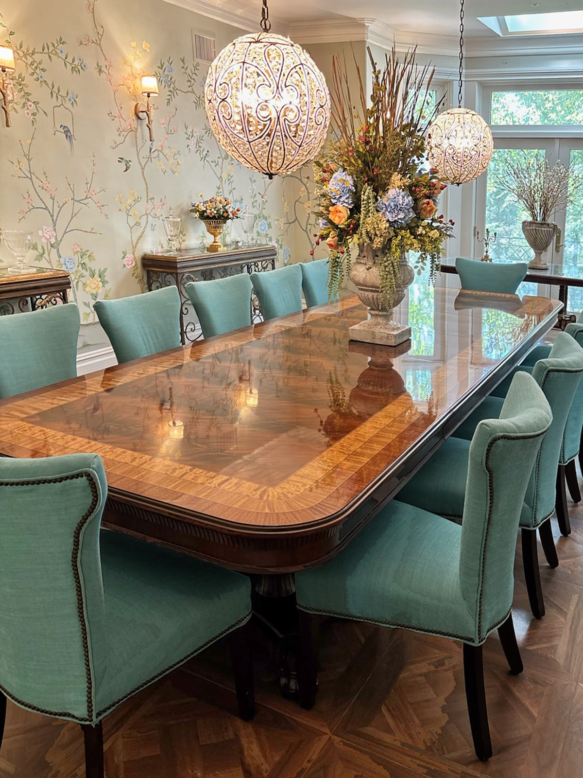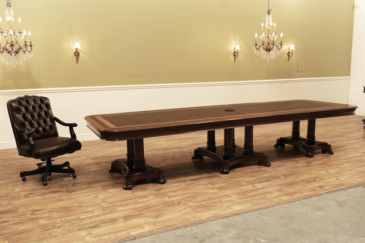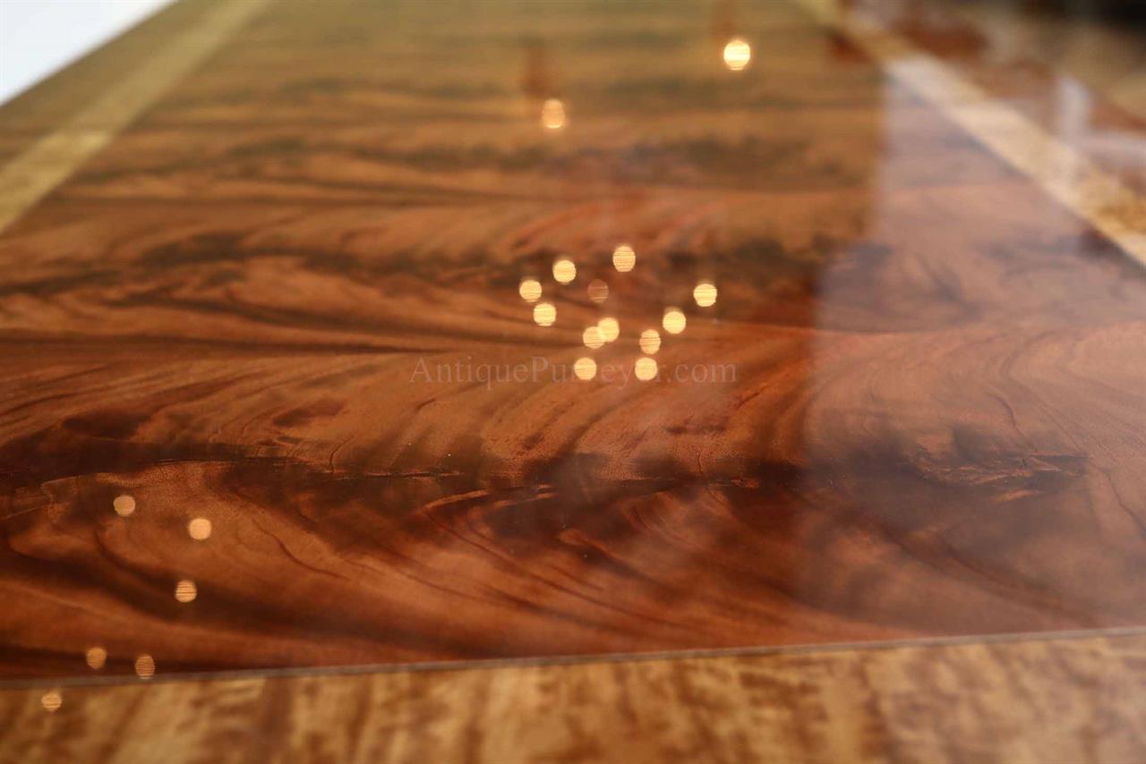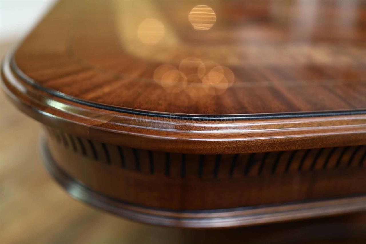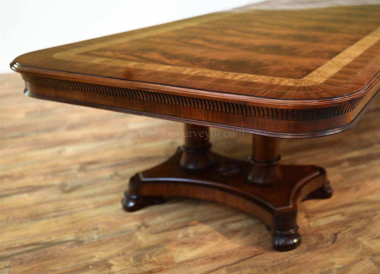 Large custom dining table. It is a large and wide inlaid mahogany dining table with bandings of rosewood, kingwood and satinwood. This high-end extension table features Regency inspired transitional pedestalbases which hold the table sturdier than any other Regency-style table on the market because of its two column design. Even under heavier loads, this table has no movement. Available with or without gold leaf accents. A unique inlaid mahogany dining table for the higher-end home.