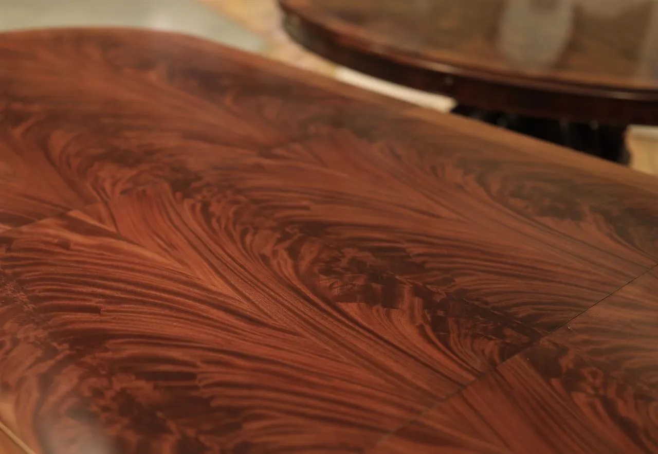 An exclusive double pedestal mahogany dining room table for seating up to 14 people. It has an unusually long-grain crotch mahogany field. This mahogany dining table sits on two sturdy Duncan Phyfe pedestals, which are capped with custom-forged brass caps, feet, and levelers. Traditional two-tone mahogany finish with lighter bleached mahogany border and fine black white separators. Measurements: 75″Wx47″Dx30″H, Table opens to 144″ with three leaves