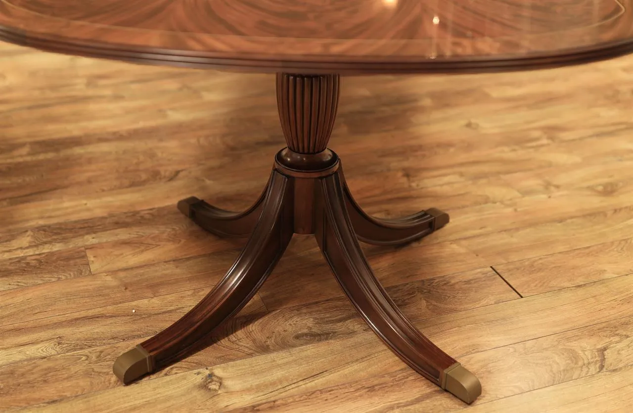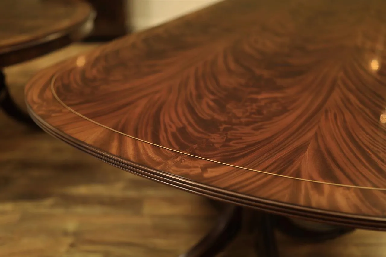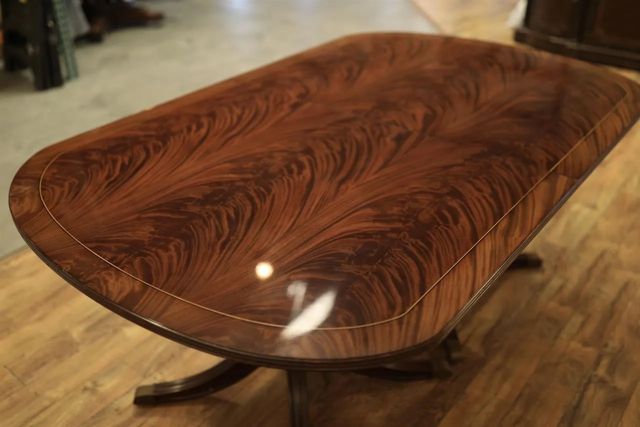 An exclusive double pedestal mahogany dining room table for seating up to 14 people. It has an unusually long-grain crotch mahogany field. This mahogany dining table sits on two sturdy Duncan Phyfe pedestals, which are capped with custom-forged brass caps, feet, and levelers. Traditional two-tone mahogany finish with lighter bleached mahogany border and fine black white separators. Measurements: 75″Wx47″Dx30″H, Table opens to 144″ with three leaves