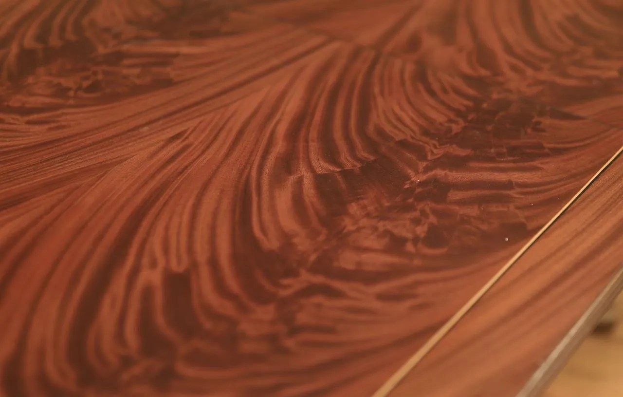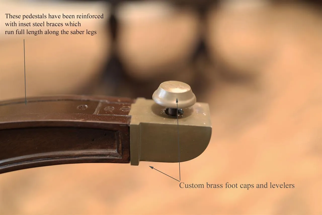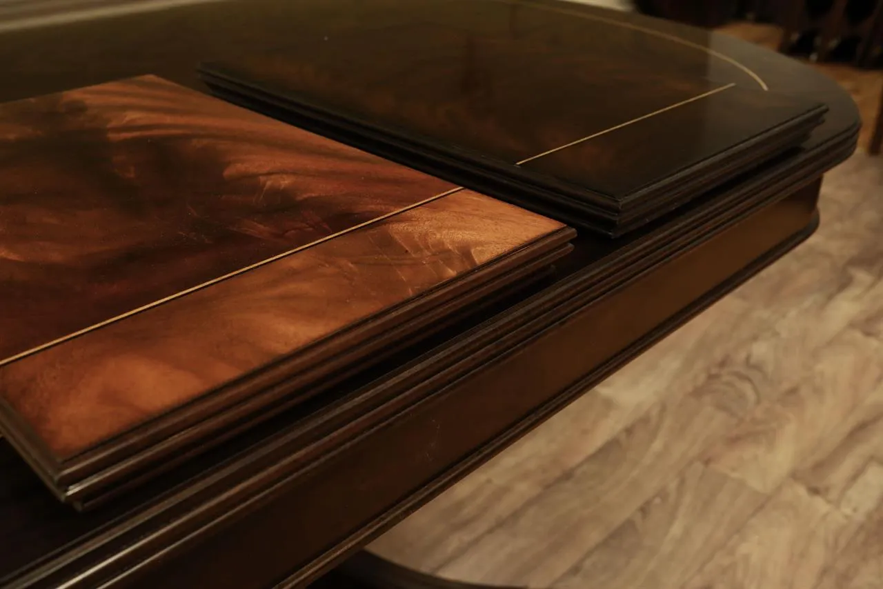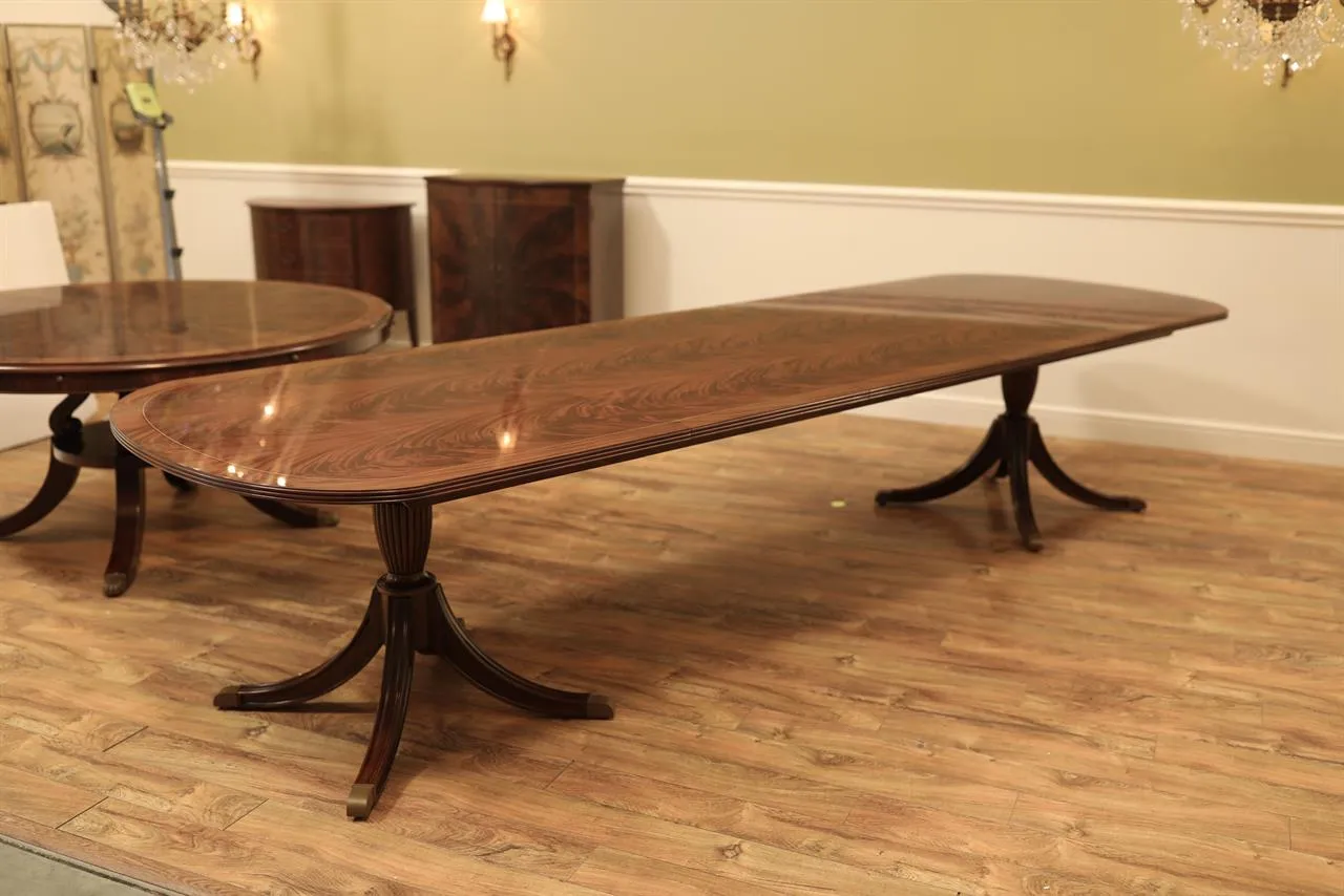 An exclusive double pedestal mahogany dining room table for seating up to 14 people. It has an unusually long-grain crotch mahogany field. This mahogany dining table sits on two sturdy Duncan Phyfe pedestals, which are capped with custom-forged brass caps, feet, and levelers. Traditional two-tone mahogany finish with lighter bleached mahogany border and fine black white separators. Measurements: 75″Wx47″Dx30″H, Table opens to 144″ with three leaves