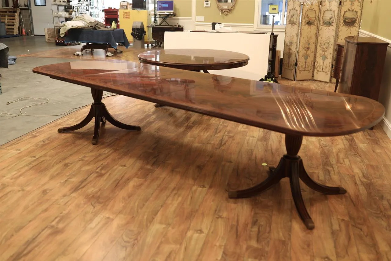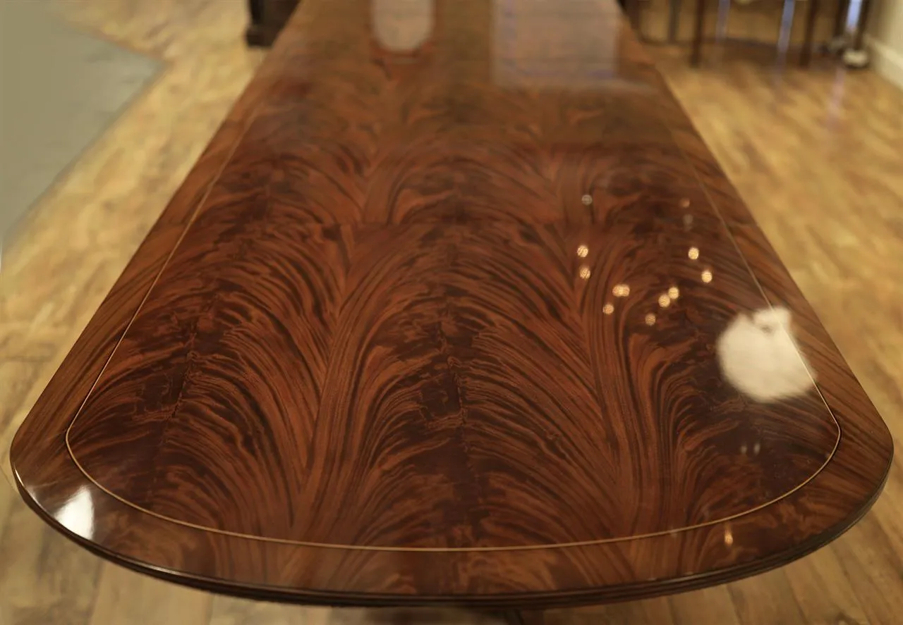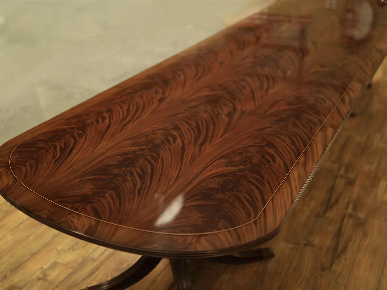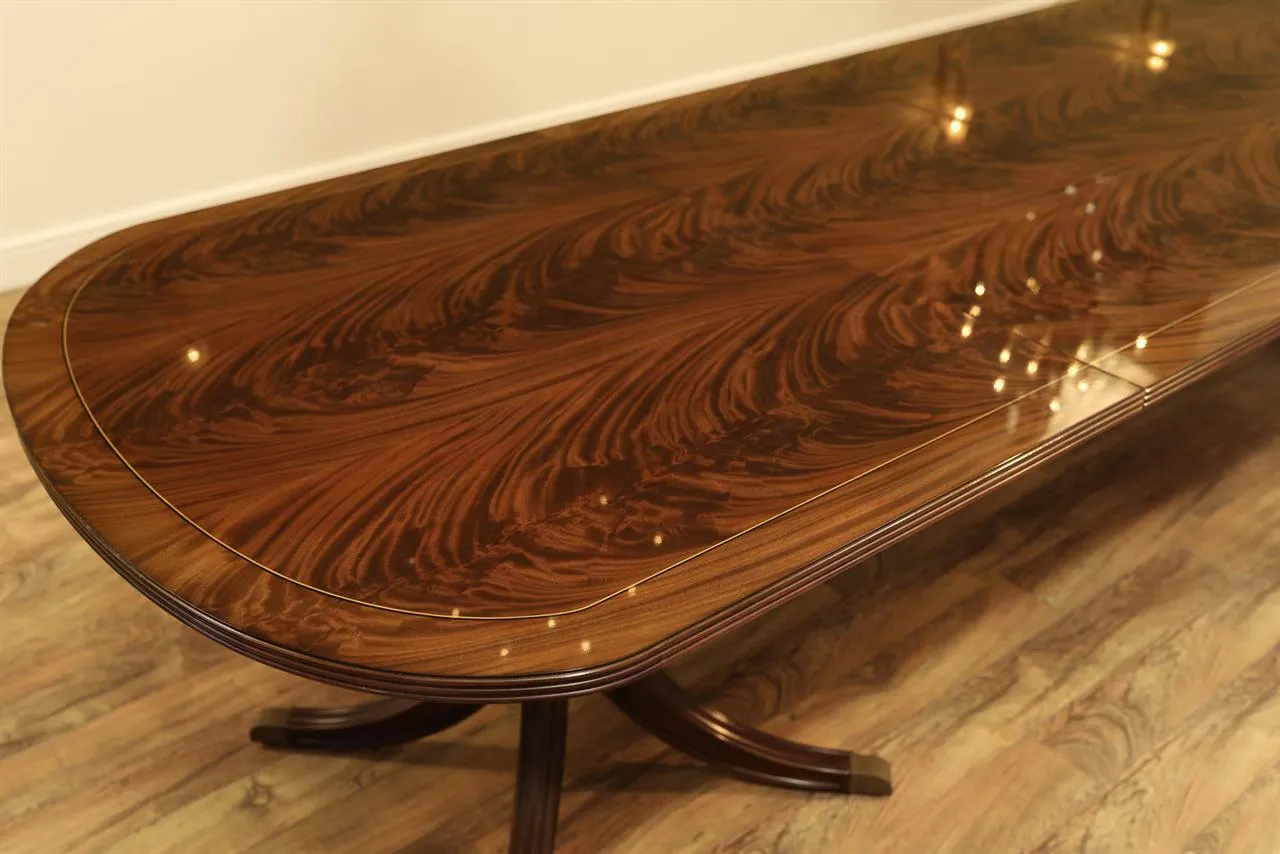 An exclusive double pedestal mahogany dining room table for seating up to 14 people. It has an unusually long-grain crotch mahogany field. This mahogany dining table sits on two sturdy Duncan Phyfe pedestals, which are capped with custom-forged brass caps, feet, and levelers. Traditional two-tone mahogany finish with lighter bleached mahogany border and fine black white separators. Measurements: 75″Wx47″Dx30″H, Table opens to 144″ with three leaves