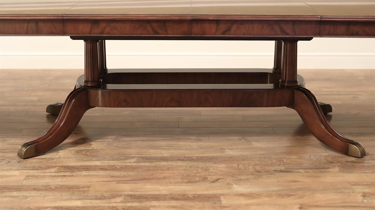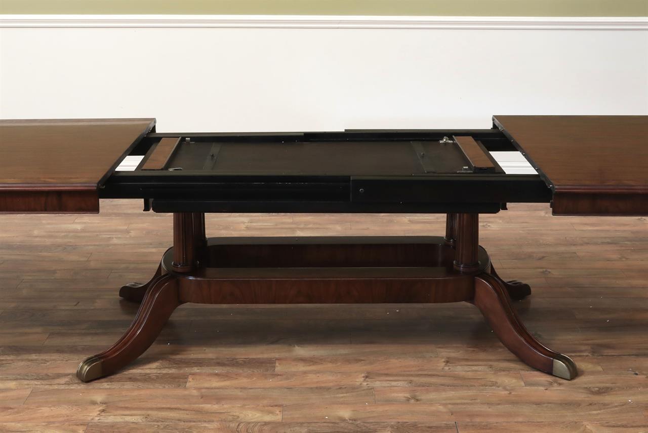 Extending mahogany wood dining room table by Theodore Alexander and Stephen Church. This table comes with two 24″ self-storing leaves, all in a Hyedua Crown veneer. Sits on a long pedestal with solid brass-capped feet. Measurements: W100″-148″xD54″xH30″.