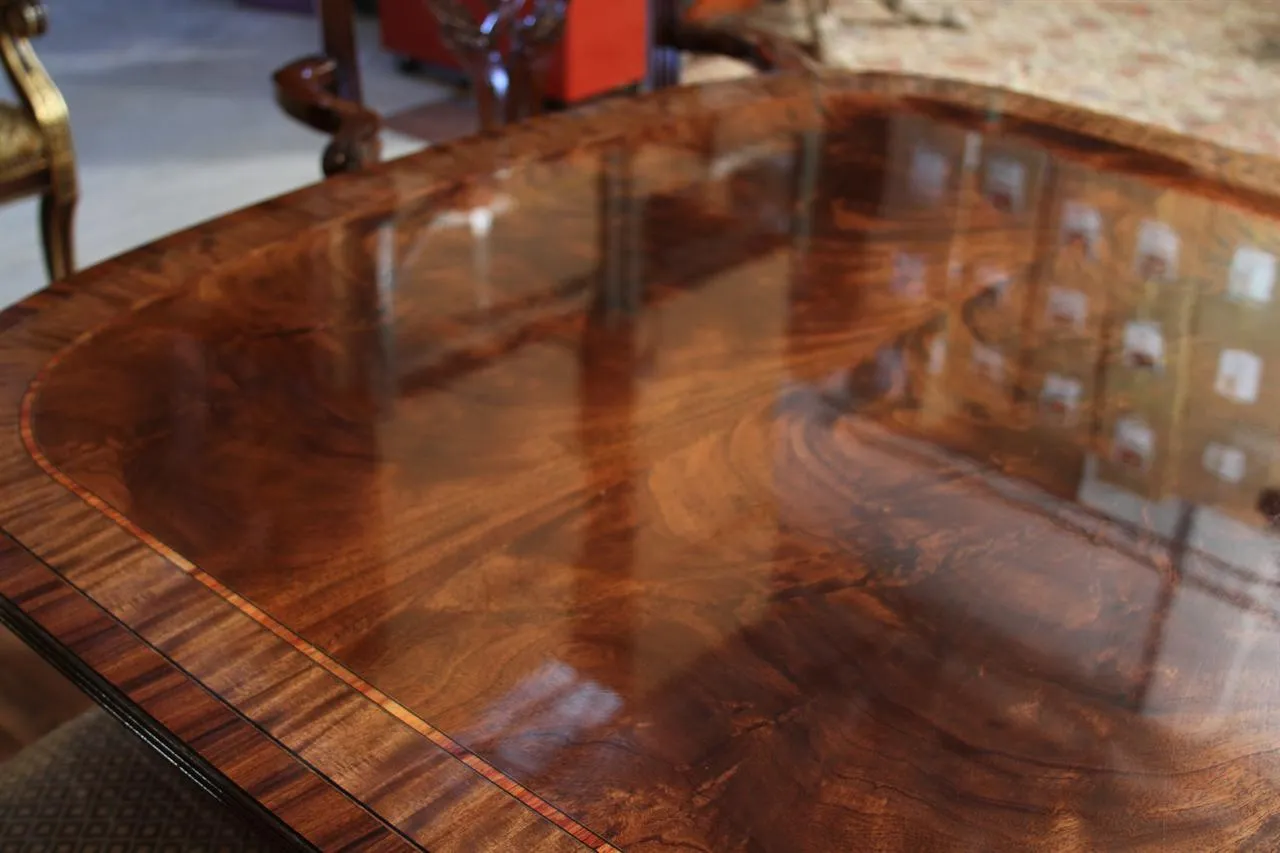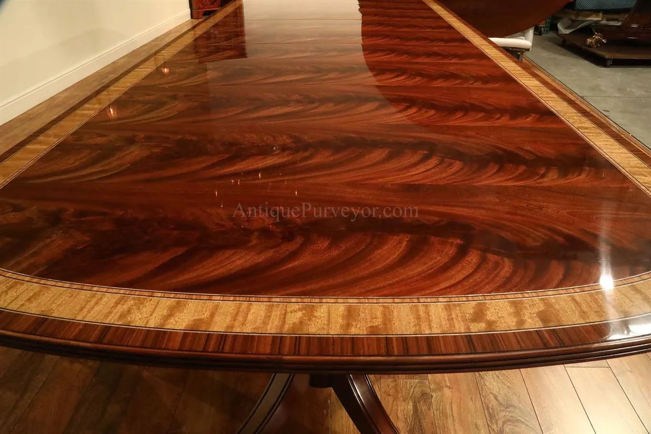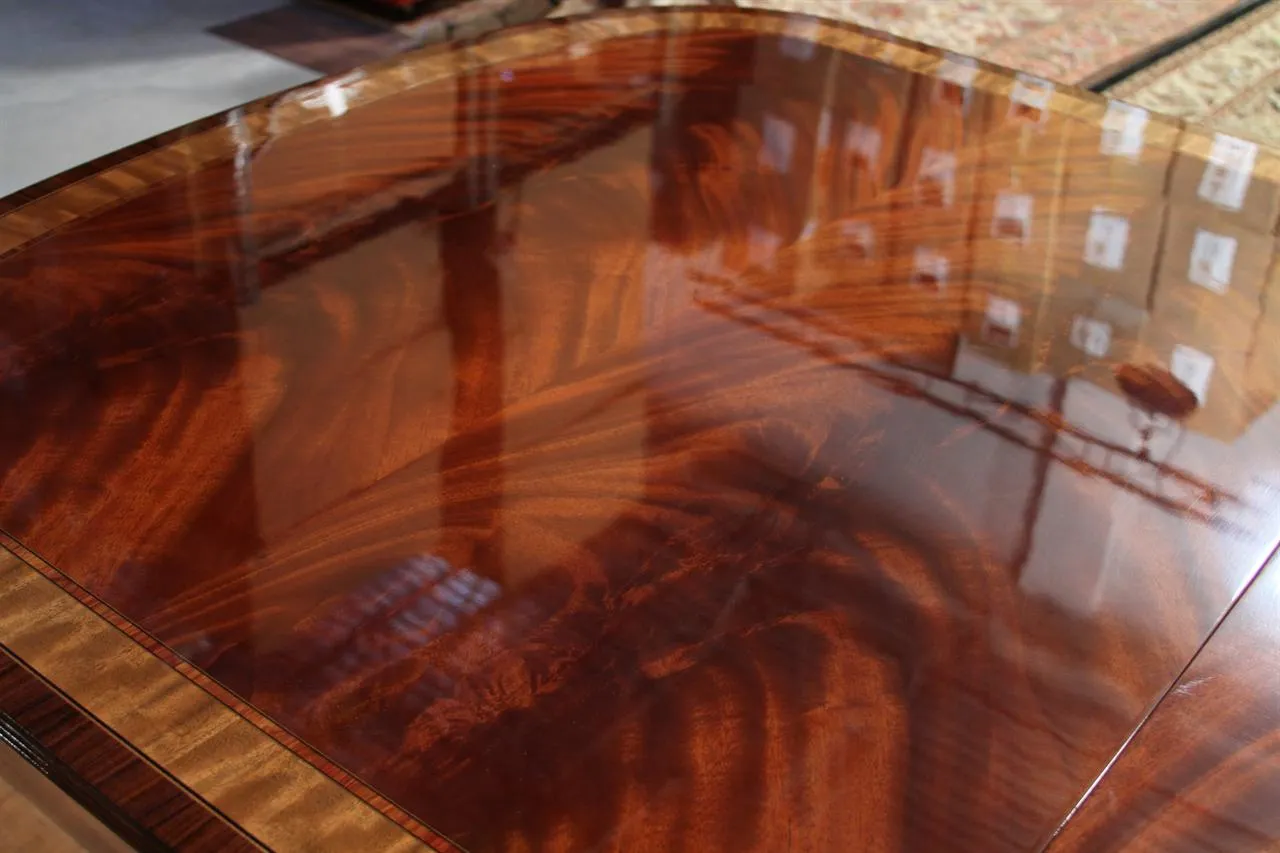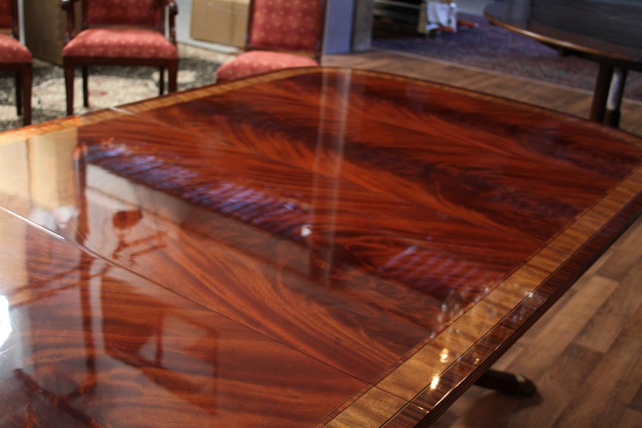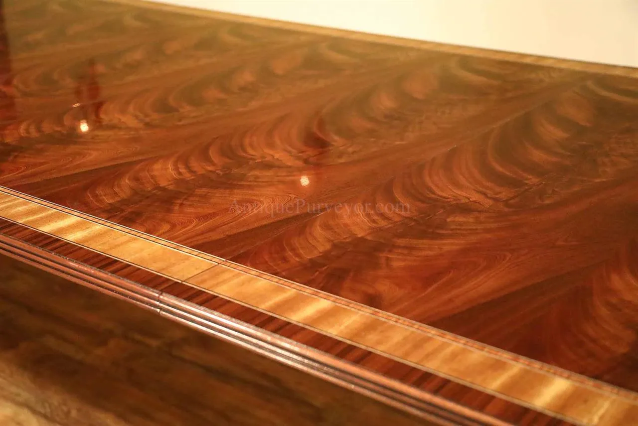 Mahogany dining table with 3 leaves. This is a 12-foot dining table that seats 14 people with three leaves. This table features a flame mahogany field with primavera, tulipwood, and rosewood inlays. This table has a natural mahogany finish with cherry tones, a reeded edge, Duncan Phyfe four-leg pedestals, and a razor-thin polished nitrocellulose finish. Measurements: 76″Wx48″Dx30″H and three leaves open to the table to 142″ total