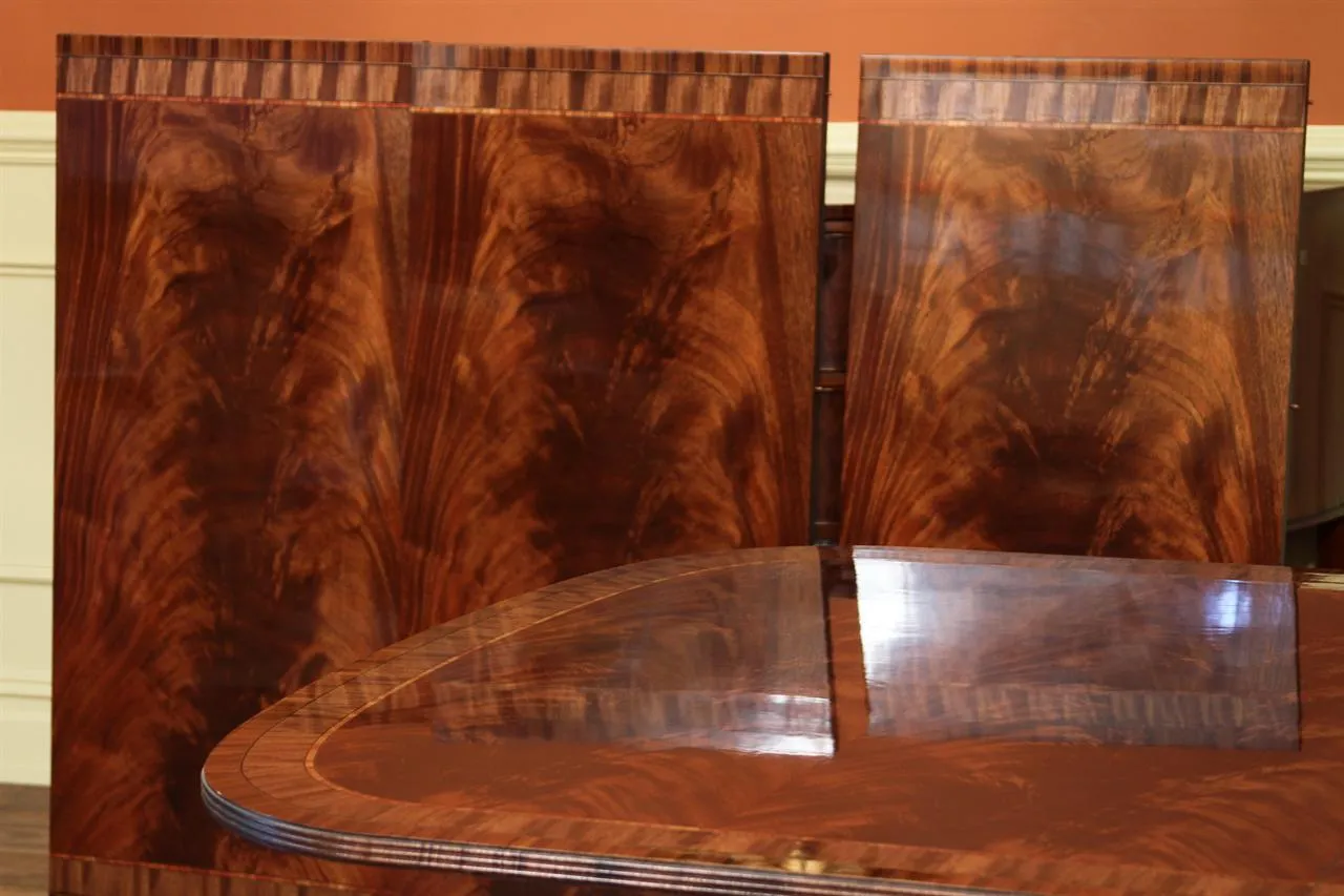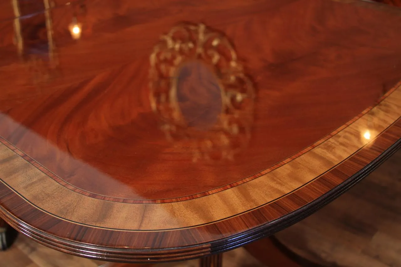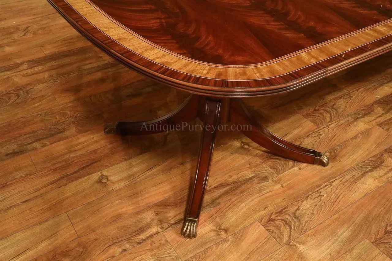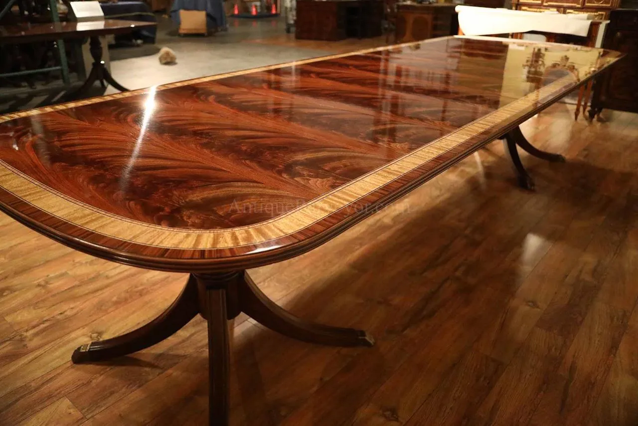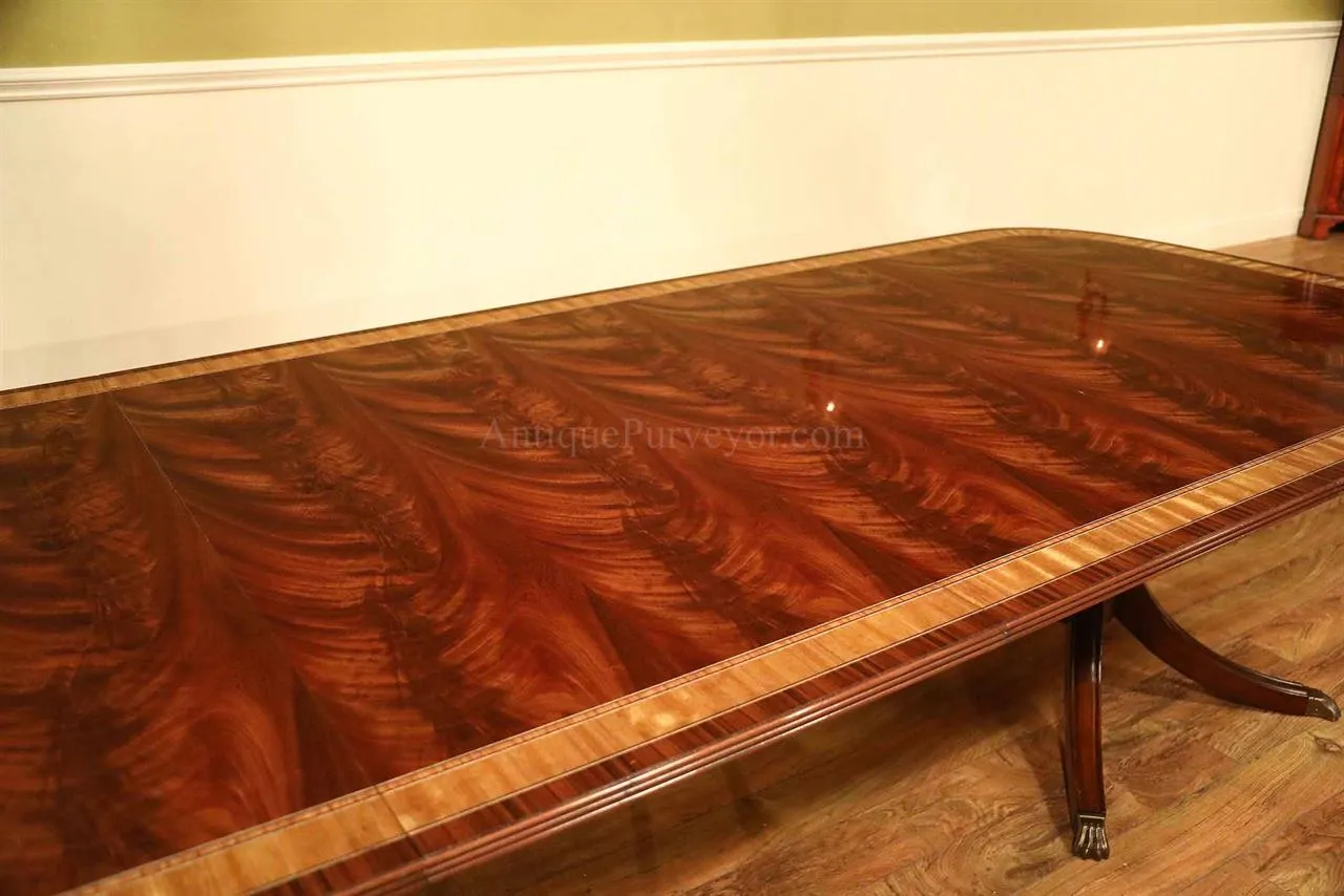 Mahogany dining table with 3 leaves. This is a 12-foot dining table that seats 14 people with three leaves. This table features a flame mahogany field with primavera, tulipwood, and rosewood inlays. This table has a natural mahogany finish with cherry tones, a reeded edge, Duncan Phyfe four-leg pedestals, and a razor-thin polished nitrocellulose finish. Measurements: 76″Wx48″Dx30″H and three leaves open to the table to 142″ total