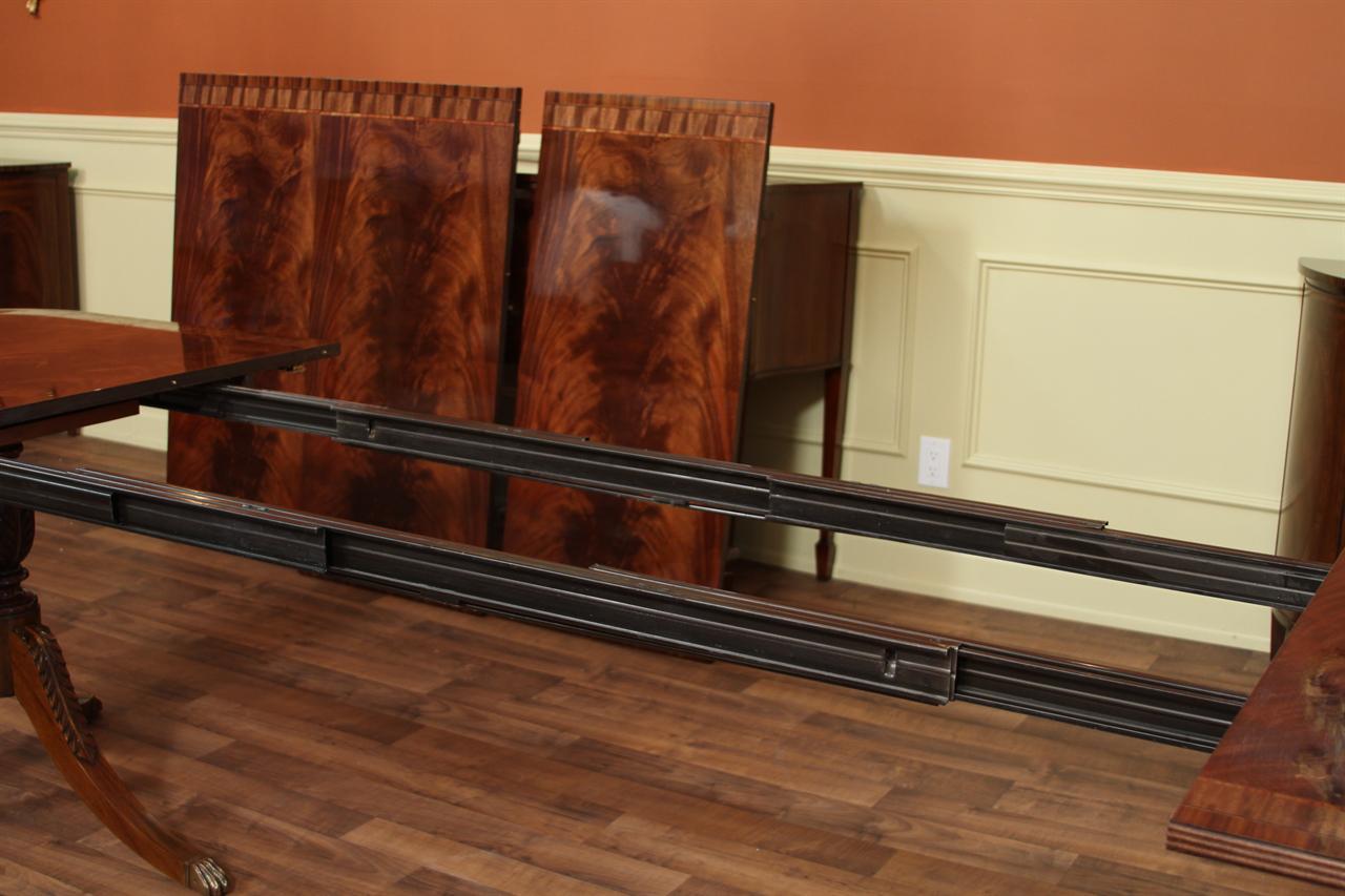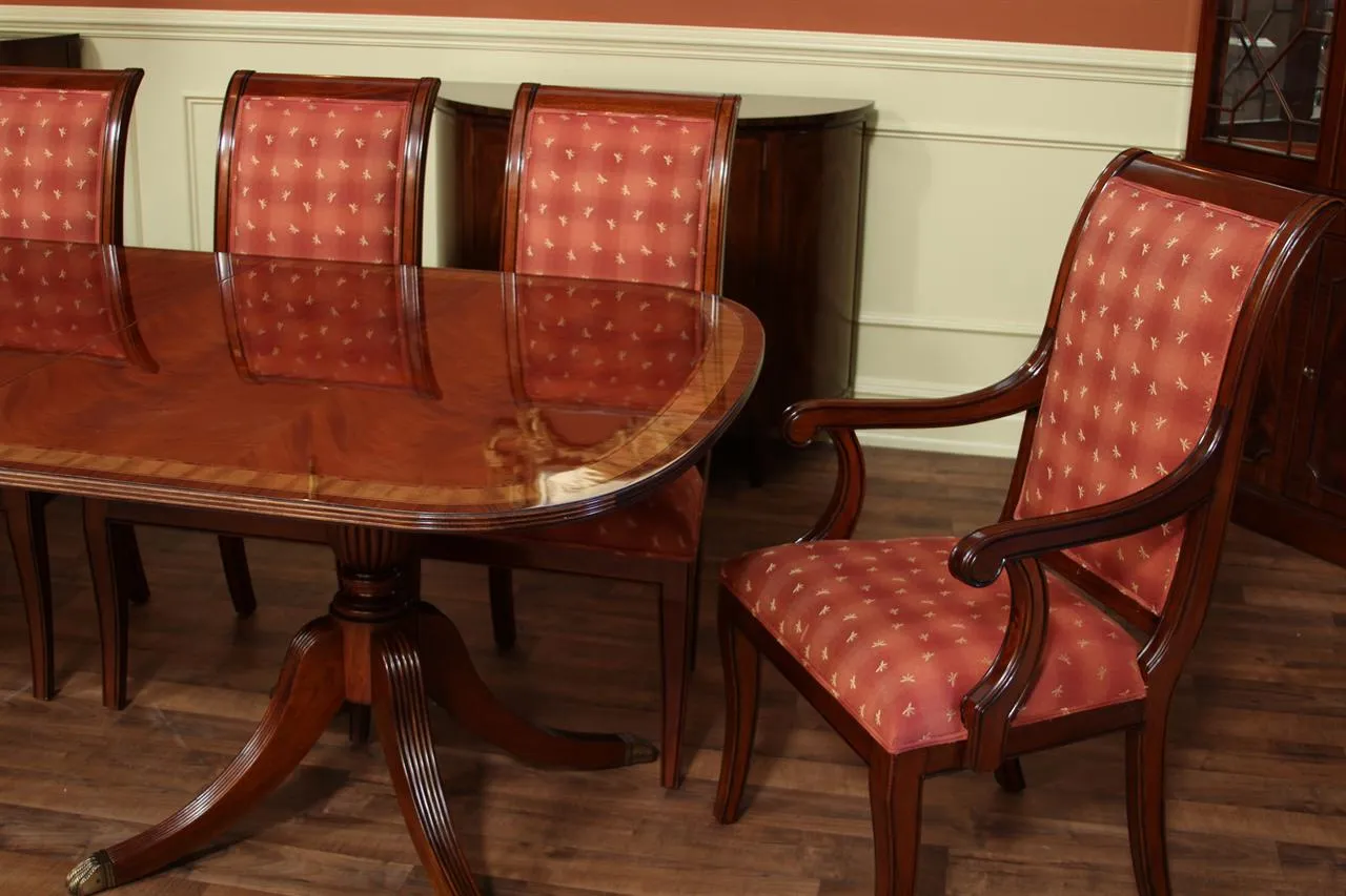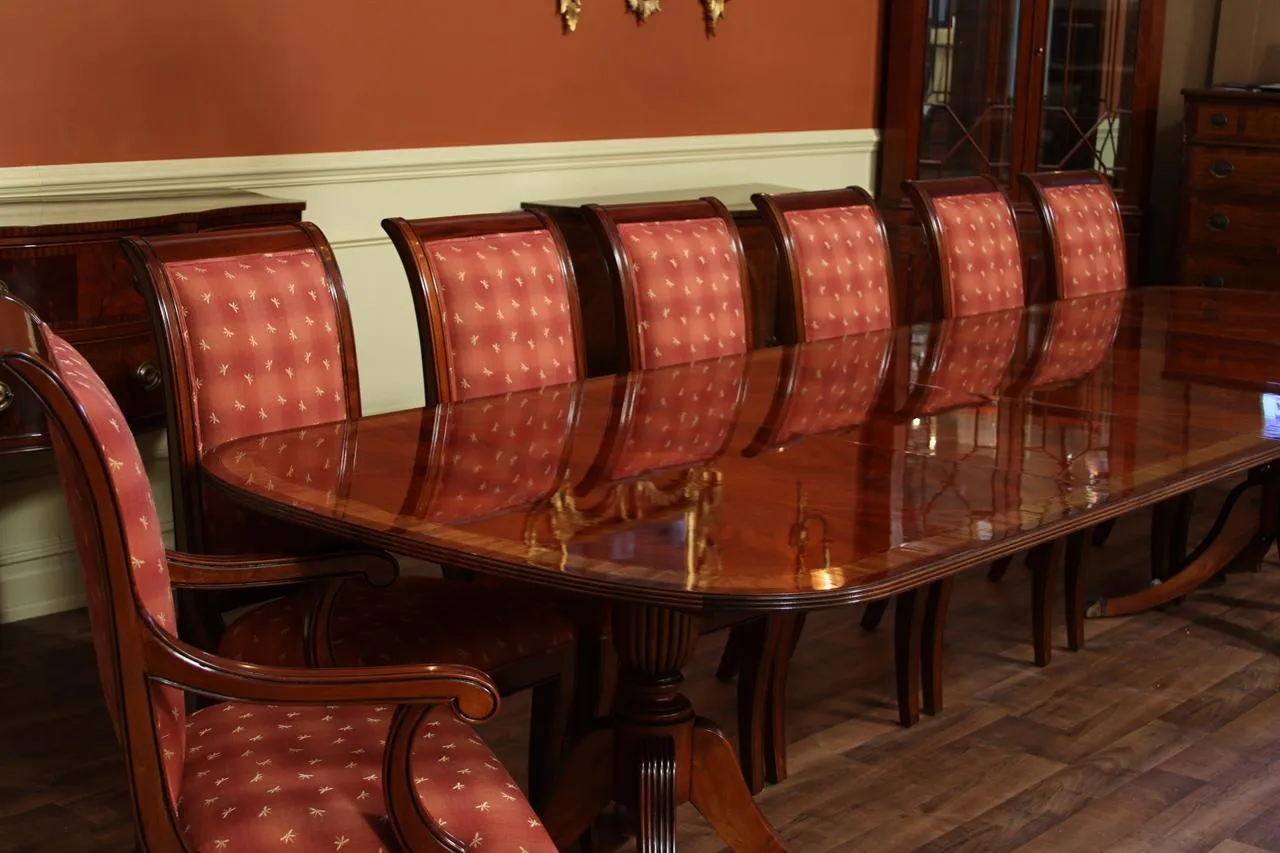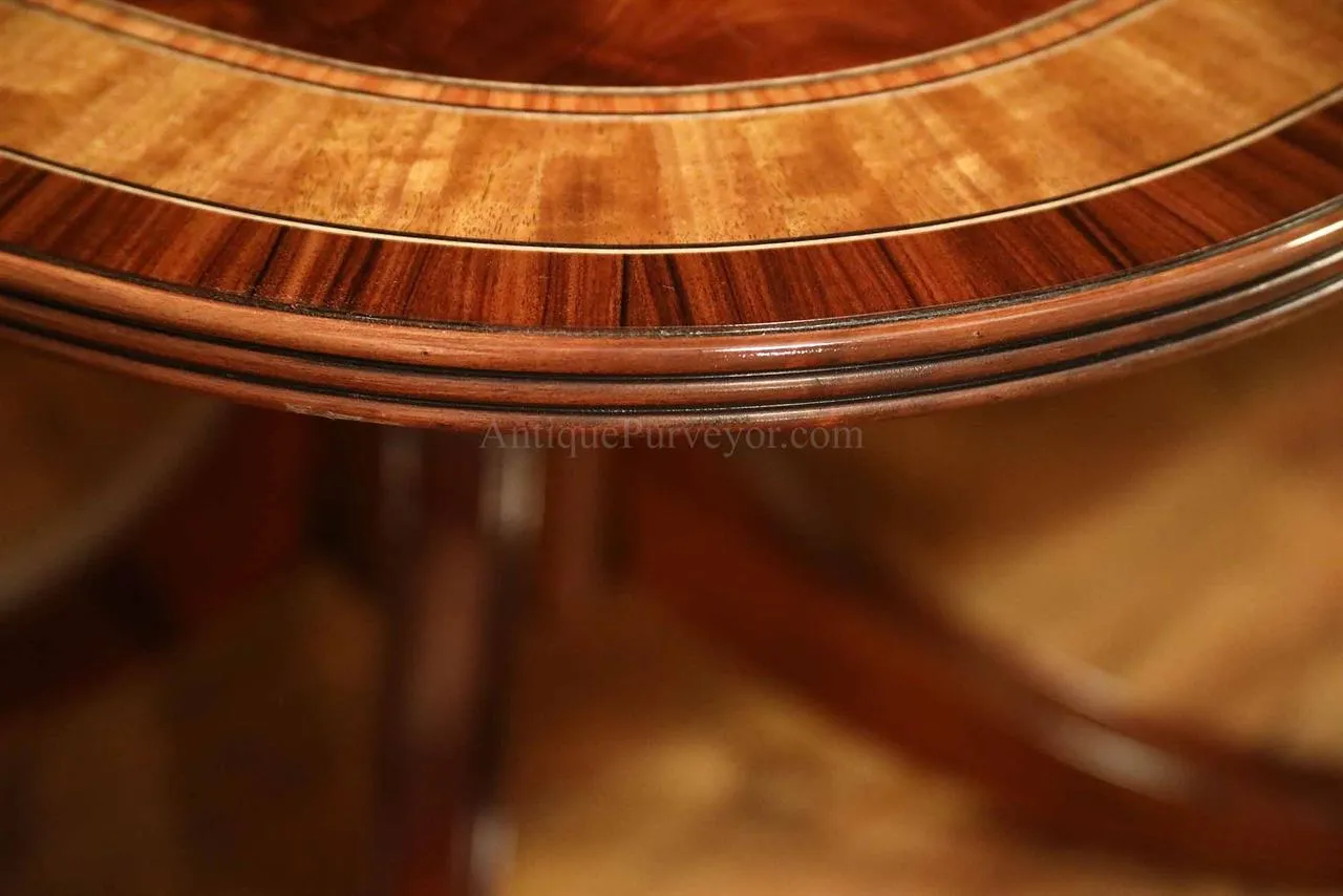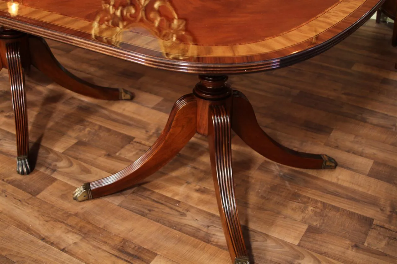 Mahogany dining table with 3 leaves. This is a 12-foot dining table that seats 14 people with three leaves. This table features a flame mahogany field with primavera, tulipwood, and rosewood inlays. This table has a natural mahogany finish with cherry tones, a reeded edge, Duncan Phyfe four-leg pedestals, and a razor-thin polished nitrocellulose finish. Measurements: 76″Wx48″Dx30″H and three leaves open to the table to 142″ total