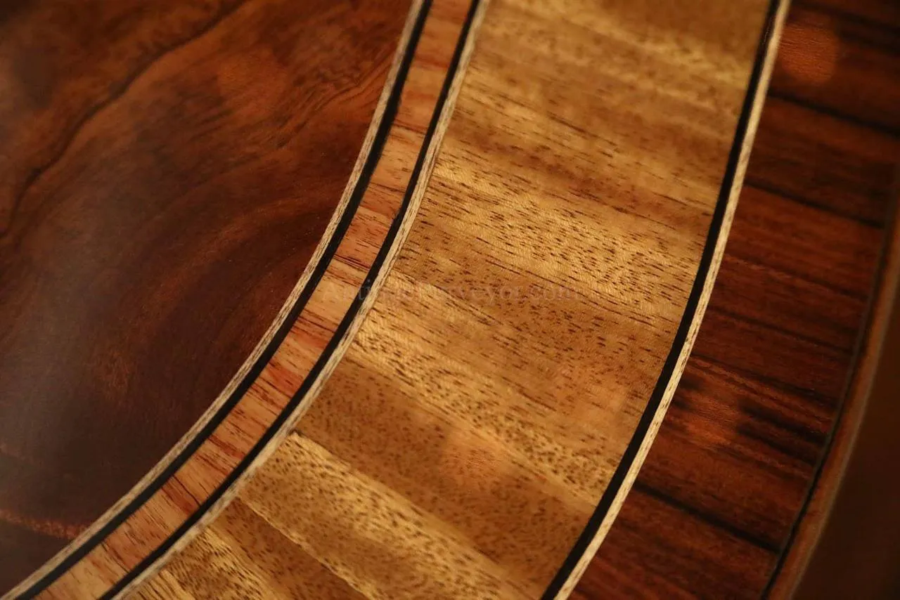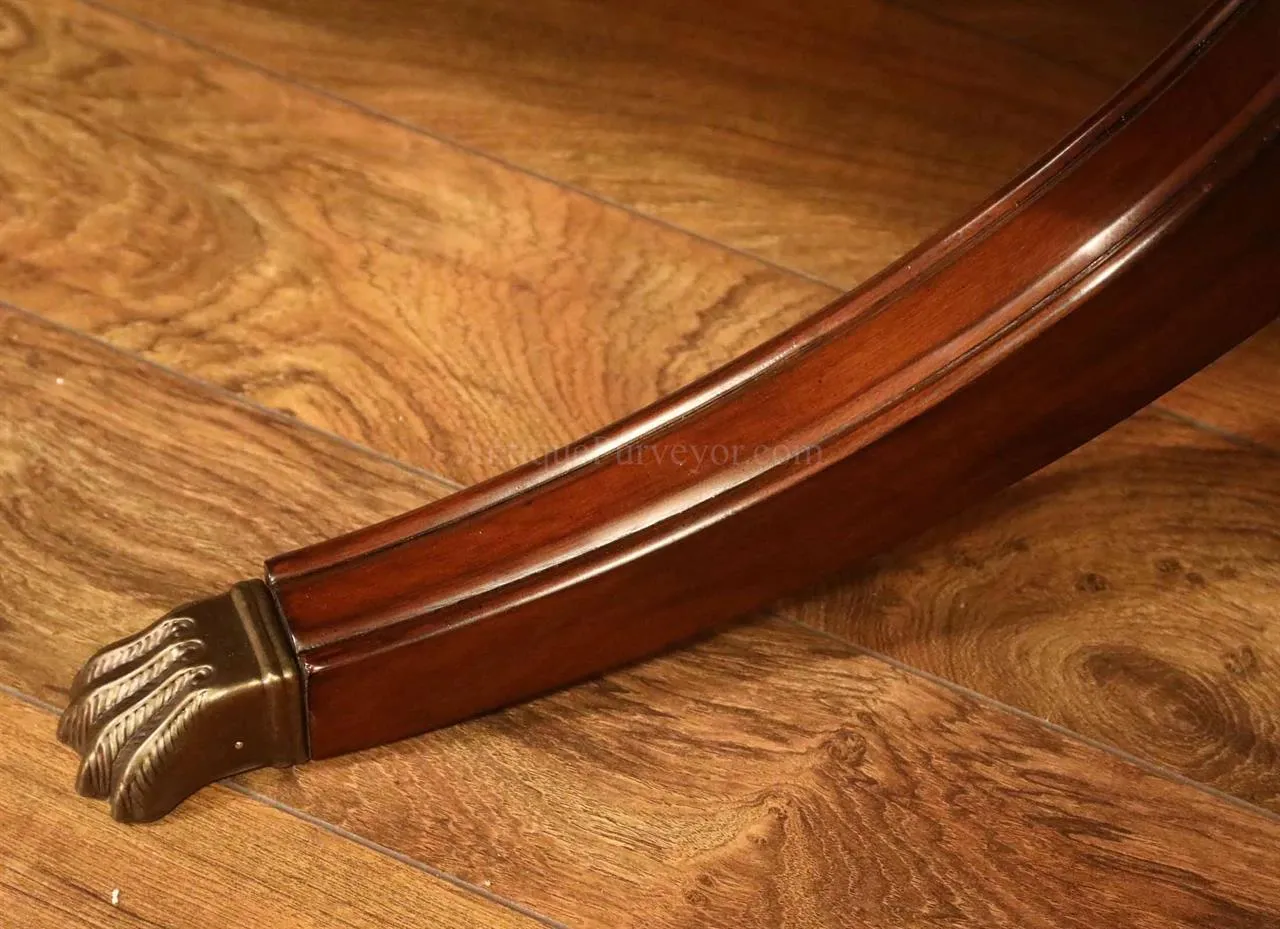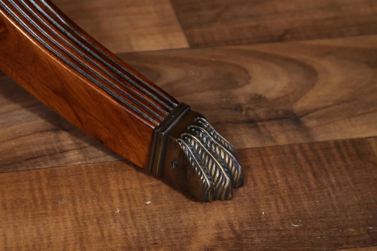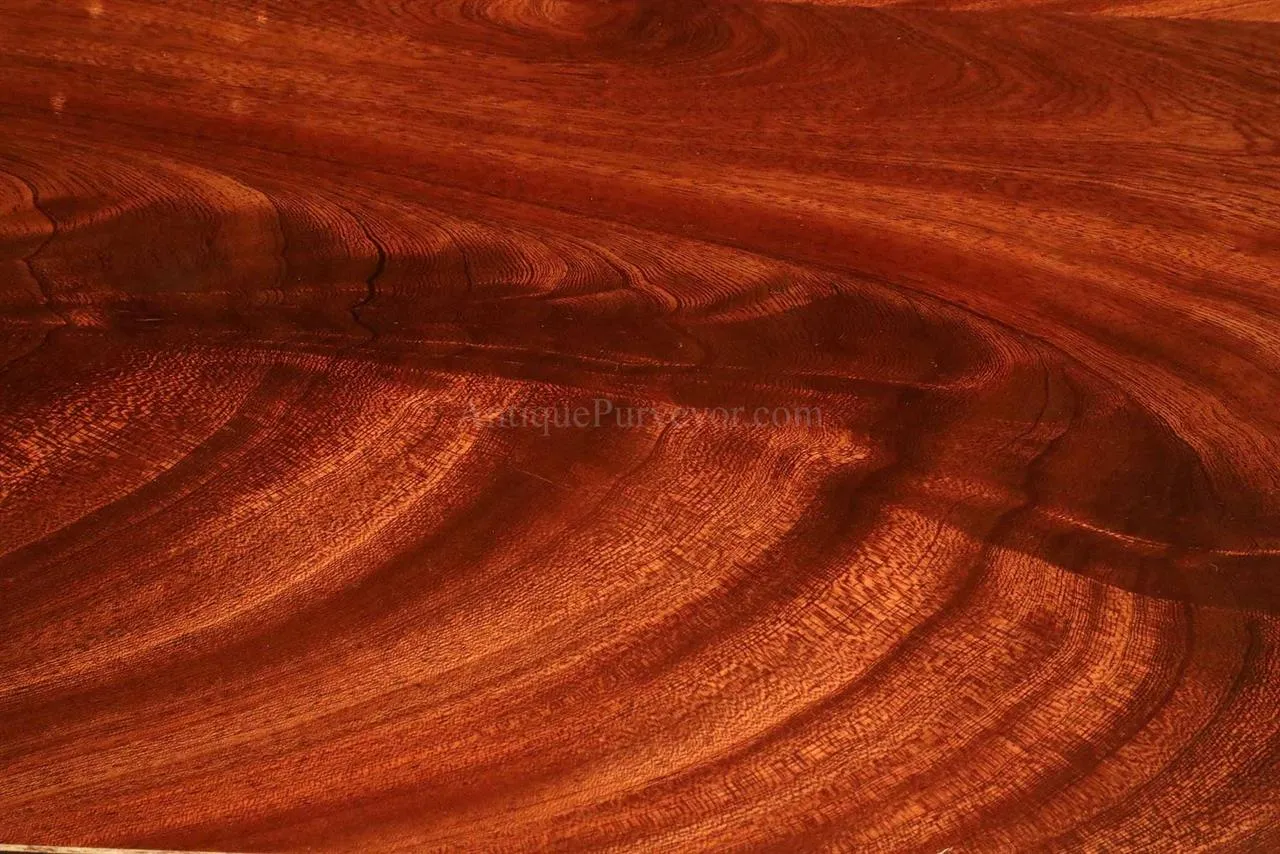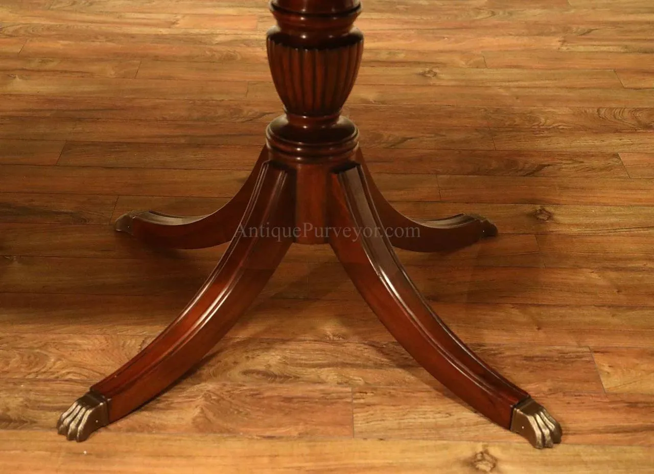 Mahogany dining table with 3 leaves. This is a 12-foot dining table that seats 14 people with three leaves. This table features a flame mahogany field with primavera, tulipwood, and rosewood inlays. This table has a natural mahogany finish with cherry tones, a reeded edge, Duncan Phyfe four-leg pedestals, and a razor-thin polished nitrocellulose finish. Measurements: 76″Wx48″Dx30″H and three leaves open to the table to 142″ total