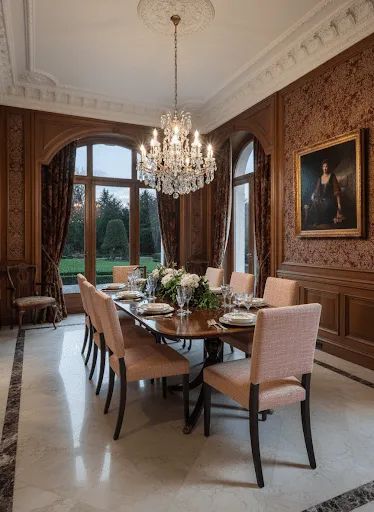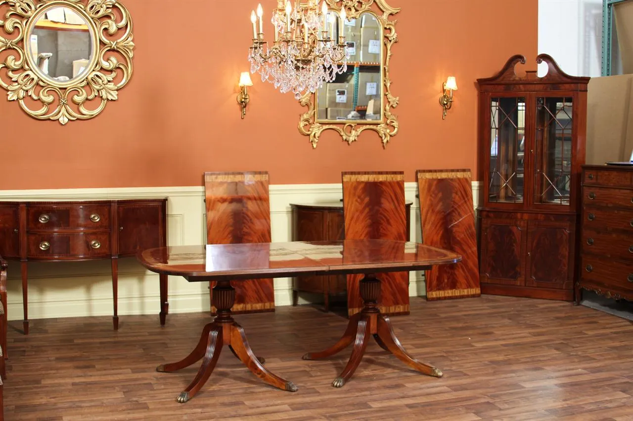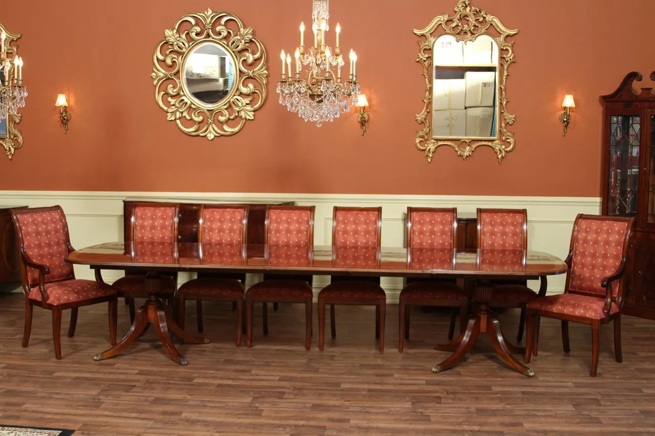 Home » Dining Room » High end mahogany dining table on solid mahogany pedestals with bright natural mahogany finish.