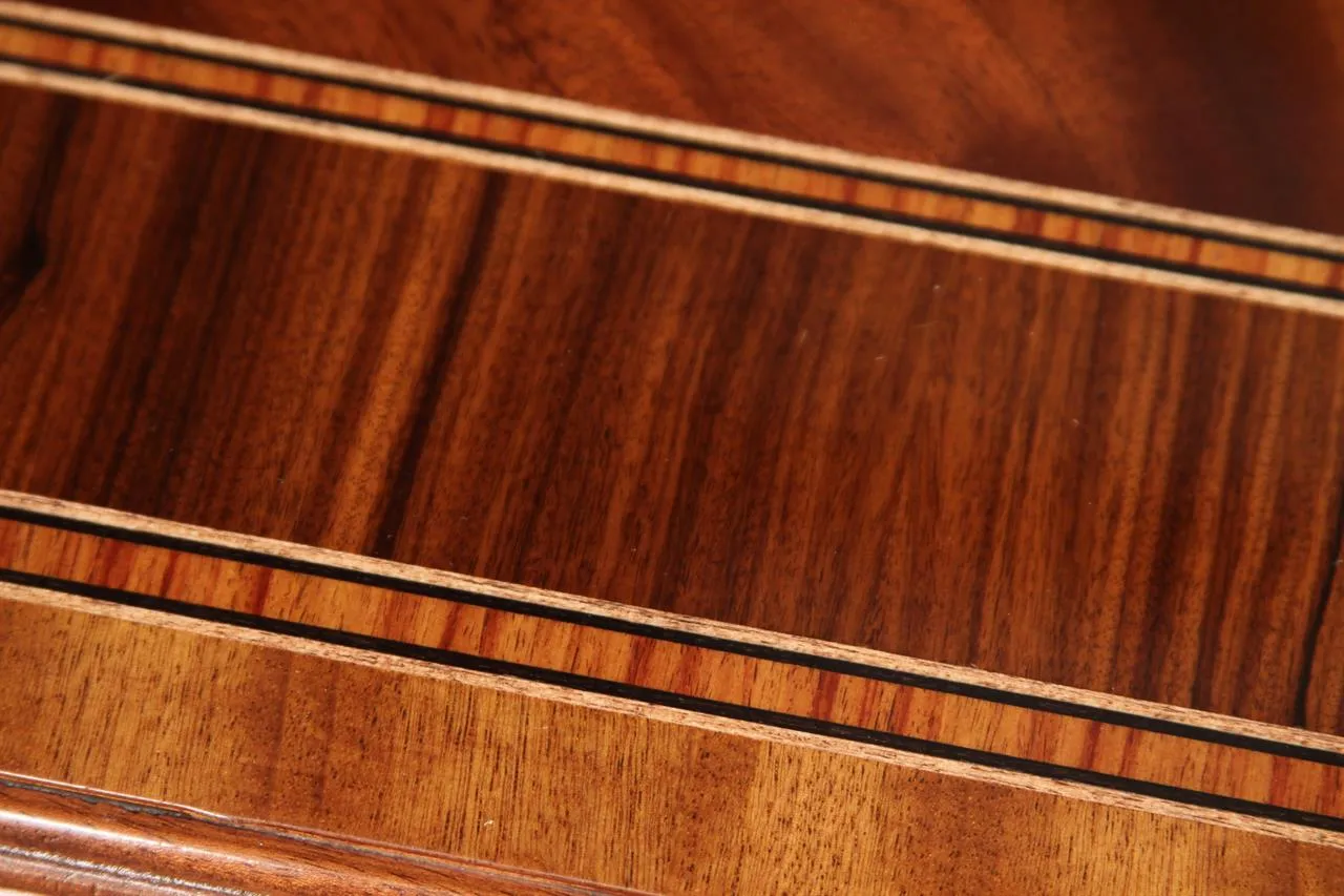 Extra-long 14-foot banquet table with flame mahogany and primavera bandings. This model table will give you everything you need for large family dinners. It opens to 14 feet. It has three large leaves. The table is sturdy and the slides are American steel. It is a high-end and sturdy table and will not sag with leaves in place. The apron runs around the entire table and leaves. The finish on this table is clear and polished to a 70-80% sheen. The glossy sheen allows light to reach the flame mahogany grain which comes to life when you walk around the table. 14-foot tables are usually built wide, however, this table features a narrow width of only 48 inches which makes this table a great consideration for those who want length without the extra width.