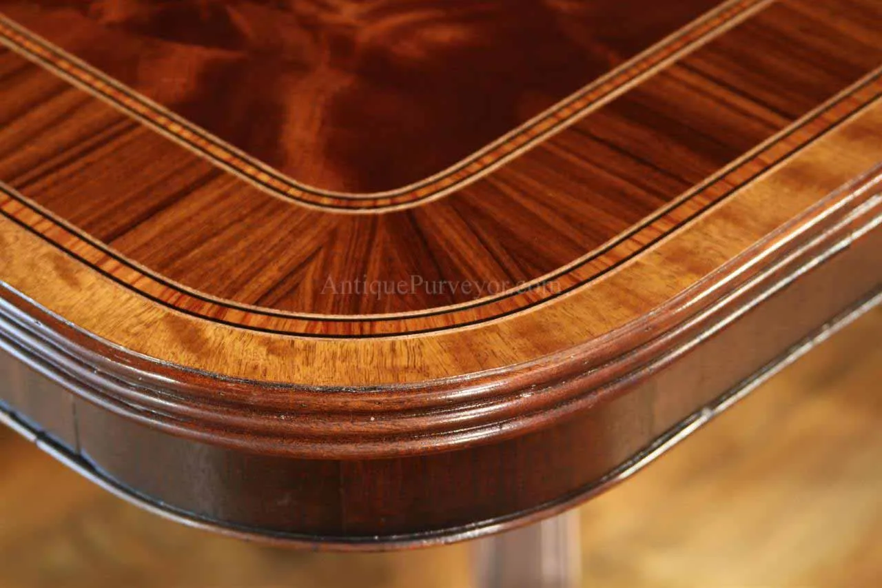 Home » Dining Room » Large 14 foot banquet table finished in the USA. Narrow and long inlaid mahogany dining table. Sits on birdcage style pedestals