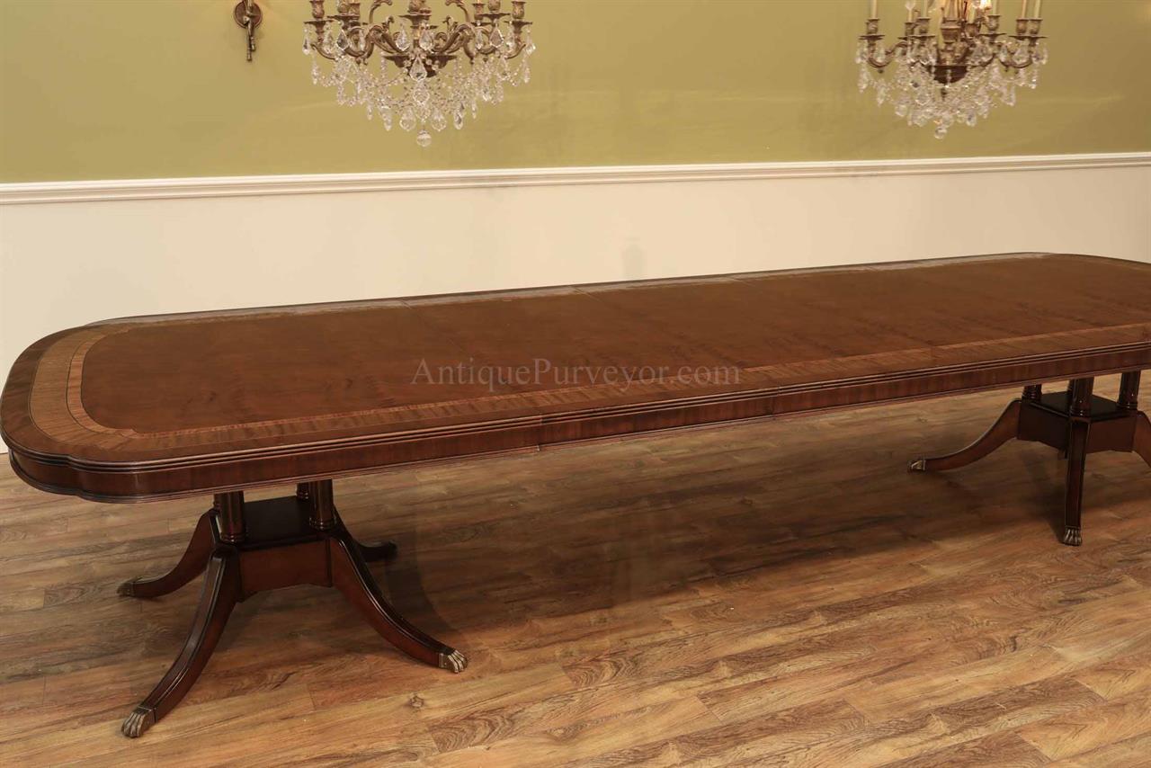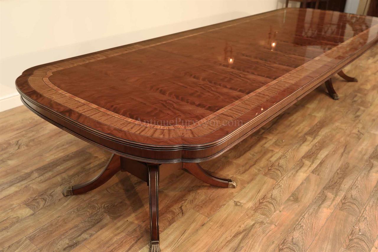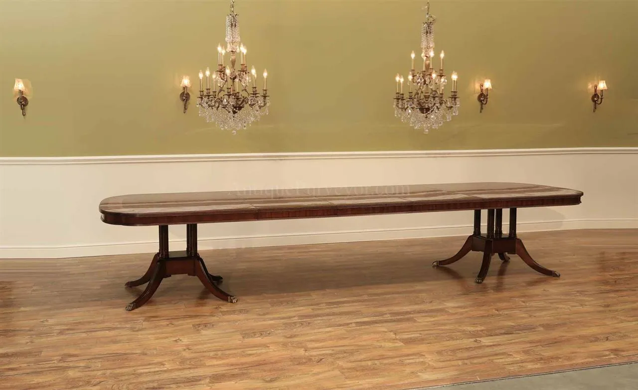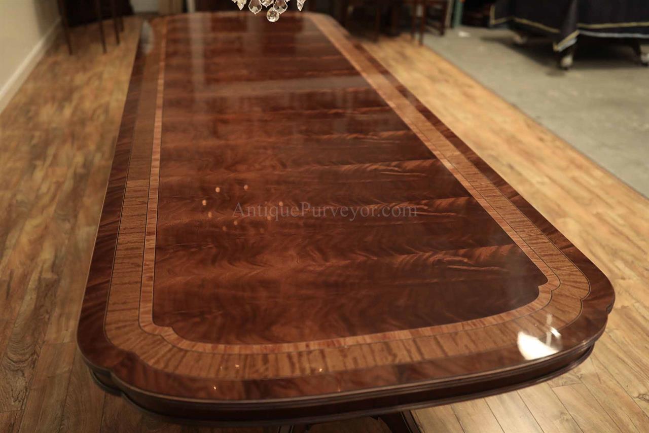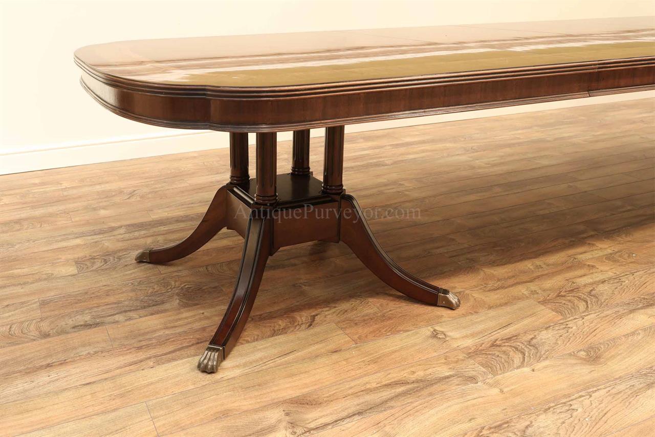 Extra long and extra wide mahogany dining table with three leaves. This table opens to 156″ to seat about 14-16 people. It is 54″ wide. This is a custom American-made dining table on solid mahogany pedestals. We currently have one table in stock, pre-owned and in very good condition with a few minor surface scratches which go unnoticed unless you study the tabletop for condition.