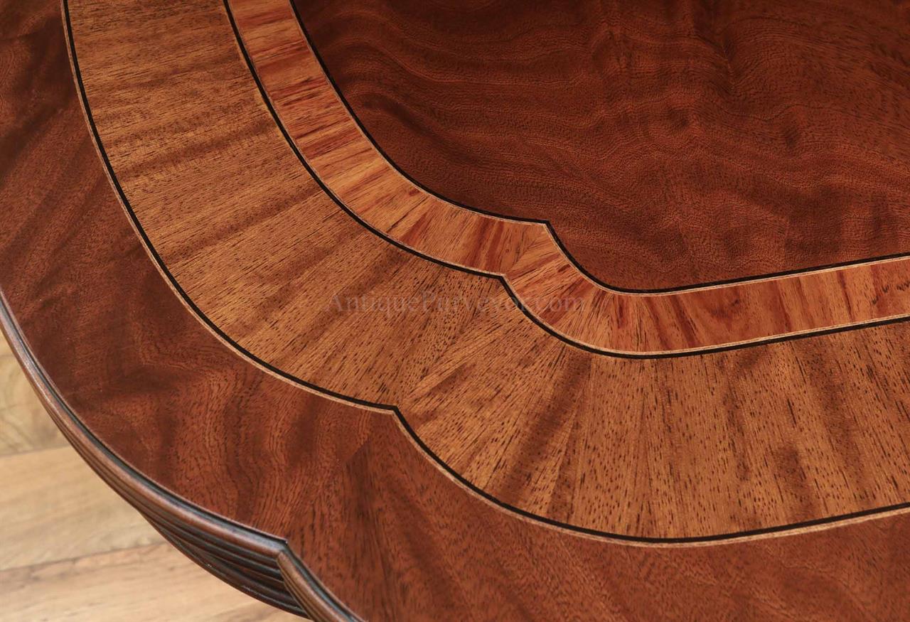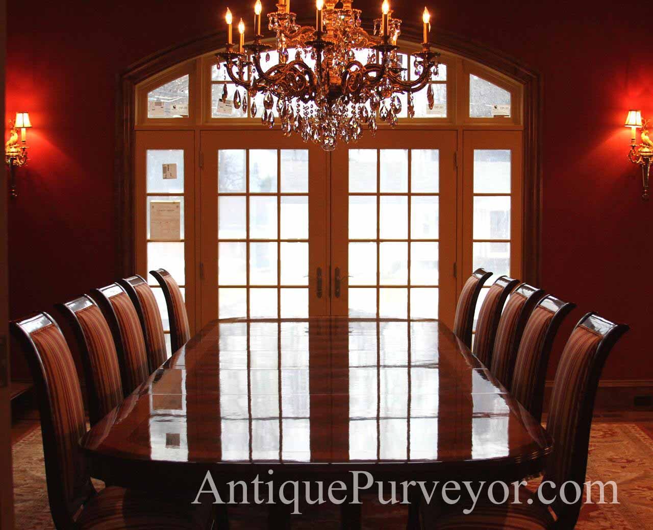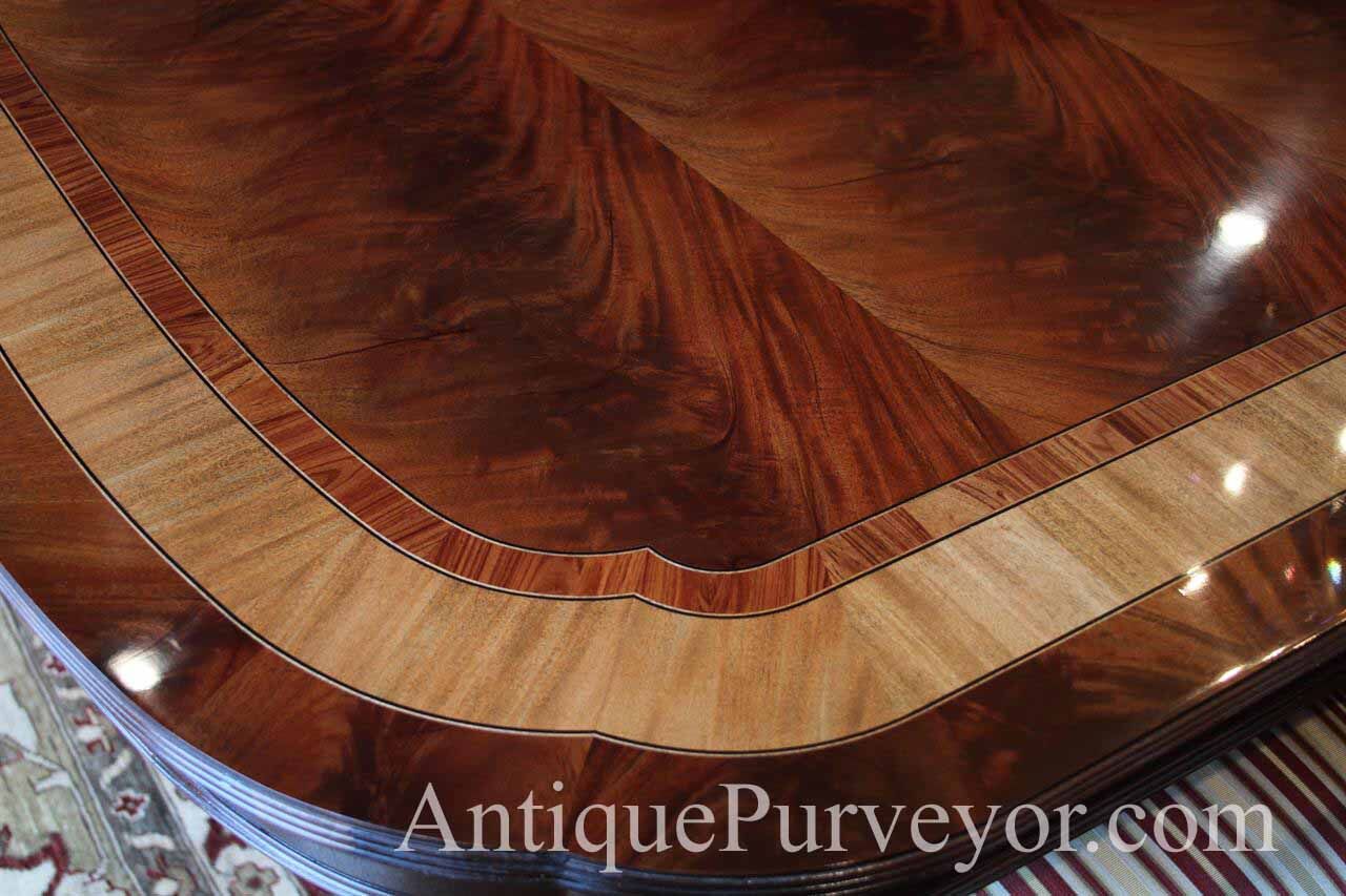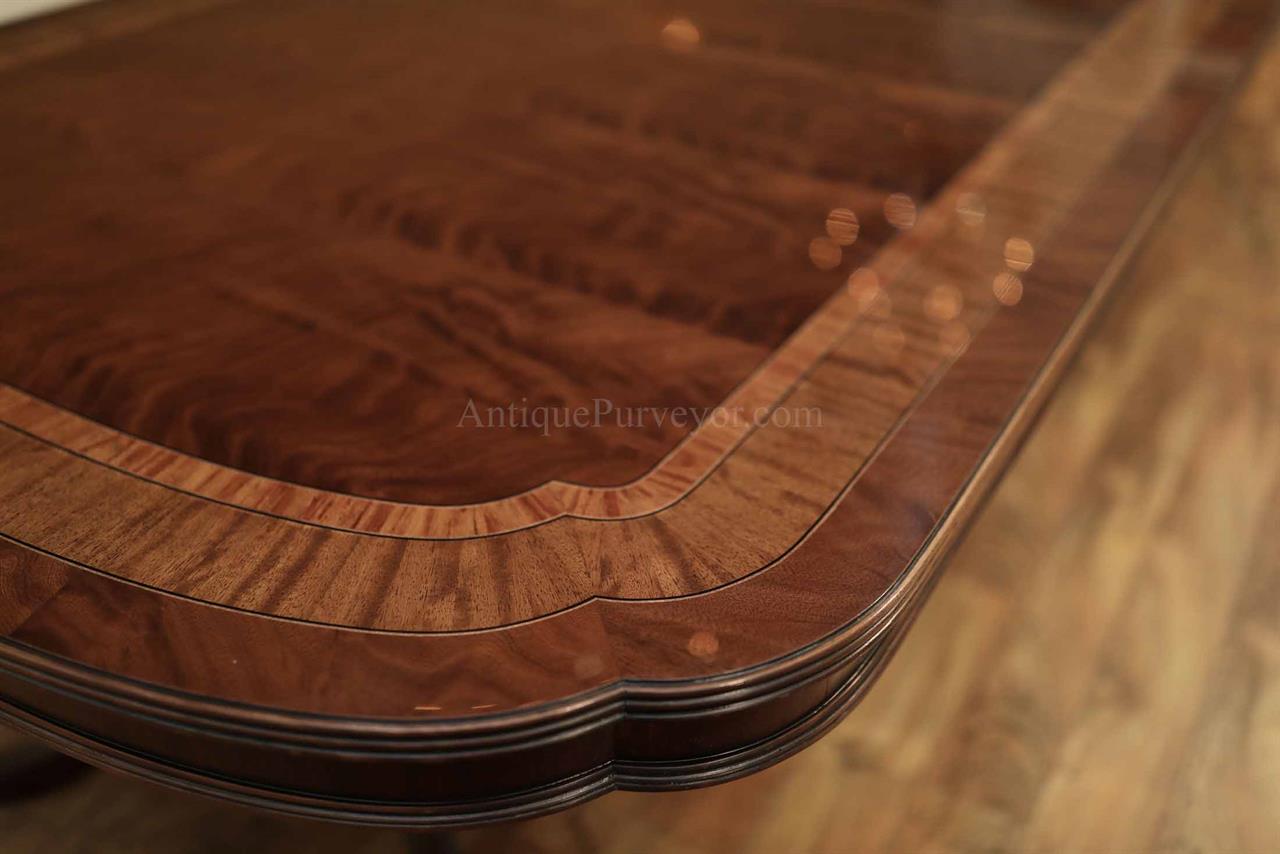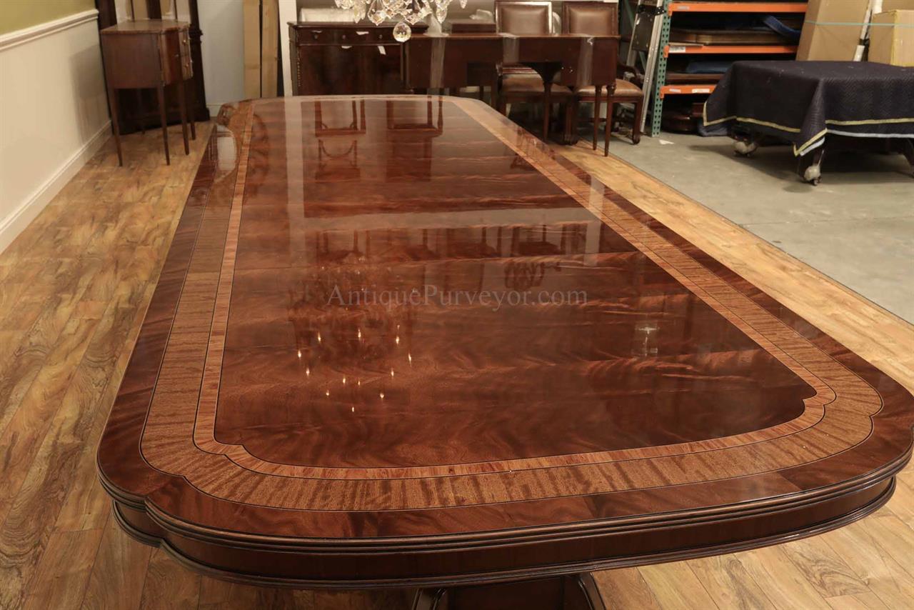 Extra long and extra wide mahogany dining table with three leaves. This table opens to 156″ to seat about 14-16 people. It is 54″ wide. This is a custom American-made dining table on solid mahogany pedestals. We currently have one table in stock, pre-owned and in very good condition with a few minor surface scratches which go unnoticed unless you study the tabletop for condition.
