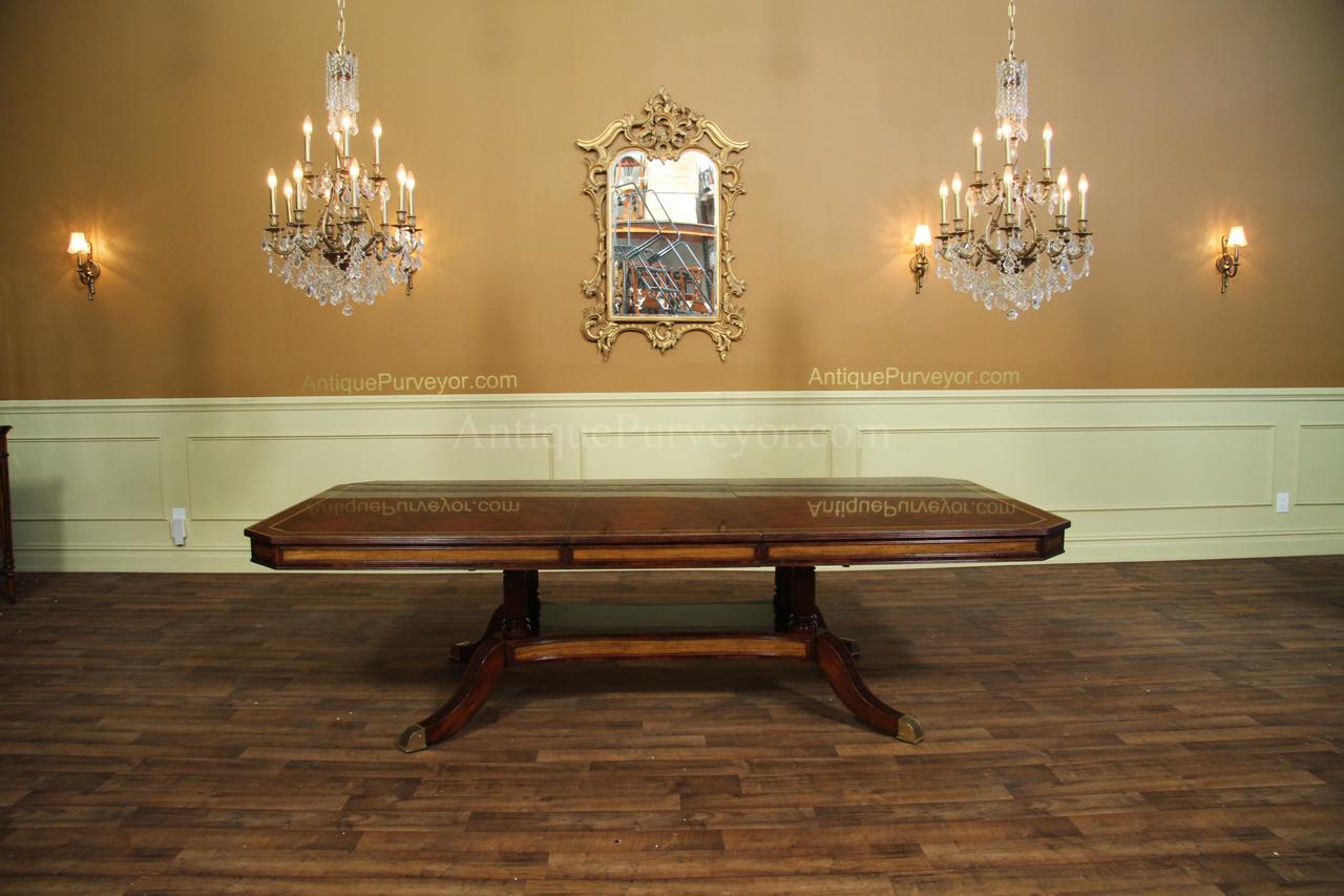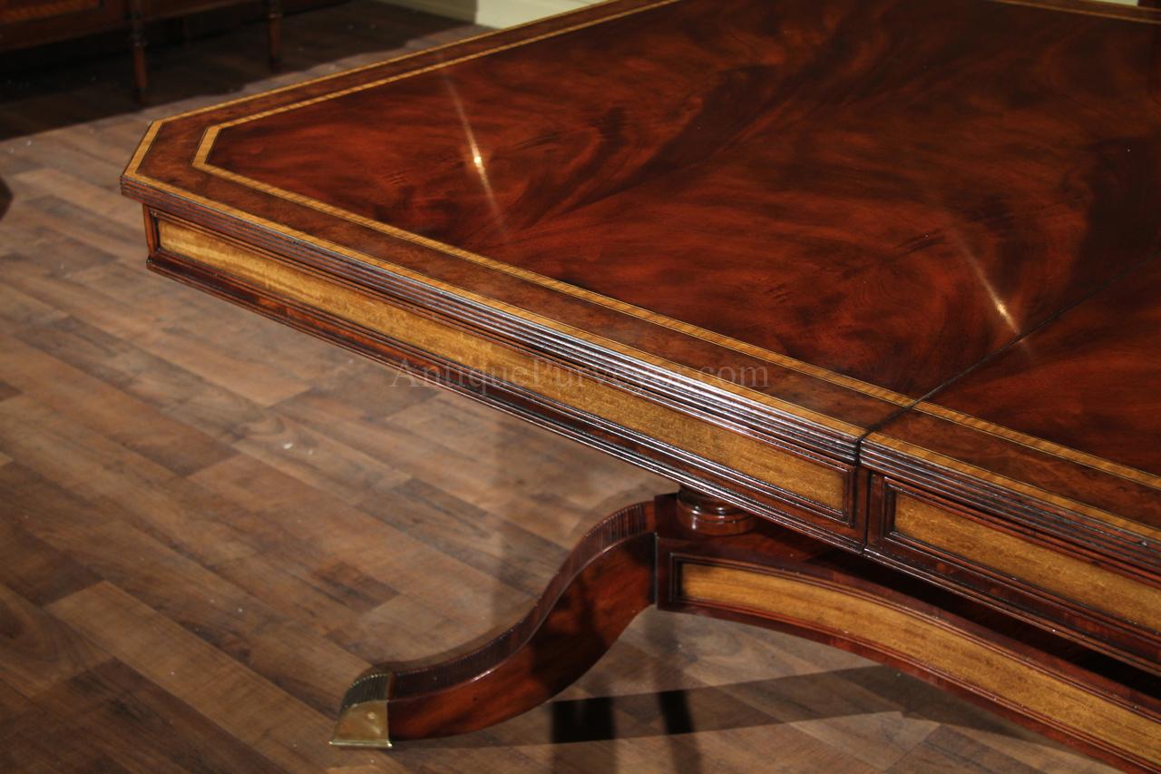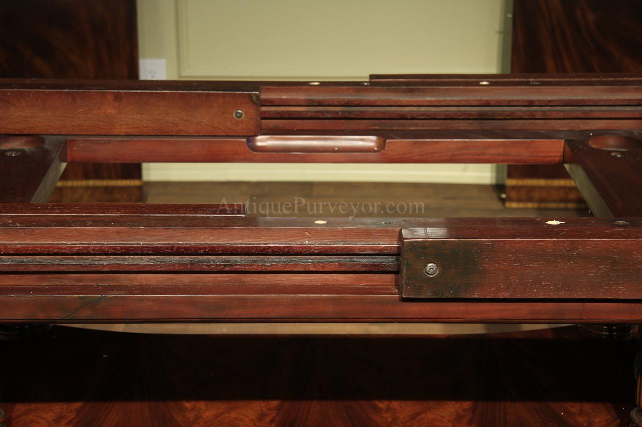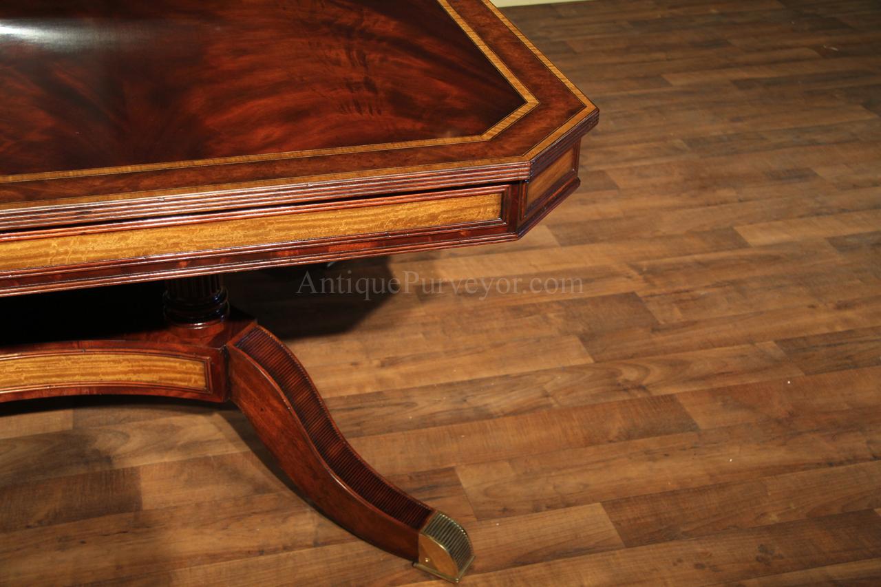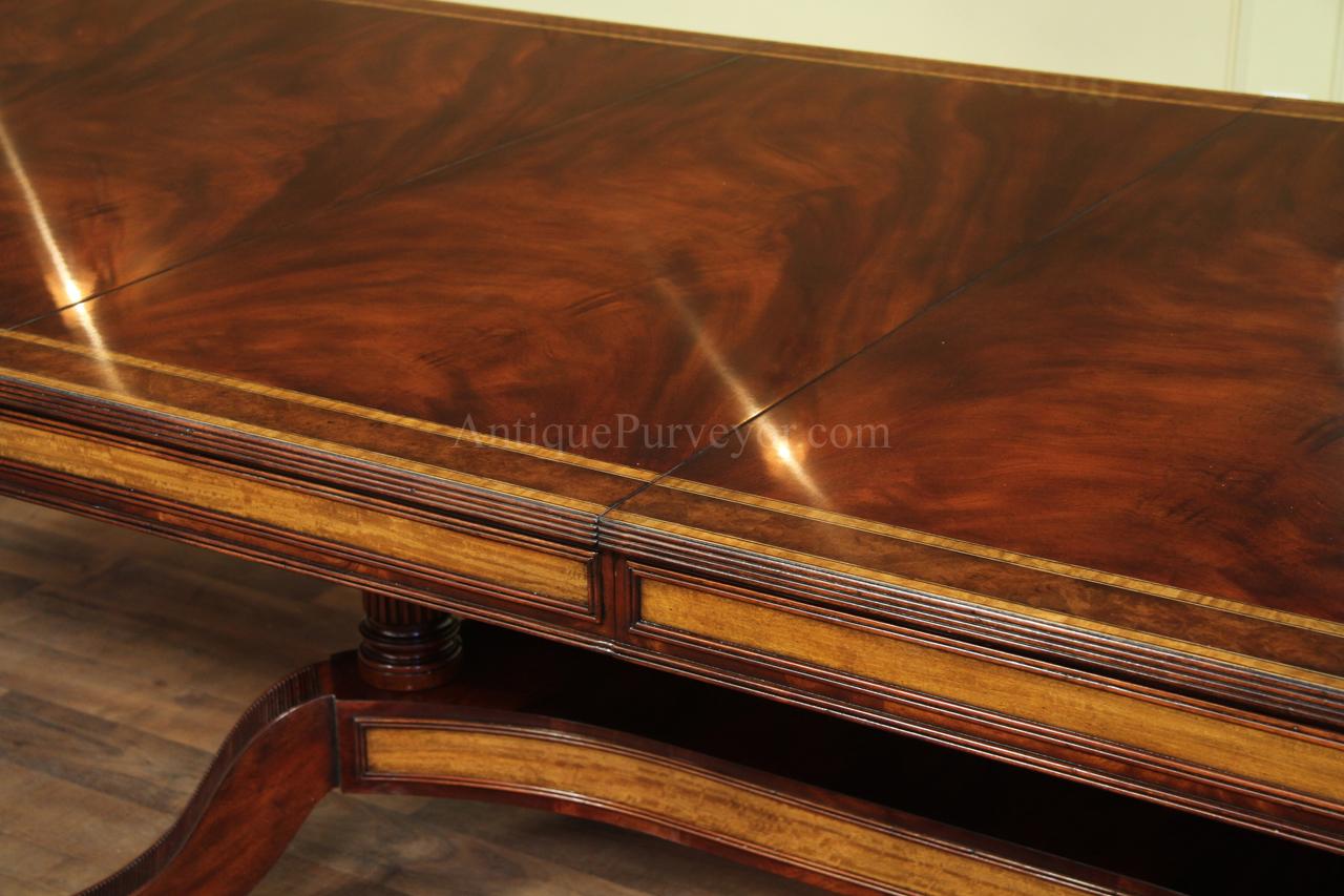 Large and wide satinwood and walnut banded mahogany dining table with self storing leaves. This table offers remarkable value. The table sits on a wide platform pedestal base, which by itself, can be considered a table on its own. The pedestal base has matching inlays, outswept legs with custom forged brass capped feet and the legs are carved with horizontal reeding. The table features self storing leaves and one of the two leaves has a callapsable apron which folds down so the leaf stows beneath the table. We show plenty of pictures to illustrate how this works. This folding apron locks into place when it is in use by interlocking into the neighboring apron, a well thought out design. The apron on this table is not a typical apron. The apron or skirt is a panelled satinwood veneered low relief frieze which would coordinate with raised panels in a Colonial space. Another great feature of this table is how easily it opens and closes. It only takes one person to open and close this table and requires no heavy lifting (aside from lifting the leaf) as the table halves glide on tracks similar to a refractory table. One leaf is pegged on the underside and it falls into place at true center by slipping into a drilled hole on the table slide. With this feature, it is easy to find true center when using the table with 1 or 2 leaves. These are very handy features and overall, this table is a show stopper and a great piece of furniture. This table would not only serve as a spectascular dining table, but it would also be a great conference room table as well.