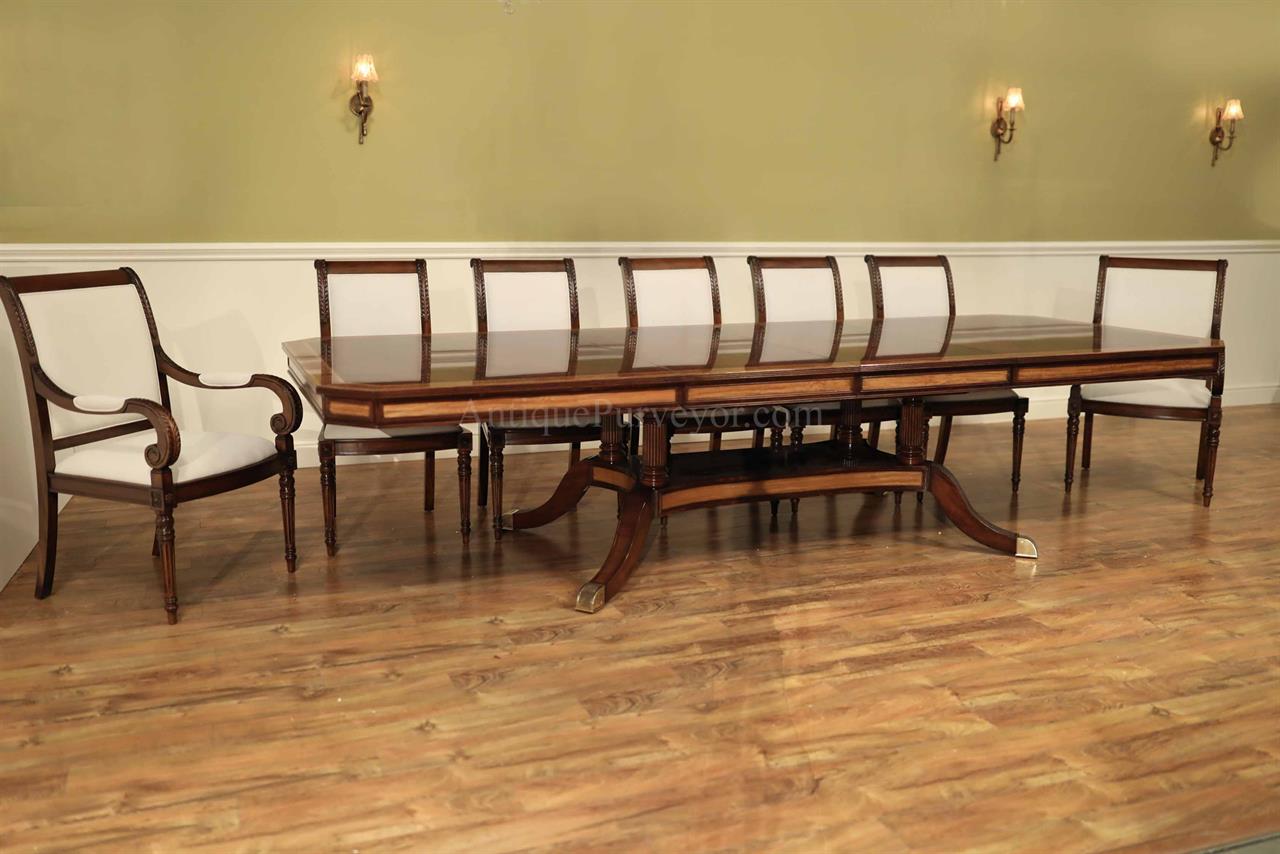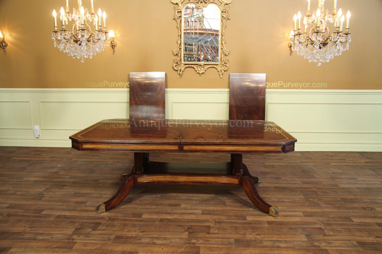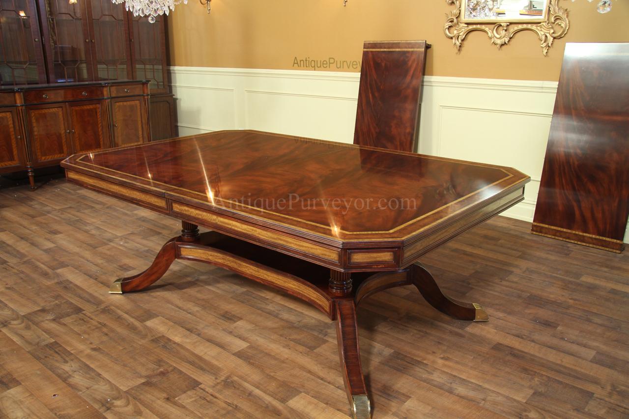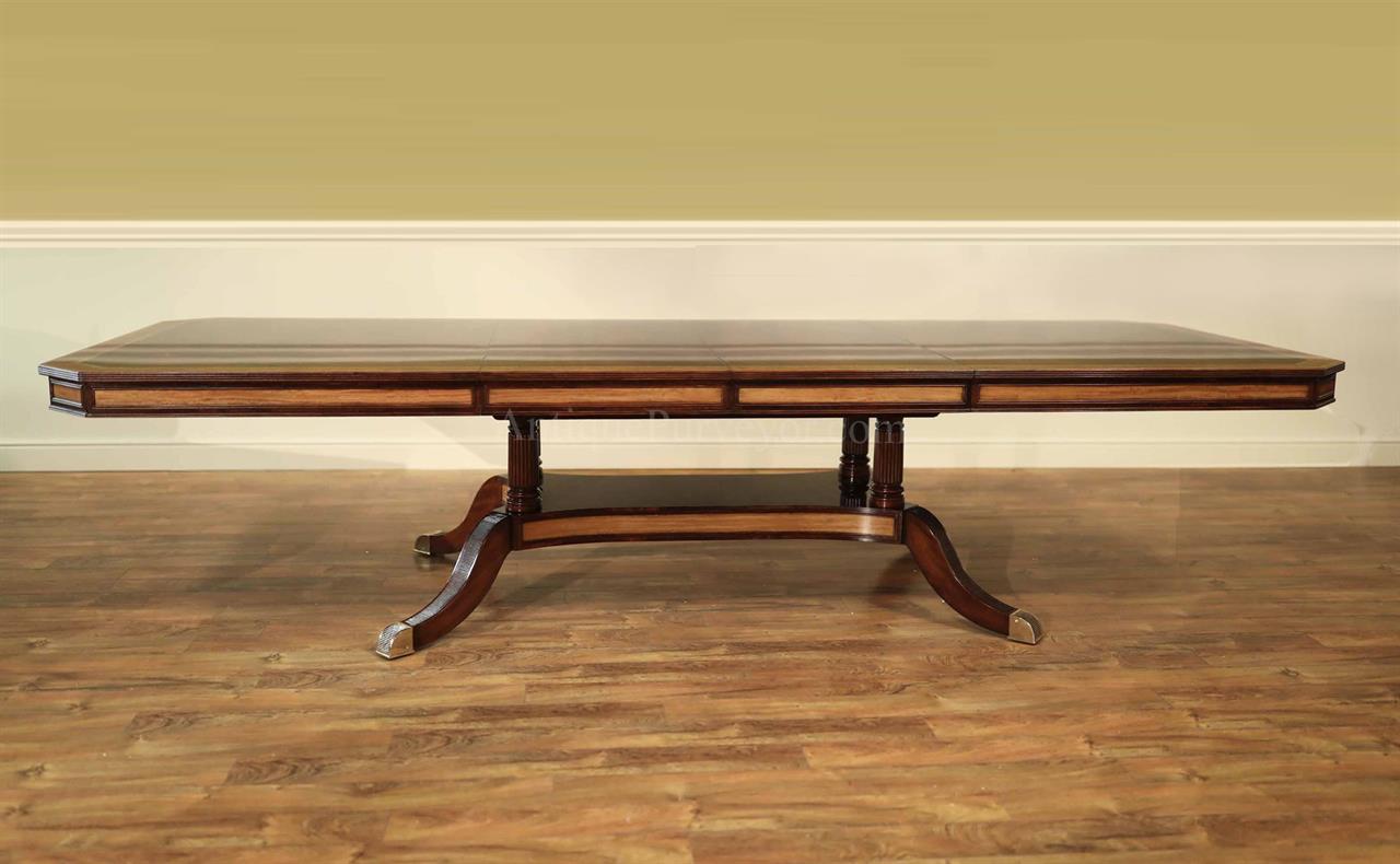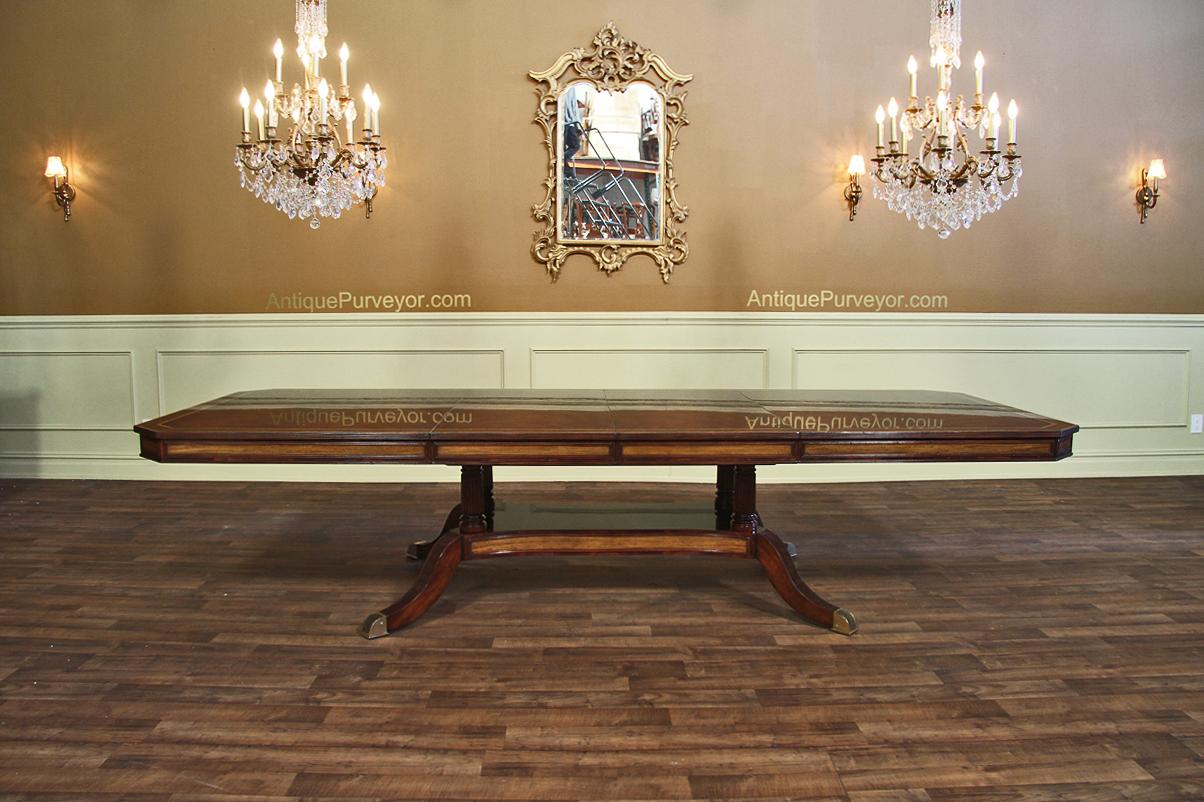 Large and wide satinwood and walnut banded mahogany dining table with self storing leaves. This table offers remarkable value. The table sits on a wide platform pedestal base, which by itself, can be considered a table on its own. The pedestal base has matching inlays, outswept legs with custom forged brass capped feet and the legs are carved with horizontal reeding. The table features self storing leaves and one of the two leaves has a callapsable apron which folds down so the leaf stows beneath the table. We show plenty of pictures to illustrate how this works. This folding apron locks into place when it is in use by interlocking into the neighboring apron, a well thought out design. The apron on this table is not a typical apron. The apron or skirt is a panelled satinwood veneered low relief frieze which would coordinate with raised panels in a Colonial space. Another great feature of this table is how easily it opens and closes. It only takes one person to open and close this table and requires no heavy lifting (aside from lifting the leaf) as the table halves glide on tracks similar to a refractory table. One leaf is pegged on the underside and it falls into place at true center by slipping into a drilled hole on the table slide. With this feature, it is easy to find true center when using the table with 1 or 2 leaves. These are very handy features and overall, this table is a show stopper and a great piece of furniture. This table would not only serve as a spectascular dining table, but it would also be a great conference room table as well.
