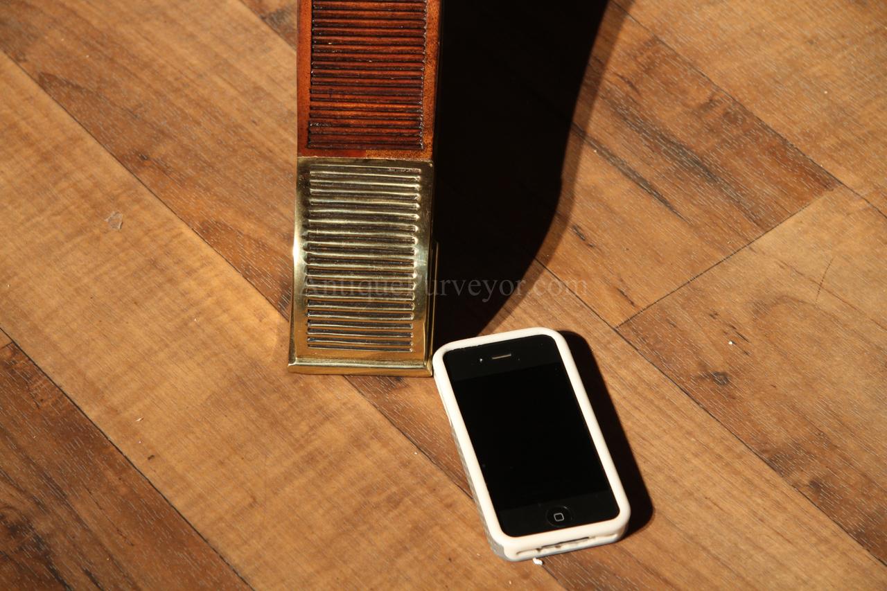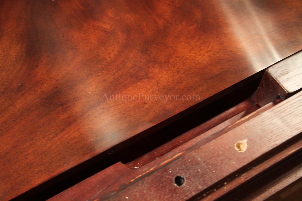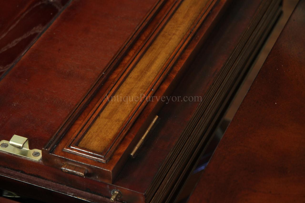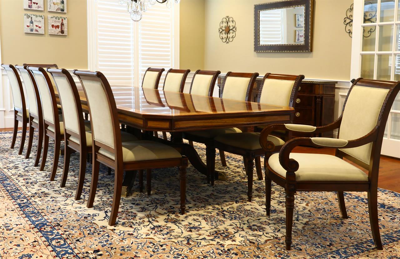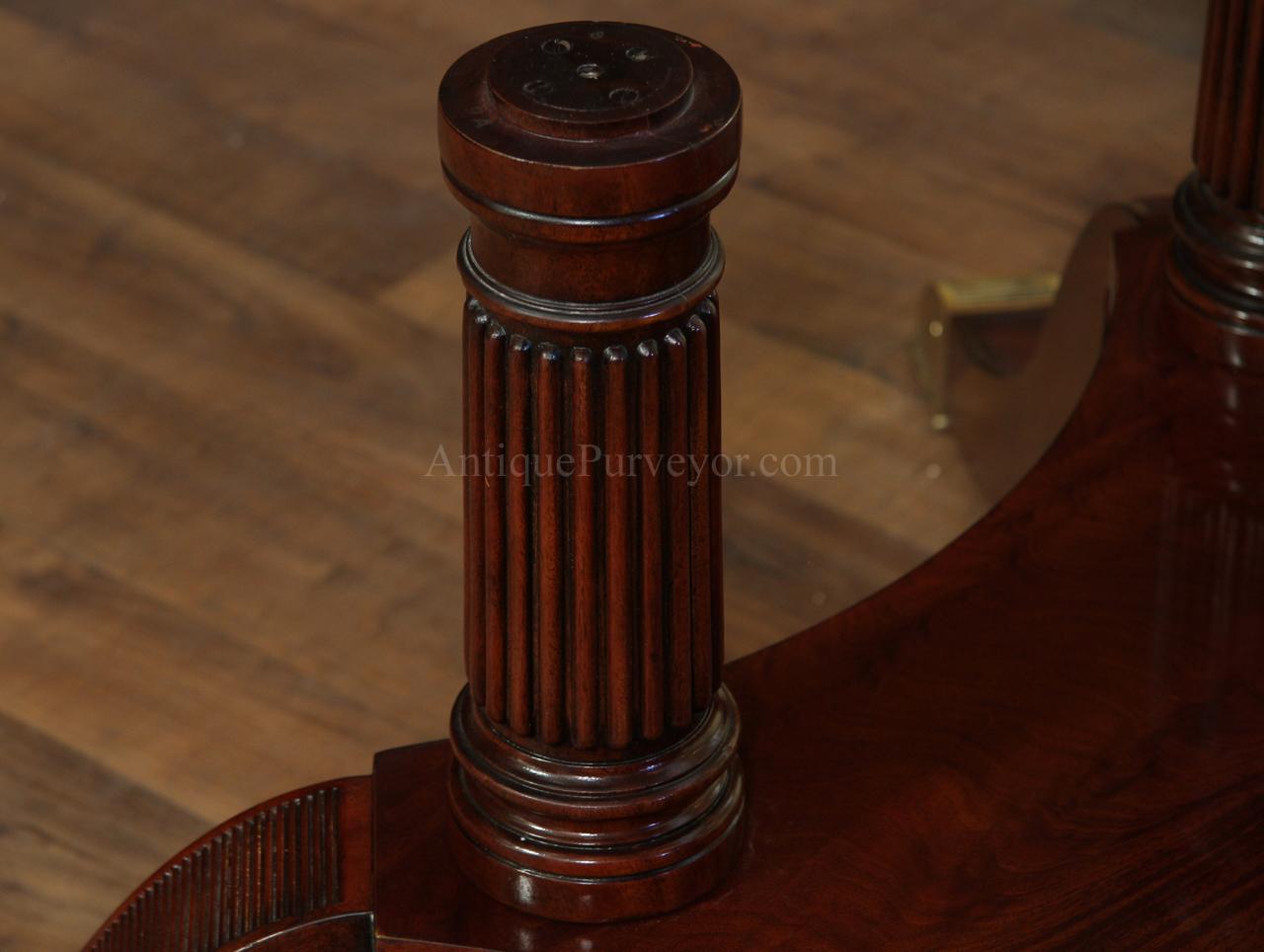 Large and wide satinwood and walnut banded mahogany dining table with self storing leaves. This table offers remarkable value. The table sits on a wide platform pedestal base, which by itself, can be considered a table on its own. The pedestal base has matching inlays, outswept legs with custom forged brass capped feet and the legs are carved with horizontal reeding. The table features self storing leaves and one of the two leaves has a callapsable apron which folds down so the leaf stows beneath the table. We show plenty of pictures to illustrate how this works. This folding apron locks into place when it is in use by interlocking into the neighboring apron, a well thought out design. The apron on this table is not a typical apron. The apron or skirt is a panelled satinwood veneered low relief frieze which would coordinate with raised panels in a Colonial space. Another great feature of this table is how easily it opens and closes. It only takes one person to open and close this table and requires no heavy lifting (aside from lifting the leaf) as the table halves glide on tracks similar to a refractory table. One leaf is pegged on the underside and it falls into place at true center by slipping into a drilled hole on the table slide. With this feature, it is easy to find true center when using the table with 1 or 2 leaves. These are very handy features and overall, this table is a show stopper and a great piece of furniture. This table would not only serve as a spectascular dining table, but it would also be a great conference room table as well.
