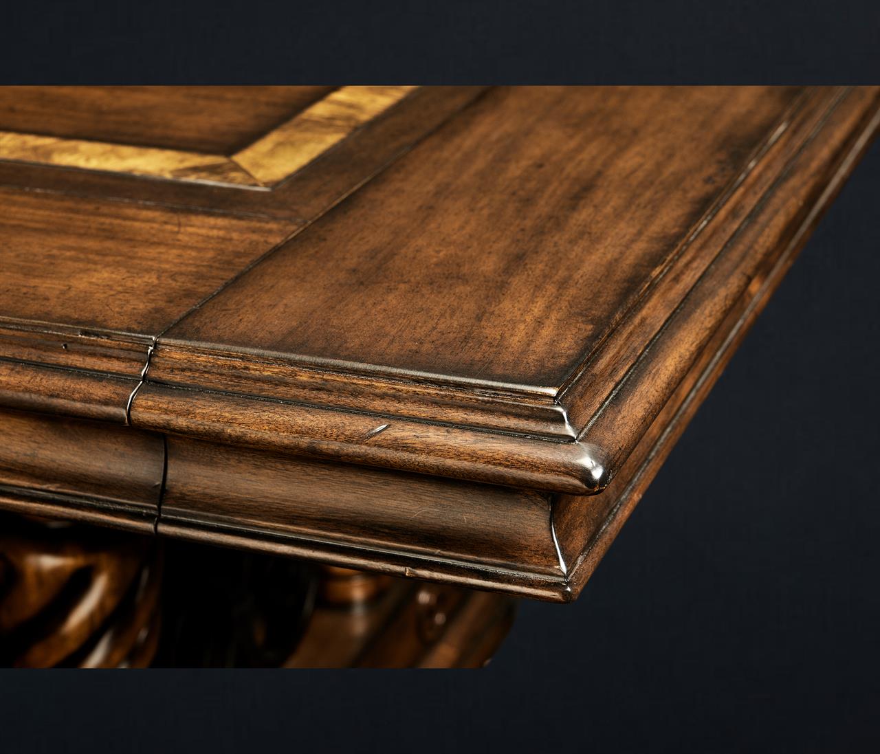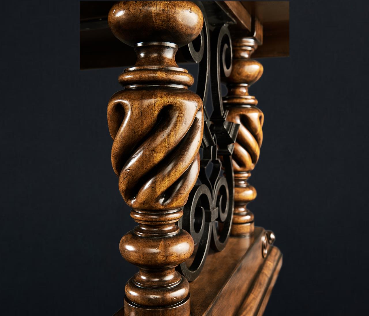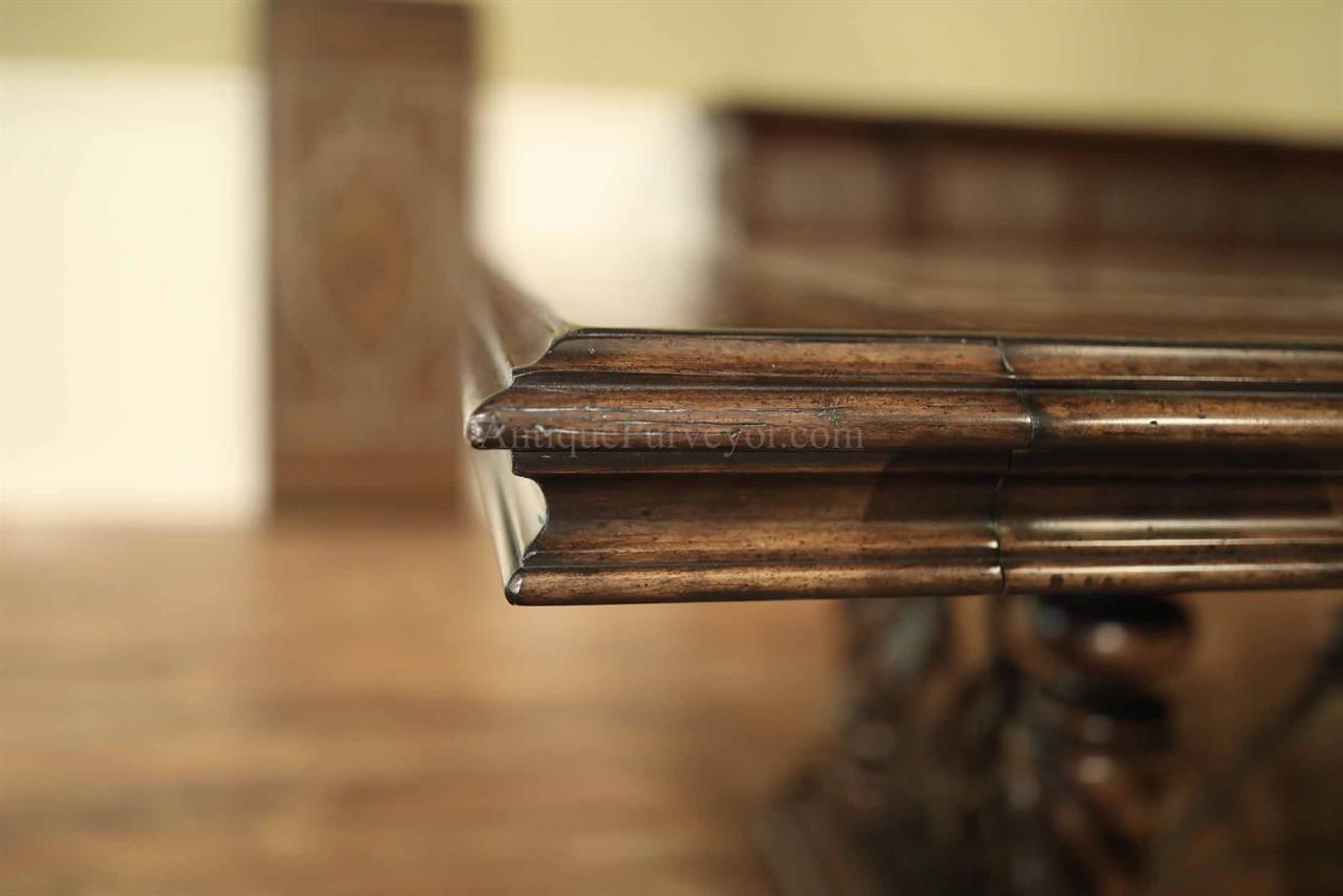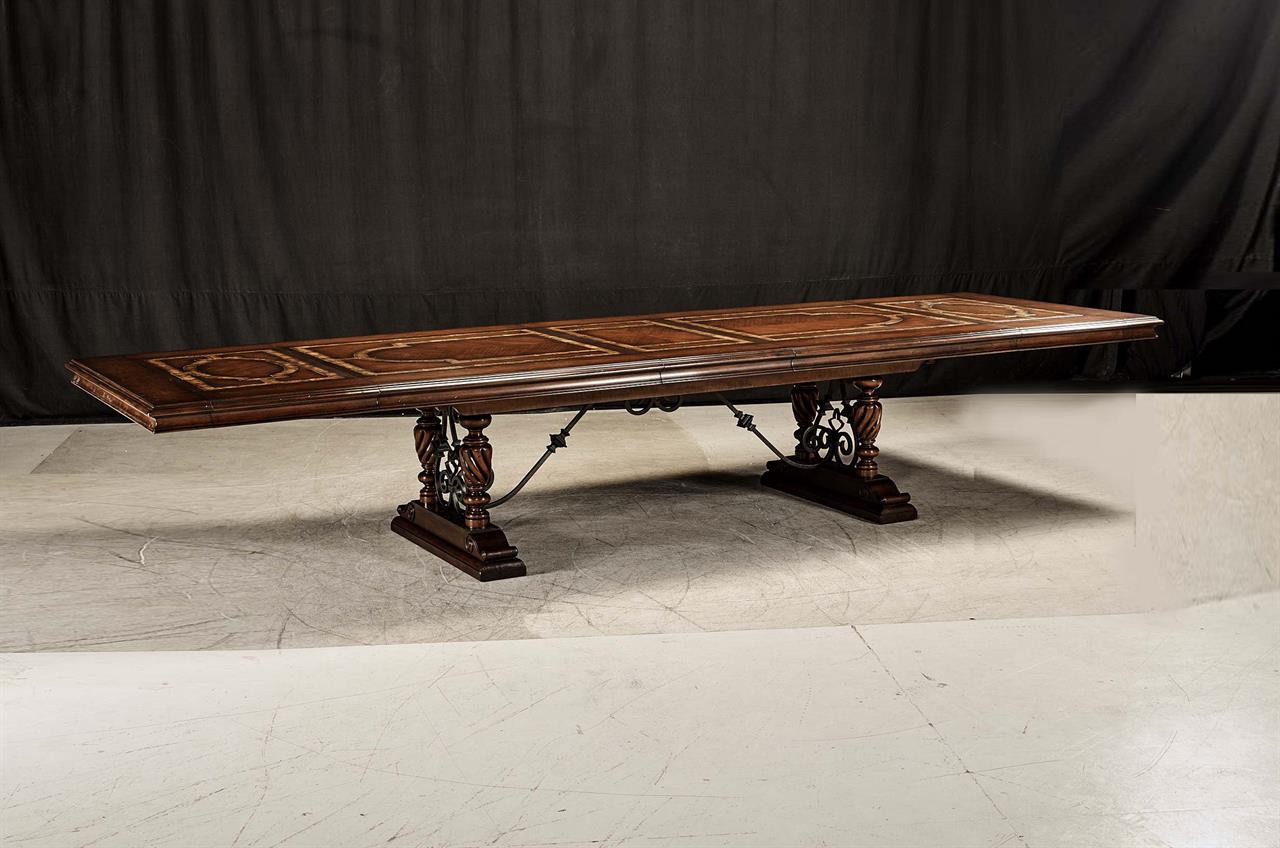 Traditional extra-large extension table for seating 8 to 16 people, an AP Exclusive by AntiquePurveyor. This large Tuscan-style refractory table comes with three leaves; it is designed to be used with one, two, or all three leaves. To configure the table for 12 people, use one leaf in the center of the table. If you want to seat 14 people, you would use 2 leaves, one on each end. To reach full capacity, the two ends and the middle can be opened to seat 16 people at 166 inches long. The table has a wide, solid wood, contoured edge molding, and the tabletop is decorated with raised variegated wood. Mild factory distressed finish, minor dings, and worm holes resemble years of patina—a family-friendly walnut masterpiece for seating up to 16 People. The tabletop rests on four significant turned columns and a hammered-iron stretcher, which adds strength and stability.