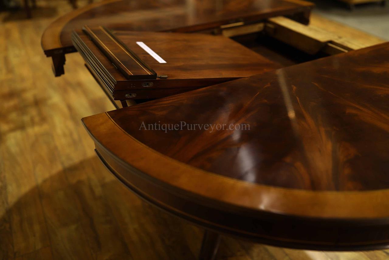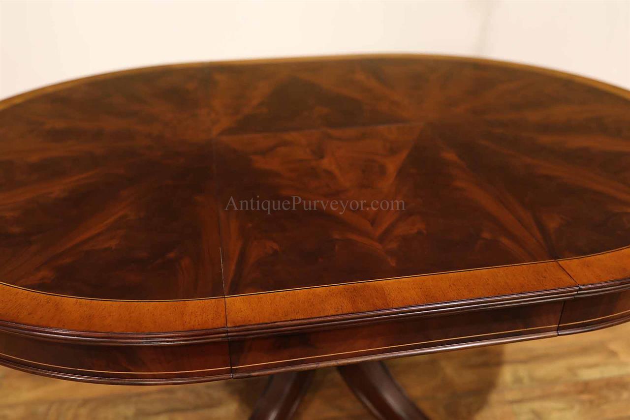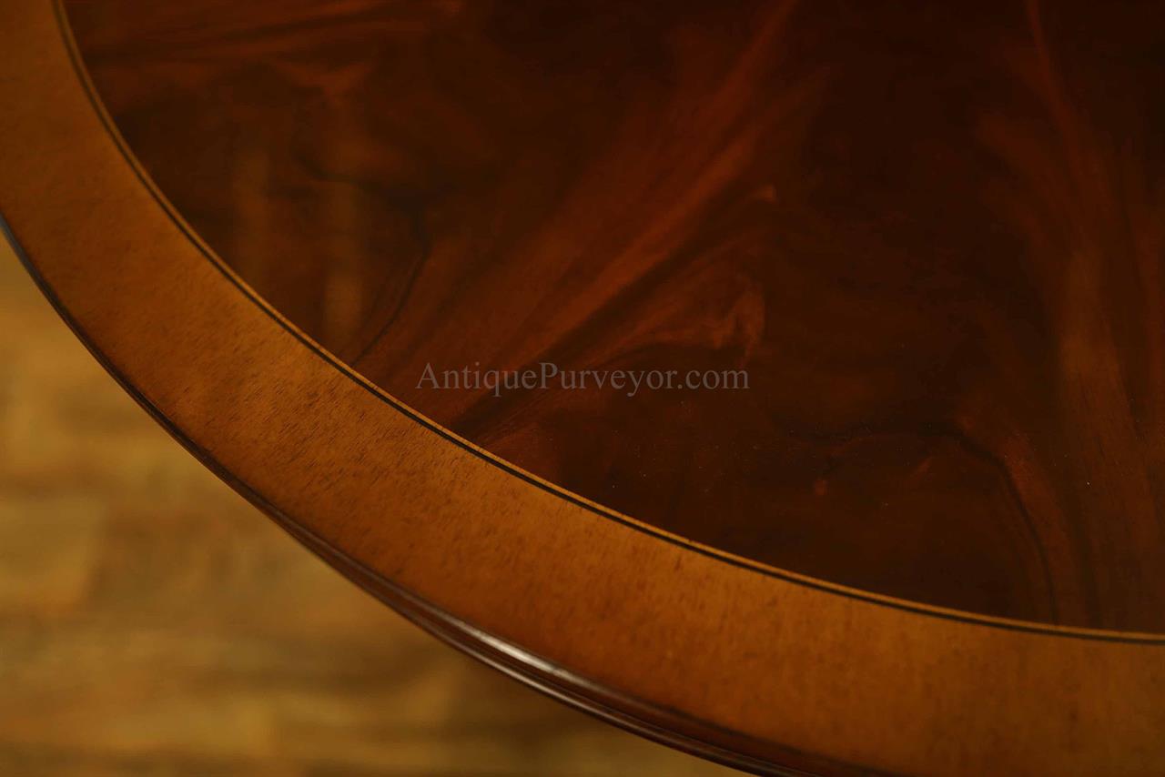 A 48-inch to 66-inch, extendable, round-to-oval mahogany breakfast table with a self-storing leaf, an AP Exclusive by AntiquePurveyor. This table features custom solid brass forged hardware, a pie-cut mahogany field, a two-tone inlaid border, very sturdy Duncan Phyfe-inspired saber leg pedestal. The feet also have durable, adjustable levels that are large enough to accommodate a large felt pad. The table and leaf locks have a cam-like action, so they hold the table seams tight when you open and close them. The table is finished in medium brown mahogany. The apron is decorated with flame mahogany. The tabletop is 30 inches tall.