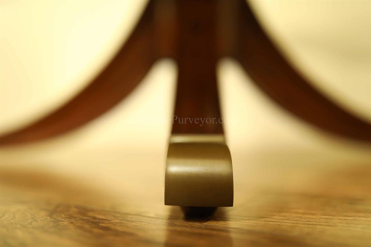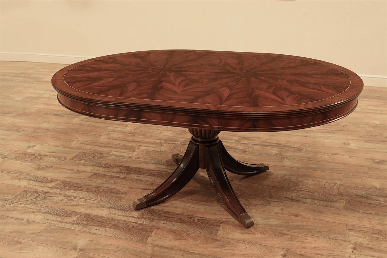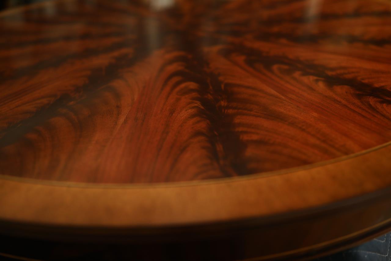 A 48-inch to 66-inch, extendable, round-to-oval mahogany breakfast table with a self-storing leaf, an AP Exclusive by AntiquePurveyor. This table features custom solid brass forged hardware, a pie-cut mahogany field, a two-tone inlaid border, very sturdy Duncan Phyfe-inspired saber leg pedestal. The feet also have durable, adjustable levels that are large enough to accommodate a large felt pad. The table and leaf locks have a cam-like action, so they hold the table seams tight when you open and close them. The table is finished in medium brown mahogany. The apron is decorated with flame mahogany. The tabletop is 30 inches tall.