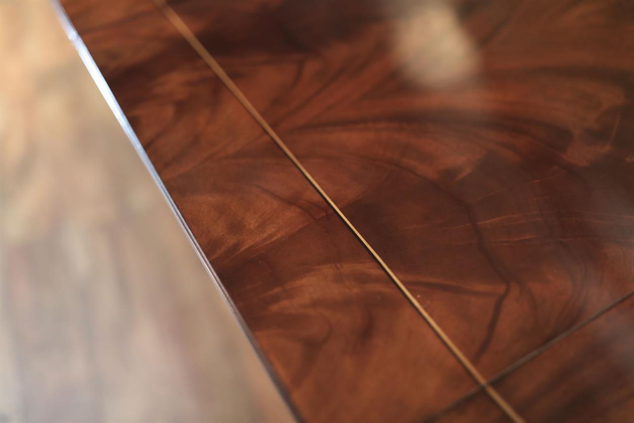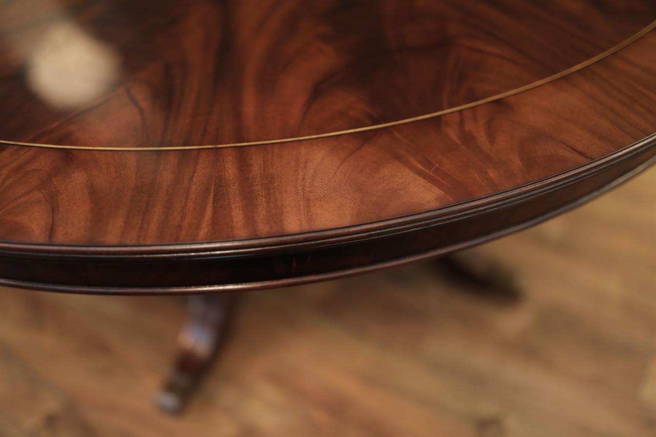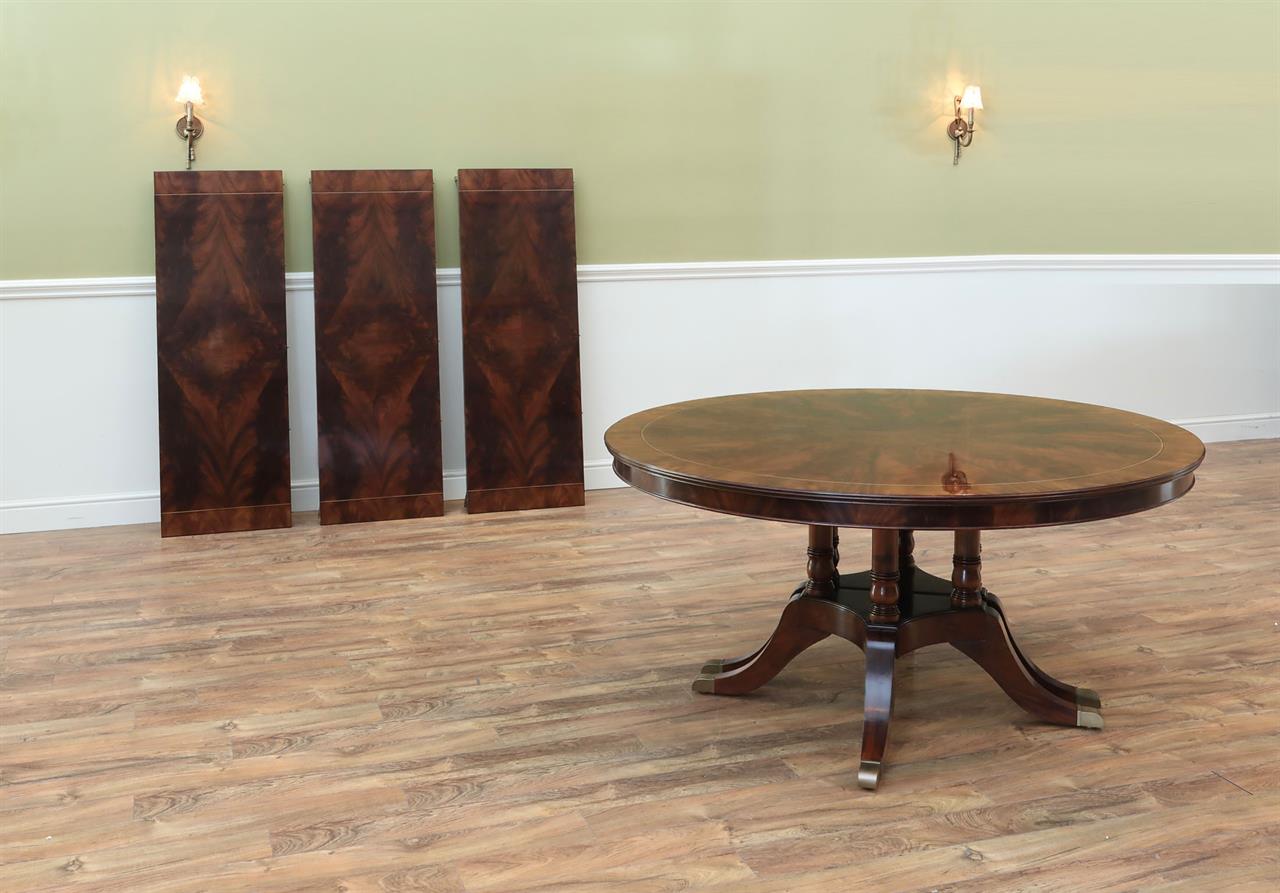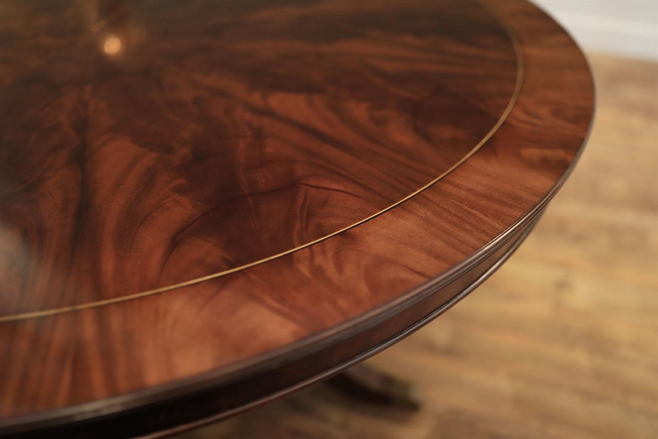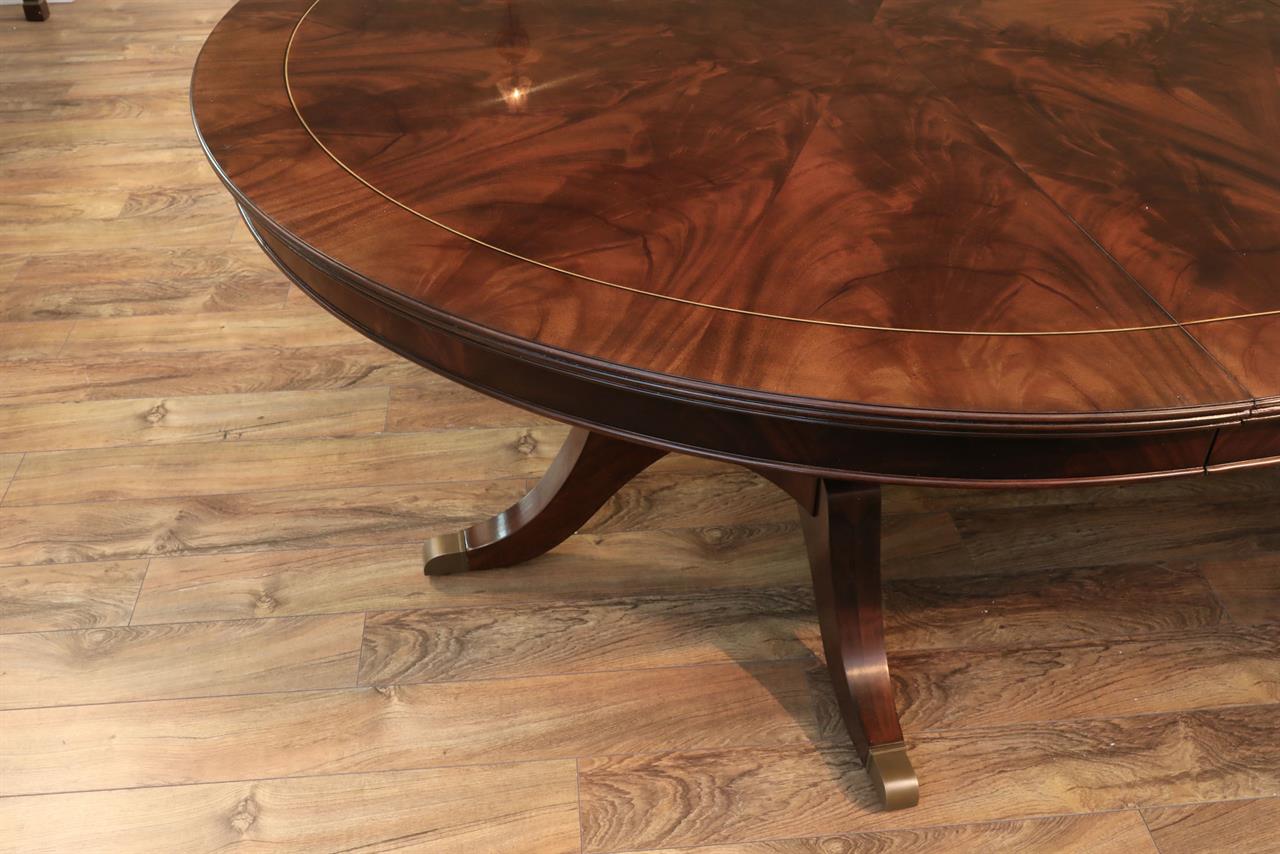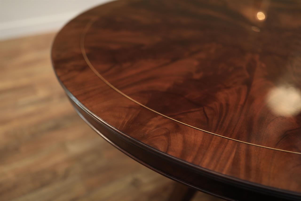 Our 60-inch round-to-oval mahogany dining room table can extend to 120 inches with three extensions, an AP Exclusive by AntiquePurveyor. This is the most versatile table in size and shape, and it is being manufactured exclusively for our online store, with quality in every detail. Veneers are bathed and rinsed in a proprietary solution to remove oils and tannins before they are pressed, to ensure a secure and long-lasting layout. Every piece of hardware on this table is forged in-house. Each screw, brass caster, and leaf locking hardware is made at the factory for true Heirloom quality. The pie-cut flame mahogany field is bordered with a lighter colored bleached mahogany band and black and white inlays. This table is sturdy, whether it is opened or closed.