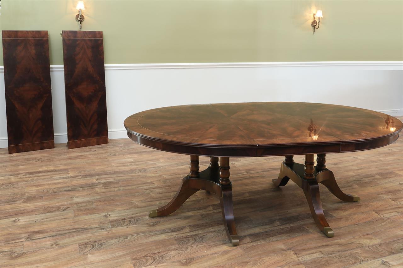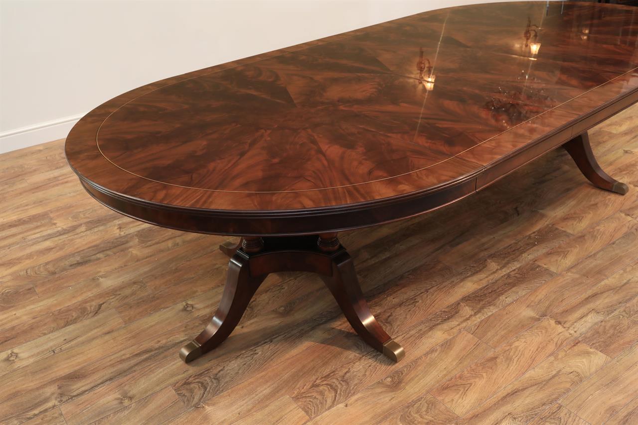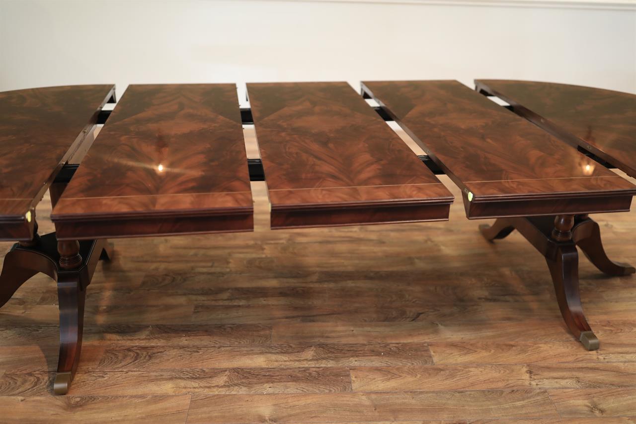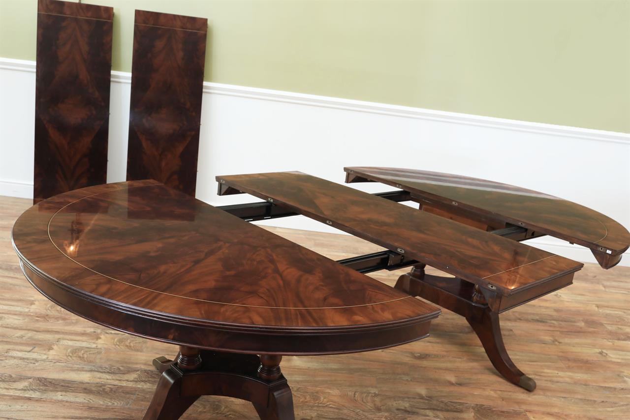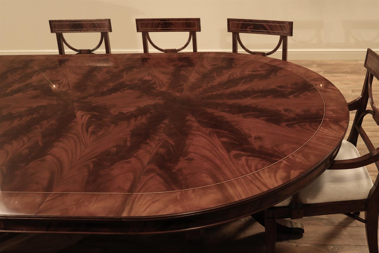 Our 60-inch round-to-oval mahogany dining room table can extend to 120 inches with three extensions, an AP Exclusive by AntiquePurveyor. This is the most versatile table in size and shape, and it is being manufactured exclusively for our online store, with quality in every detail. Veneers are bathed and rinsed in a proprietary solution to remove oils and tannins before they are pressed, to ensure a secure and long-lasting layout. Every piece of hardware on this table is forged in-house. Each screw, brass caster, and leaf locking hardware is made at the factory for true Heirloom quality. The pie-cut flame mahogany field is bordered with a lighter colored bleached mahogany band and black and white inlays. This table is sturdy, whether it is opened or closed.