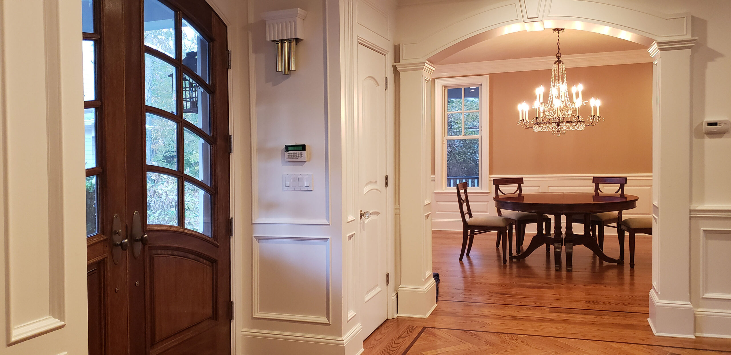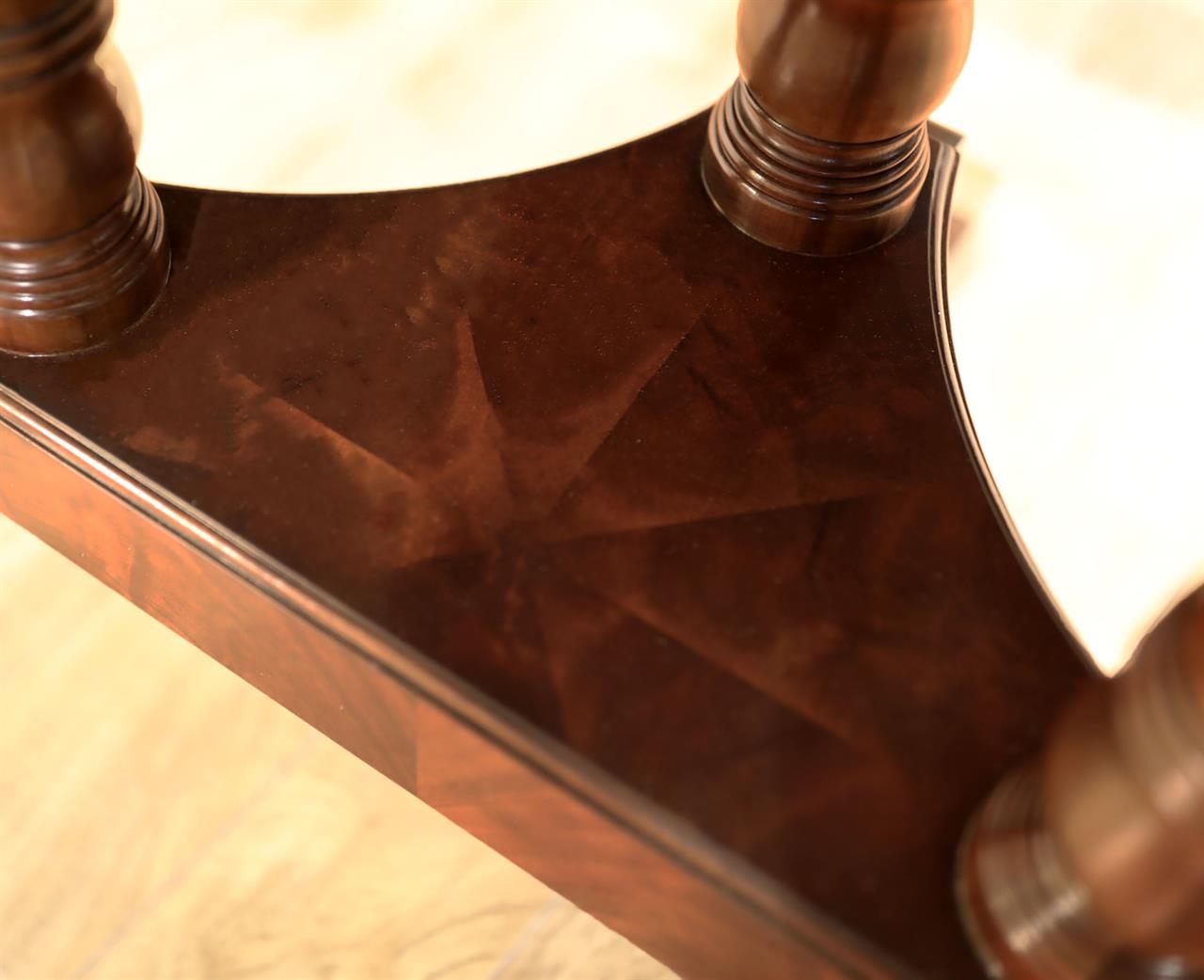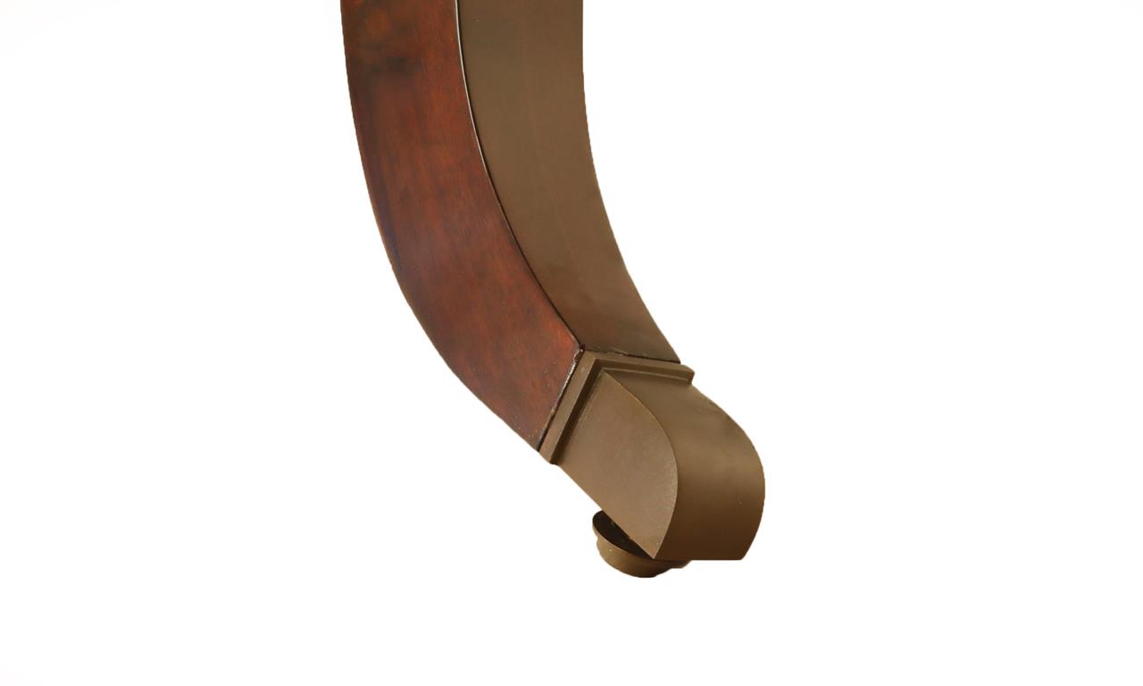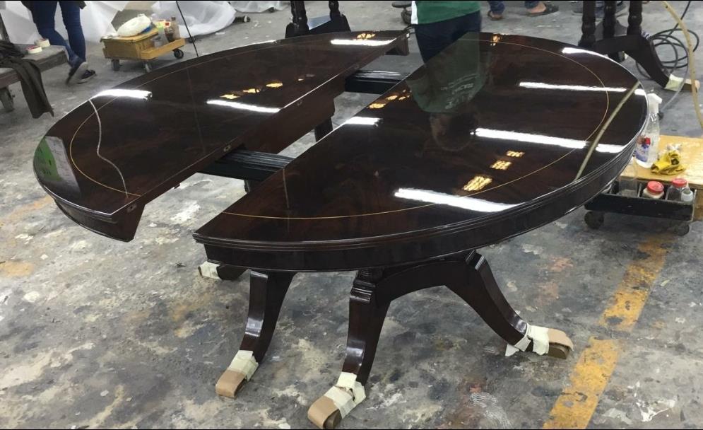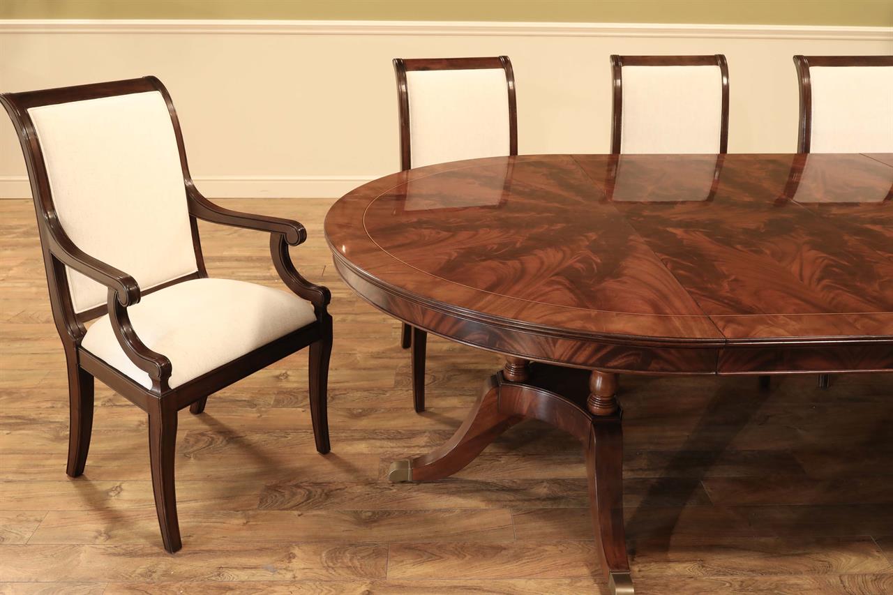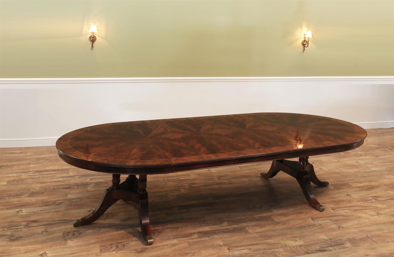 Our 60-inch round-to-oval mahogany dining room table can extend to 120 inches with three extensions, an AP Exclusive by AntiquePurveyor. This is the most versatile table in size and shape, and it is being manufactured exclusively for our online store, with quality in every detail. Veneers are bathed and rinsed in a proprietary solution to remove oils and tannins before they are pressed, to ensure a secure and long-lasting layout. Every piece of hardware on this table is forged in-house. Each screw, brass caster, and leaf locking hardware is made at the factory for true Heirloom quality. The pie-cut flame mahogany field is bordered with a lighter colored bleached mahogany band and black and white inlays. This table is sturdy, whether it is opened or closed.