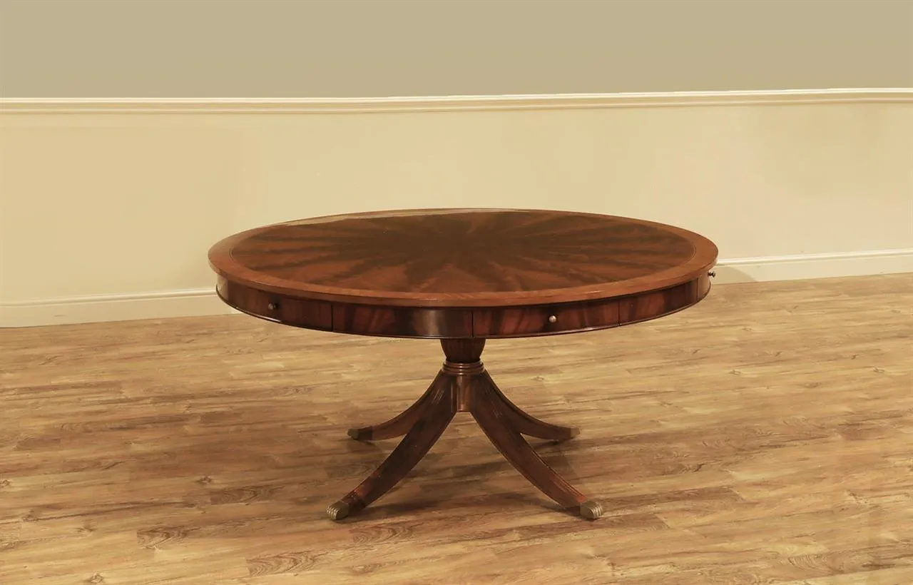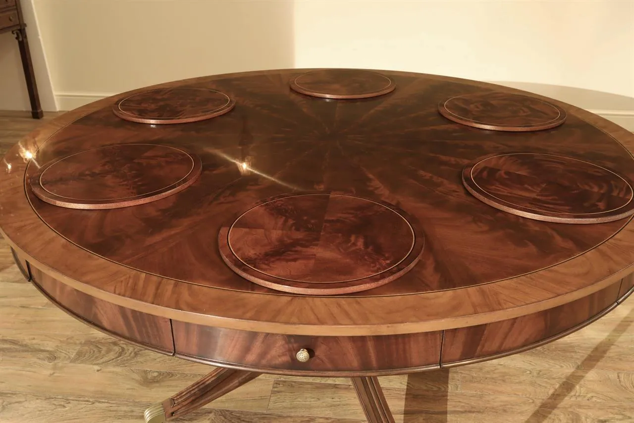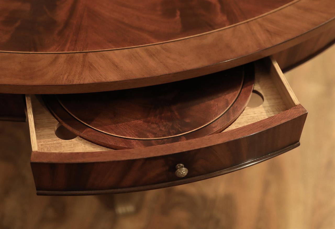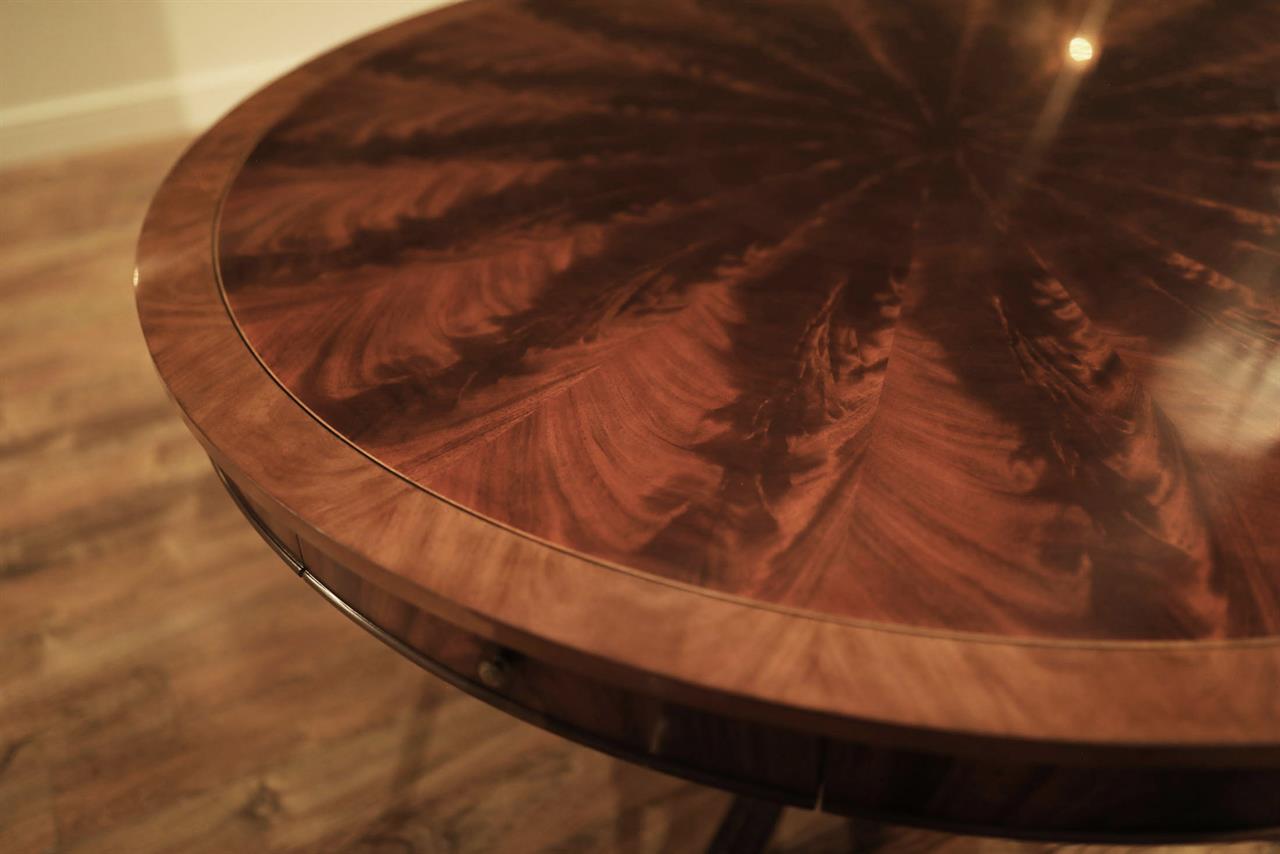 62-inch round mahogany dining table with 6 personal placemats and 6 personal drawers. A pie-cut flame mahogany top with a two-tone mahogany finish and fine inlay. Each place setting has a fitted tiger-oak drawer and a felt-backed mahogany placemat. This mahogany dining room table can also be used as a grand foyer table because the perimeter of the table is decorated with a flame mahogany apron and fine drawer pulls. The four out-sweeping Duncan Phyfe legs are reinforced with steel braces and the legs end with heavy brass foot caps and levelers.
