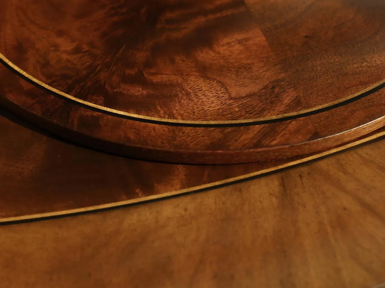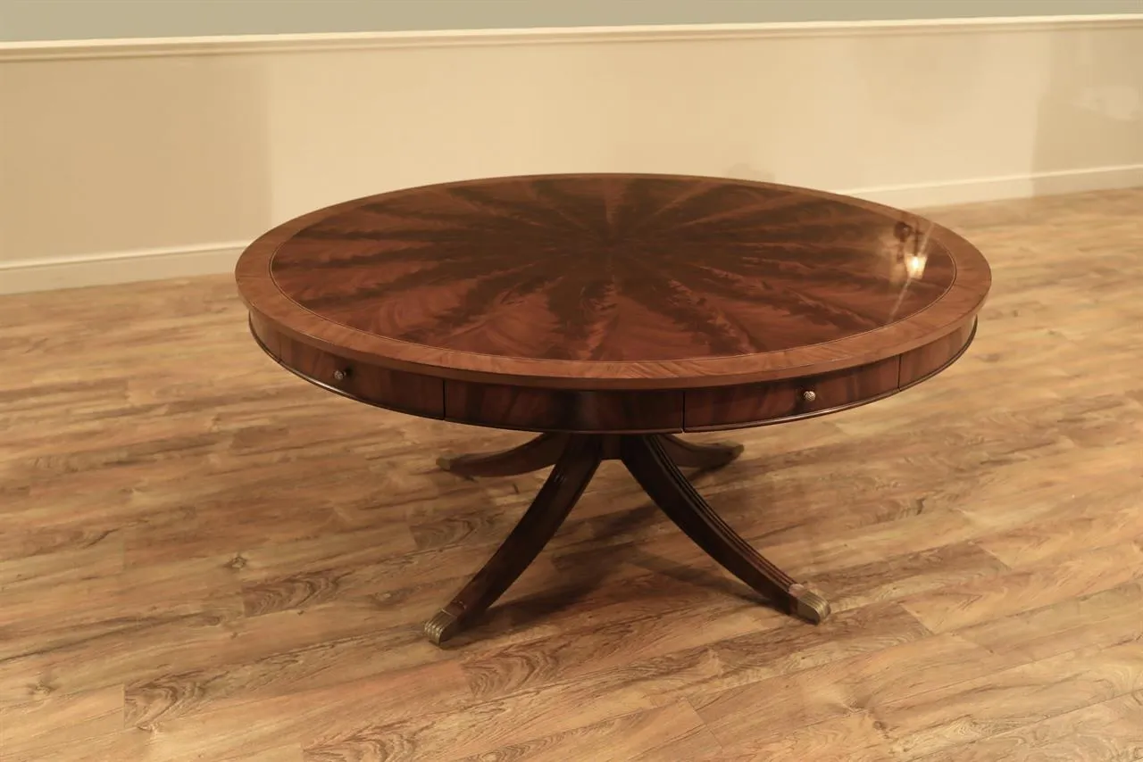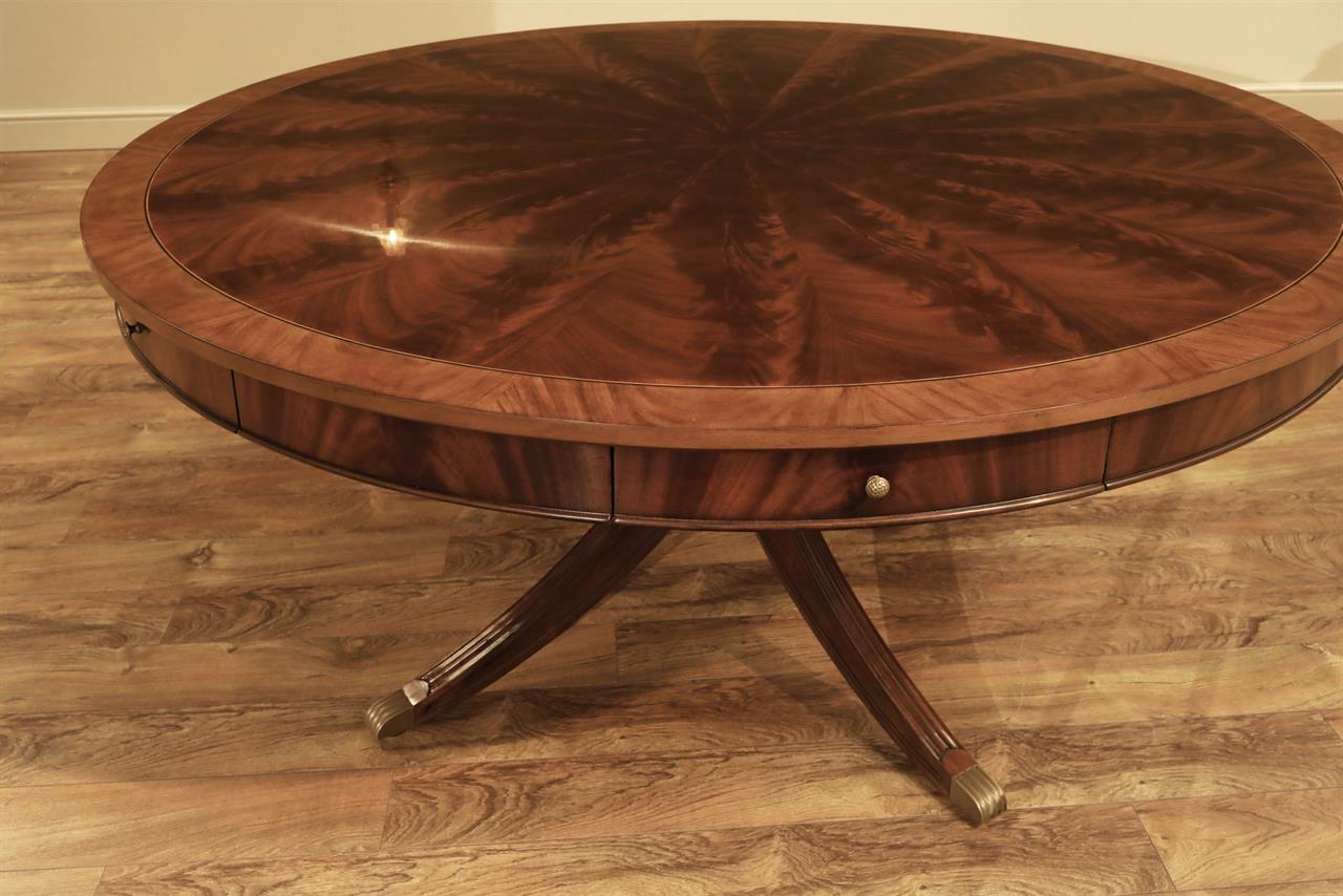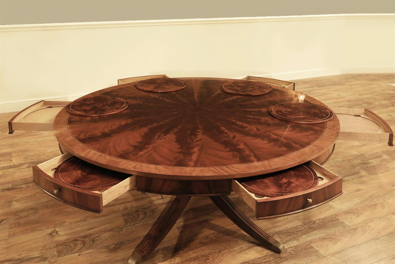 62-inch round mahogany dining table with 6 personal placemats and 6 personal drawers. A pie-cut flame mahogany top with a two-tone mahogany finish and fine inlay. Each place setting has a fitted tiger-oak drawer and a felt-backed mahogany placemat. This mahogany dining room table can also be used as a grand foyer table because the perimeter of the table is decorated with a flame mahogany apron and fine drawer pulls. The four out-sweeping Duncan Phyfe legs are reinforced with steel braces and the legs end with heavy brass foot caps and levelers.