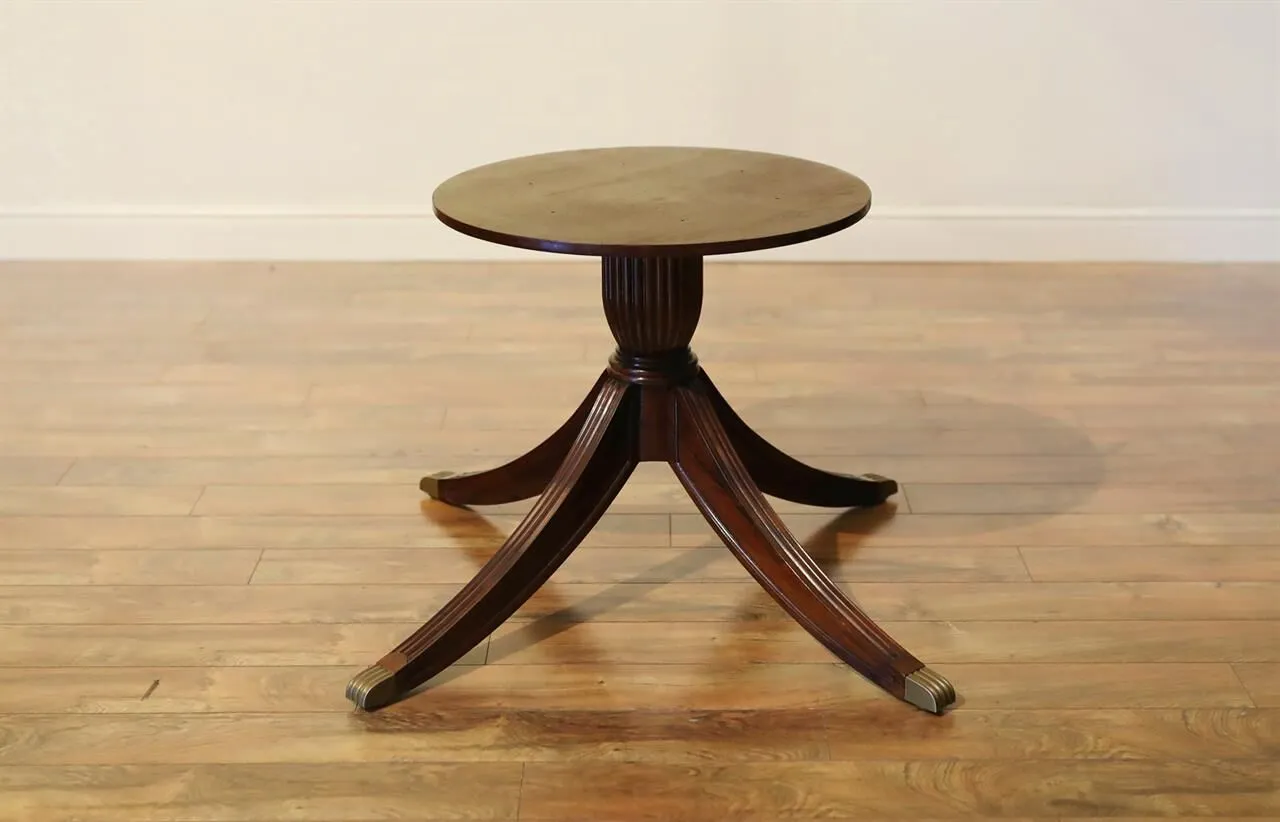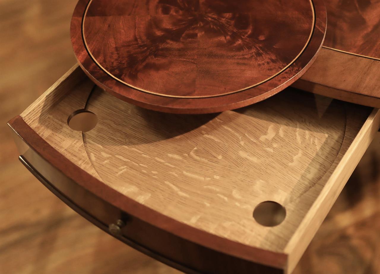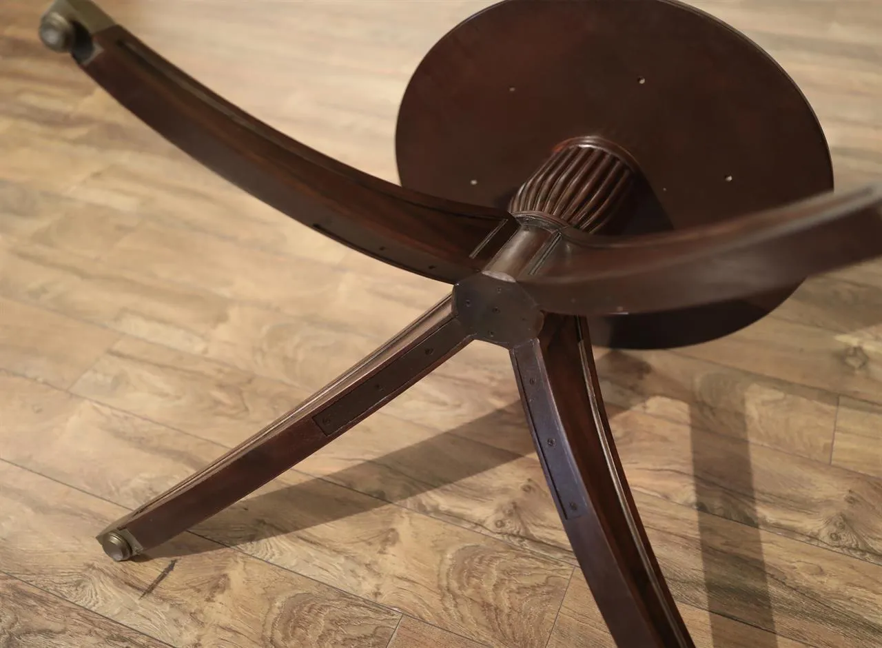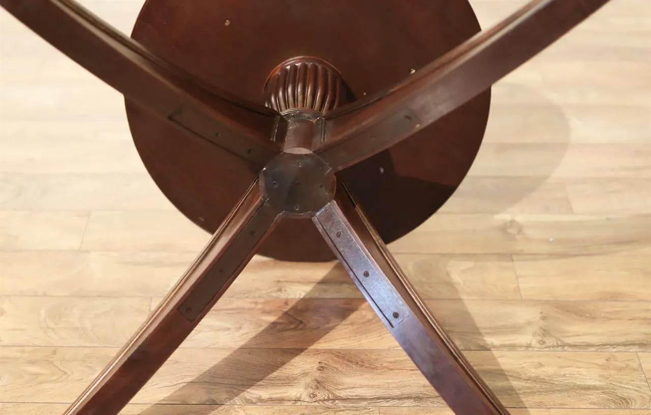 62-inch round mahogany dining table with 6 personal placemats and 6 personal drawers. A pie-cut flame mahogany top with a two-tone mahogany finish and fine inlay. Each place setting has a fitted tiger-oak drawer and a felt-backed mahogany placemat. This mahogany dining room table can also be used as a grand foyer table because the perimeter of the table is decorated with a flame mahogany apron and fine drawer pulls. The four out-sweeping Duncan Phyfe legs are reinforced with steel braces and the legs end with heavy brass foot caps and levelers.