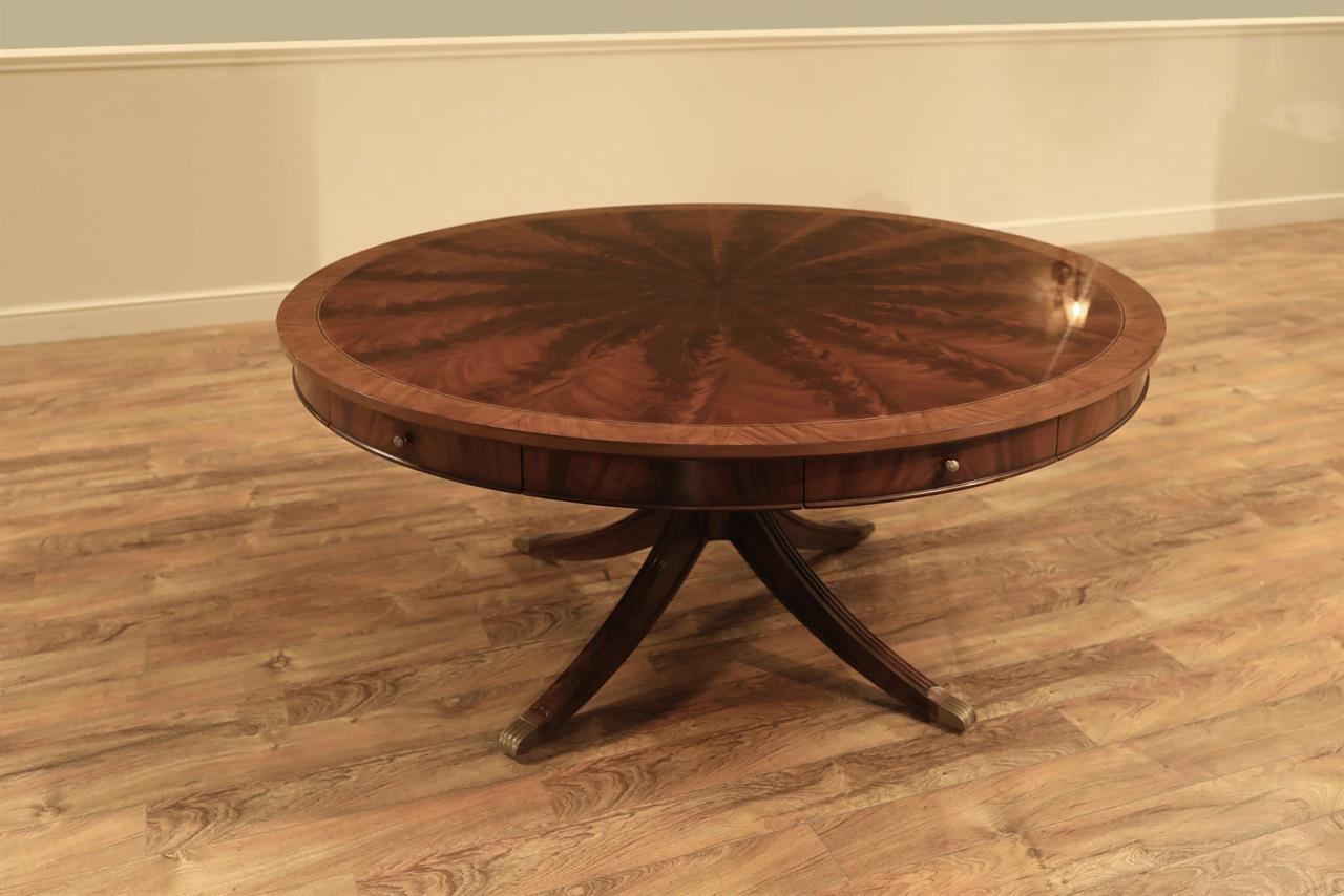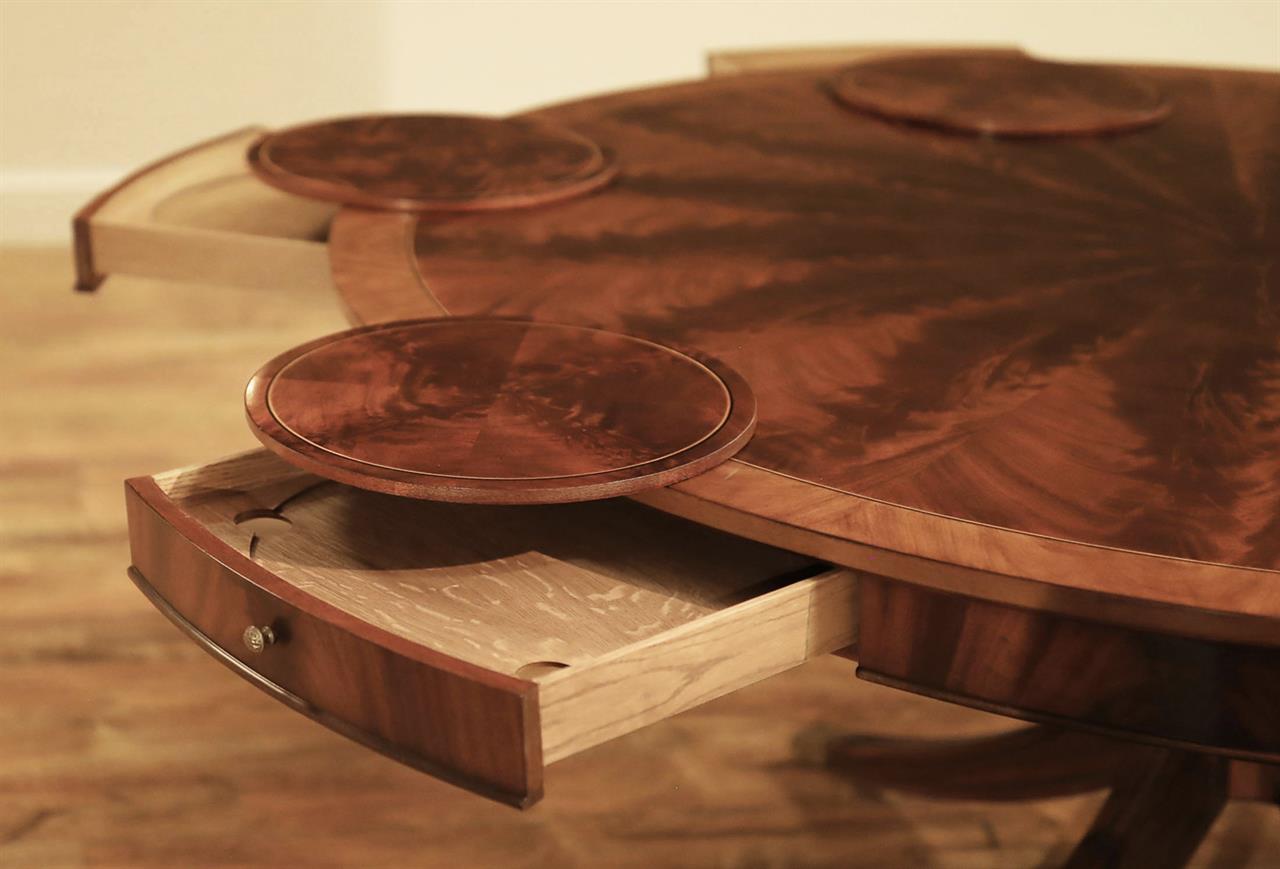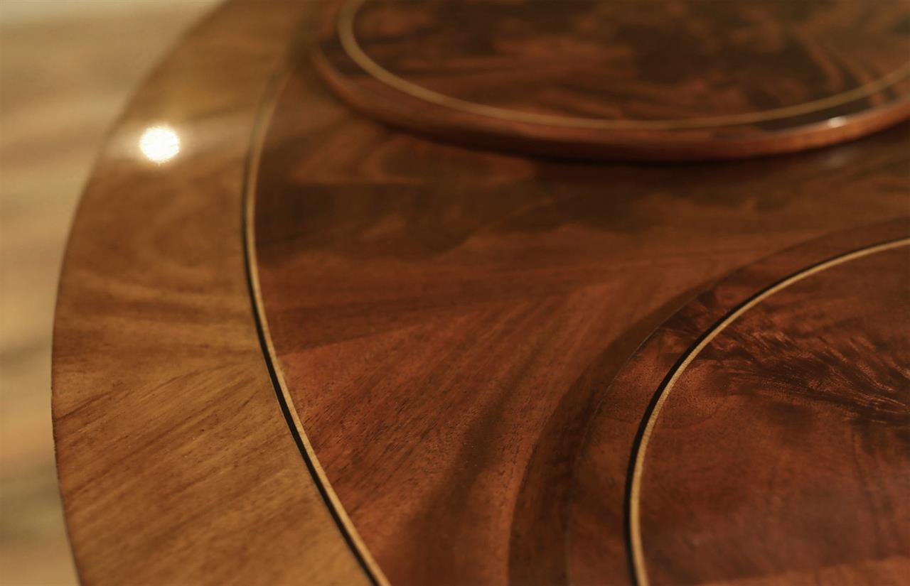 62-inch round mahogany dining table with 6 personal placemats and 6 personal drawers, an AP Exclusive by AntiquePurveyor. A pie-cut flame mahogany top with a two-tone mahogany finish and fine inlay. Each place setting has a fitted tiger-oak drawer and a felt-backed mahogany placemat. This mahogany dining room table can also be used as a grand foyer table because the perimeter of the table is decorated with a flame mahogany apron and fine drawer pulls. The four out-sweeping Duncan Phyfe legs are reinforced with steel braces and the legs end with heavy brass foot caps and levelers. The table top is available in a factory standard satin finish and our upgraded glossy finish.