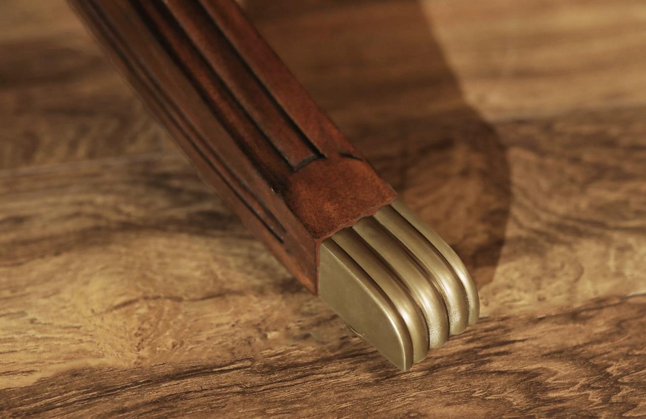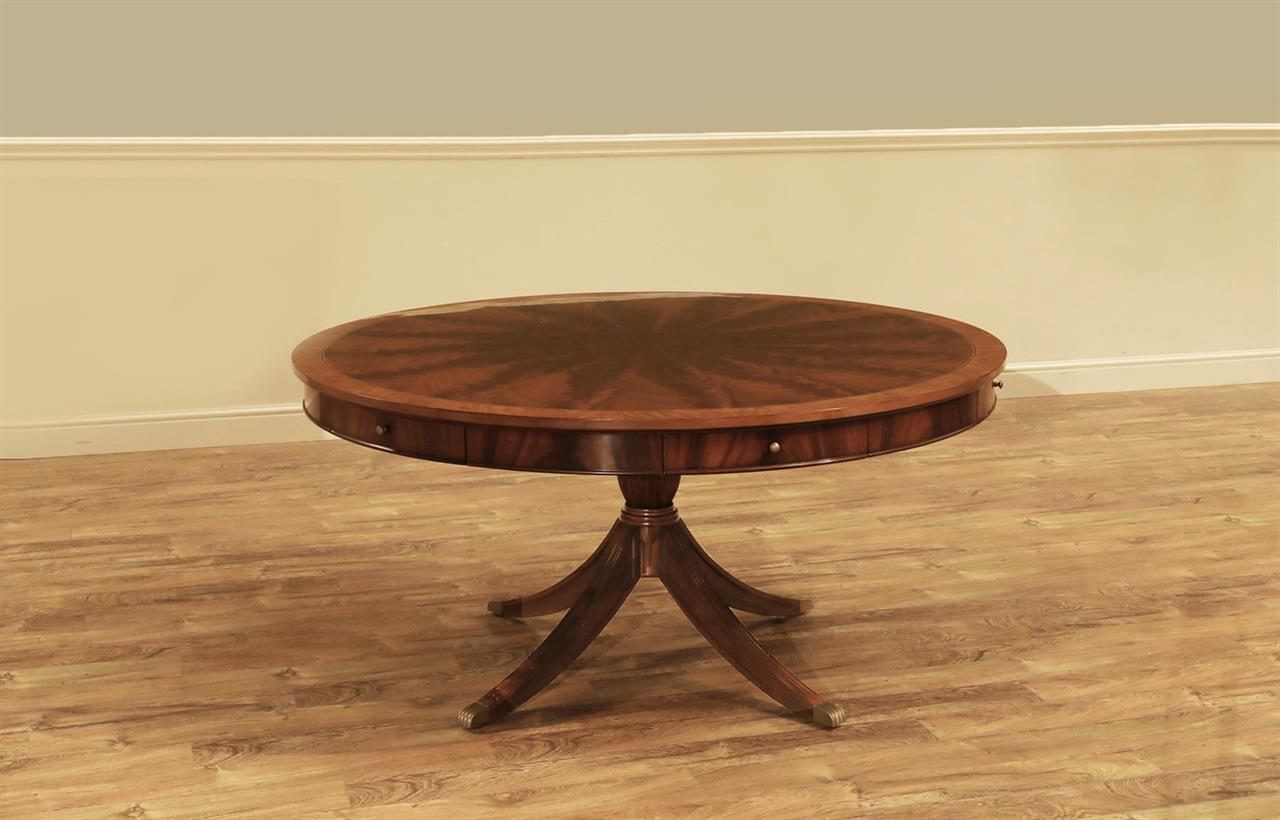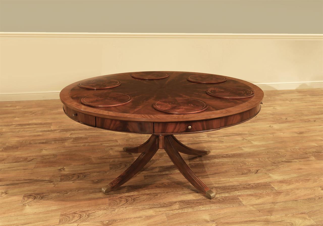 62-inch round mahogany dining table with 6 personal placemats and 6 personal drawers, an AP Exclusive by AntiquePurveyor. A pie-cut flame mahogany top with a two-tone mahogany finish and fine inlay. Each place setting has a fitted tiger-oak drawer and a felt-backed mahogany placemat. This mahogany dining room table can also be used as a grand foyer table because the perimeter of the table is decorated with a flame mahogany apron and fine drawer pulls. The four out-sweeping Duncan Phyfe legs are reinforced with steel braces and the legs end with heavy brass foot caps and levelers. The table top is available in a factory standard satin finish and our upgraded glossy finish.