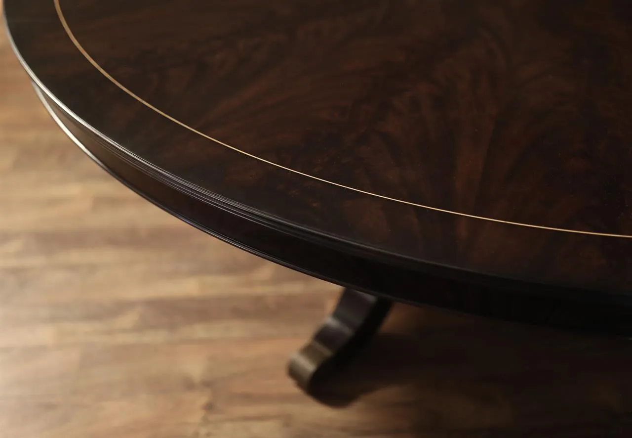 Large 84-inch round mahogany dining table. Pie-cut flame mahogany top with dark espresso brown finish and fine pinstripe inlay. This table sits on a sturdy birdcage pedestal with steel-reinforced Duncan Phyfe saber legs. Feet are capped with solid brass and quality levelers. This table is constructed of two large panels: a top and a bottom, and these panels are joined together with an internal frame. This is a very significant and heavy round mahogany dining room table. The table is 84 inches round and 30″ tall.