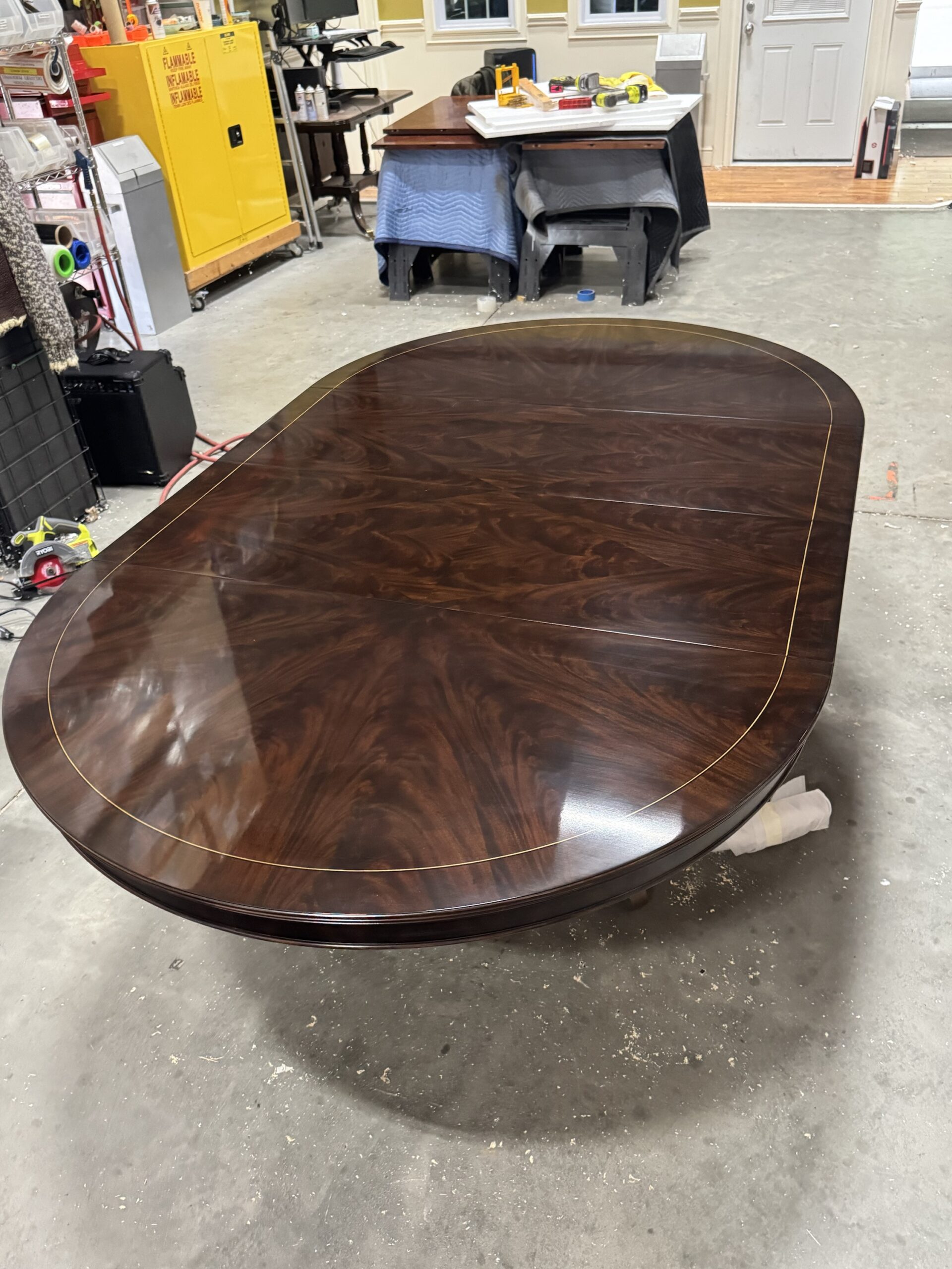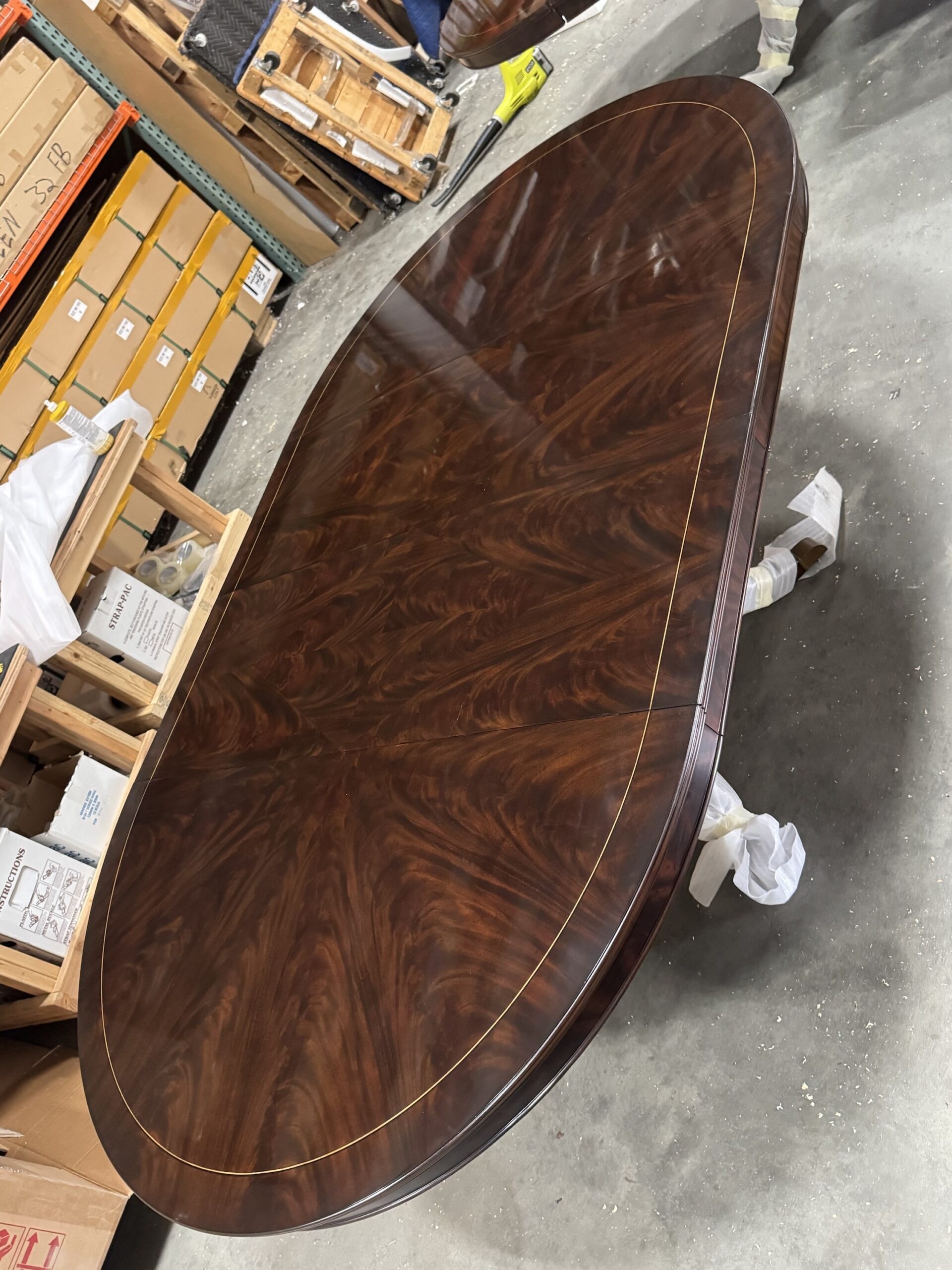 Circular mahogany dining table, 54-inch round mahogany dining table with two 18-inch leaves. This round to oval dining table measures 90 inches in diameter and seats 4 to 8 people. This is a designer-grade dining table; it is heavy and dense, and you will see the quality as soon as you have one in front of you. This table was put together with American-made steel table slides, which can handle the two expansions without the need for drop-down legs. We also offer this table in a more traditional two-tone mahogany finish, but this particular table was finished with a dark walnut stain so that it will coordinate nicely with gray, navy blue, and modern pastels. It is a rich, dark-brown color that sometimes looks black when in a room. This well-made birdcage pedestal was designed to last for generations. Each saber leg was reinforced with steel, and each foot is capped off with custom solid brass feet and levels.