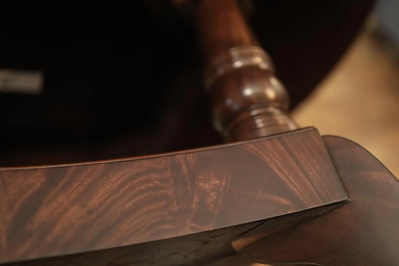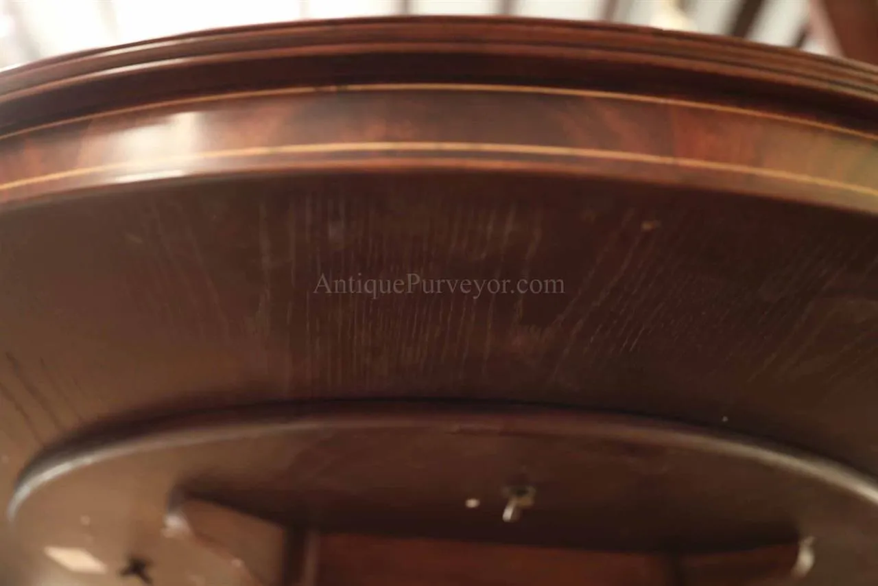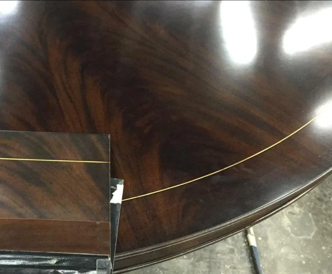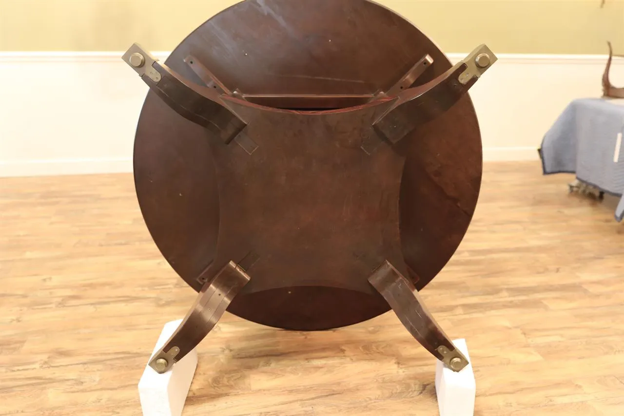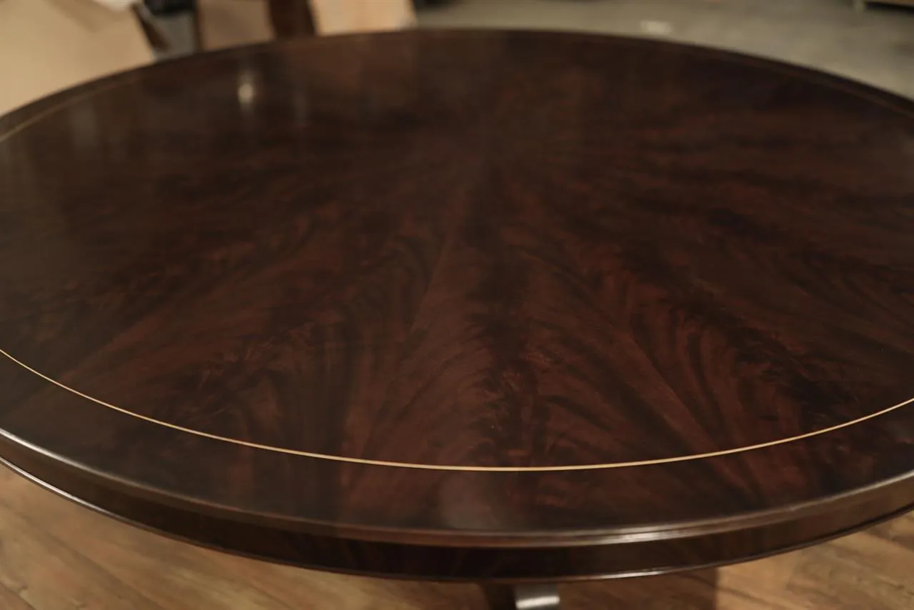 New designer grade one piece 84 inch round mahogany dining table on a wide and sturdy birdcage pedestal. This table is heavy and sturdy. The field is pie-cut flame mahogany and it is bordered with a toned down satinwood inlay. The apron on this table is also flame mahogany and it is decorated with two white pinstripes typicaly seen on18th century furniture. This table is part of our Custom Fit Classic collection and we offer this style table in many different sizes so if this table is to big we can provide you with something smaller. The table will comfortably seat 10 people. The feet are capped with a custom forged tarnished brass end caps and they are fitted with solid brass levels. This table is fit for a magestic estate or a luzury hotel foyer, its quality is second to none. The table is built with top and bottom faces unlike most 84 inch round tables that are just decorated with an apron this table will not warp or sag and it was engineered to last many generations. We are proud to offer this table at an amazing price point, it is our own design, we buy quantity and we import them direcly to our cost effective warehouse. The Veneers on this table were bathed and rinsed in a proprietary solution which relaxes the grain and clears the Veneers of oil and tannins. After the Veneers are rinsed and cleaned they are ironed flat and finally pressed into a pie-cut decorated top. This cleaning process greatly reduces the chances of checking and crazing over time. The finish is a razor thin 4mil lacquer finish which will show open woodgrain upon close inspection but the open grain disappears when you walk around the table and admire it from a normal distance. This razor thin finish also helps reduce any chance of crazing and cracking as it ages in your home as it will flex as the wood moves with humidity changes.