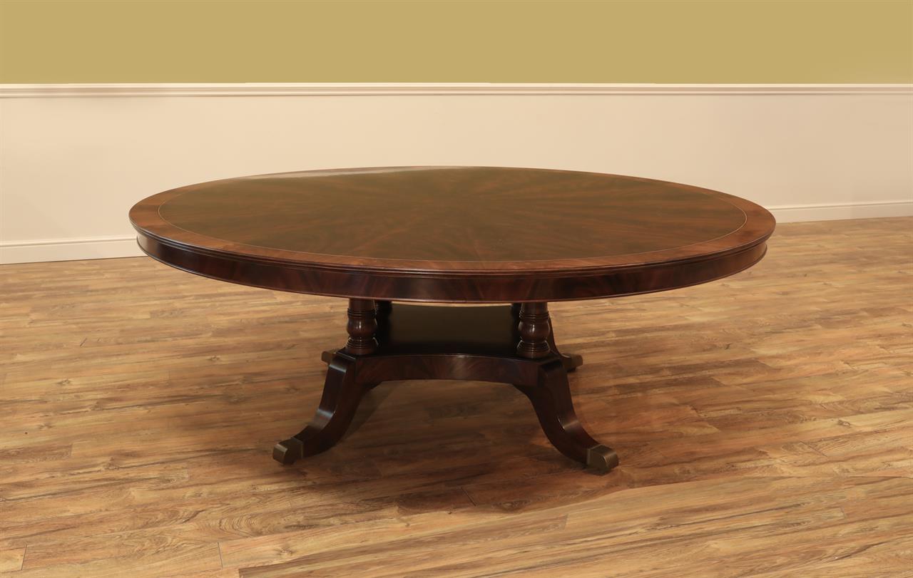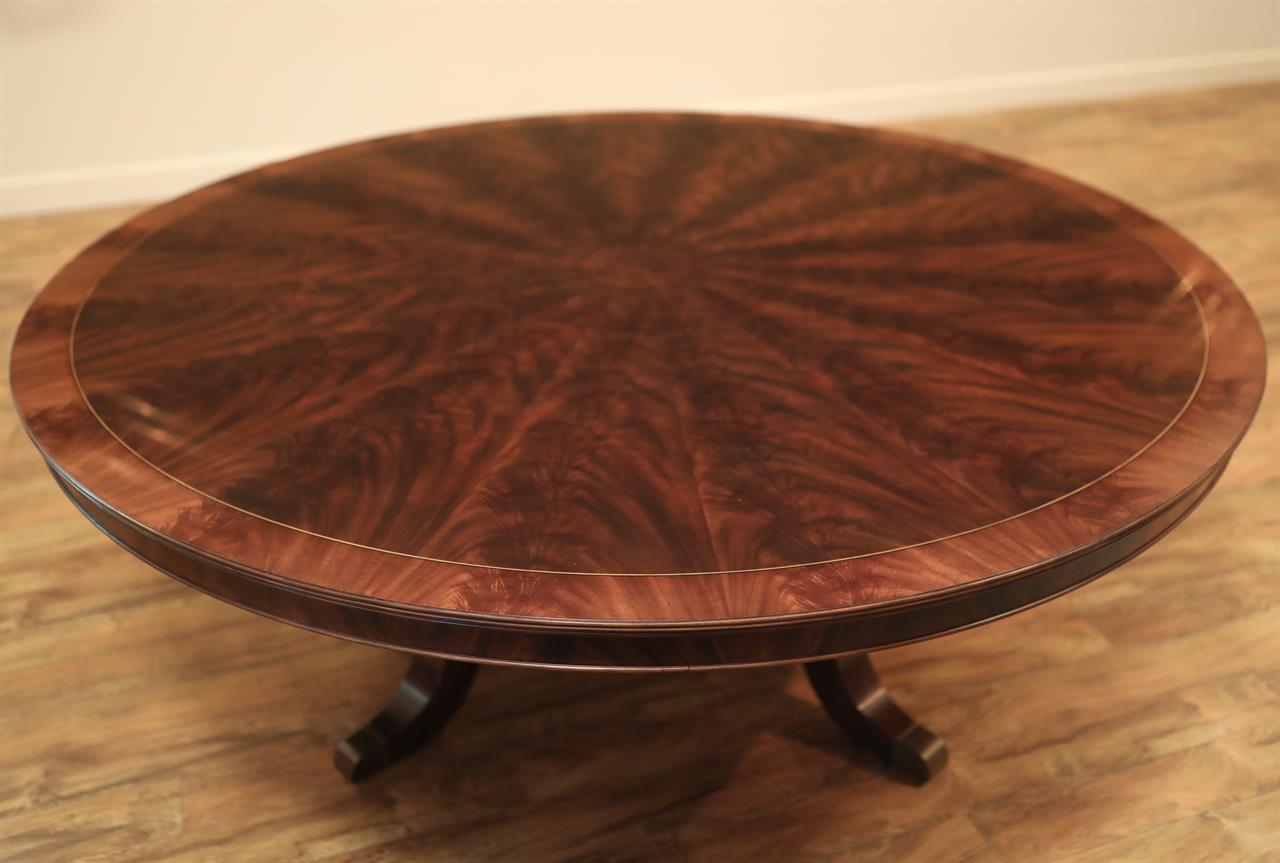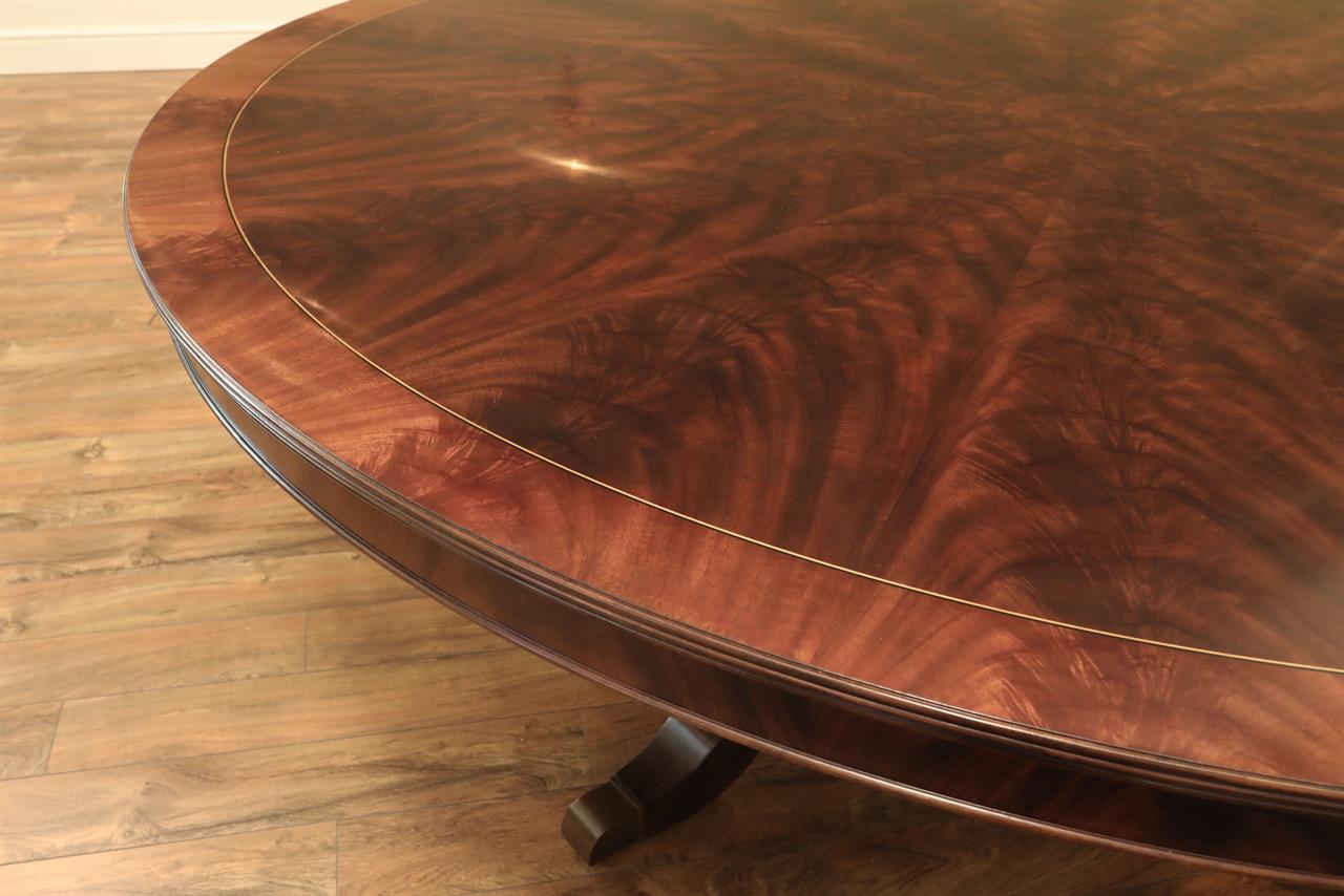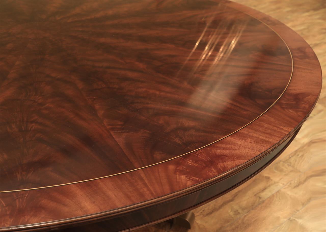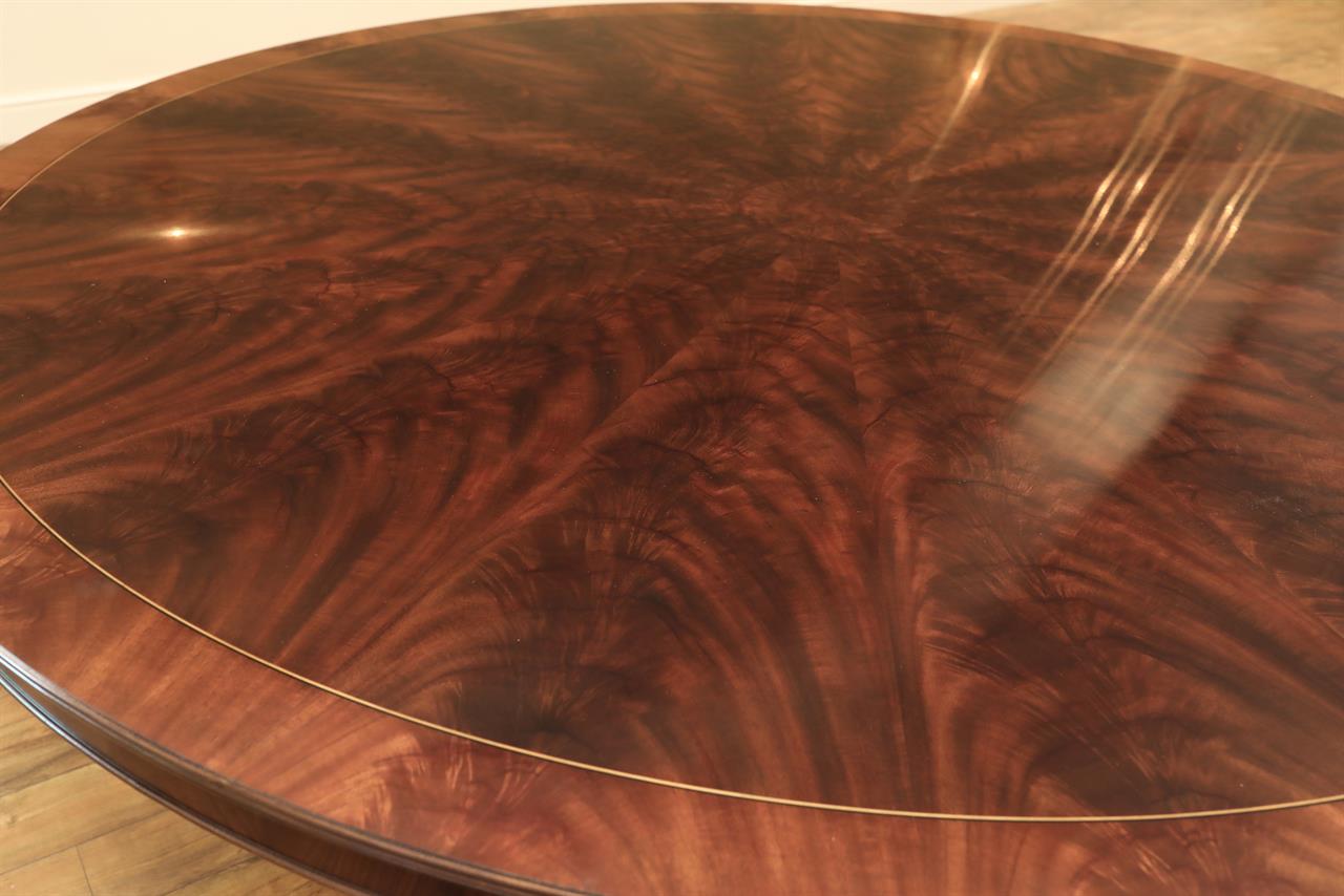 New designer grade one piece 84 inch round mahogany dining table on a wide and sturdy birdcage pedestal, an AP Exclusive by AntiquePurveyor.  This table is heavy and sturdy. The field is pie-cut flame mahogany and it is bordered with a toned down satinwood inlay.  The apron on this table is also flame mahogany and it is decorated with two white pinstripes typicaly seen on18th century furniture.  This table is part of our Custom Fit Classic collection and we offer this style table in many different sizes so if this table is to big we can provide you with something smaller.  The table will comfortably seat 10 people.  The feet are capped with a custom forged tarnished brass end caps and they are fitted with solid brass levels.  This table is fit for a magestic estate or a luzury hotel foyer, its quality is second to none.  The table is built with top and bottom faces unlike most 84 inch round tables that are just decorated with an apron this table will not warp or sag and it was engineered to last many generations.  We are proud to offer this table at an amazing price point, it is our own design, we buy quantity and we import them direcly to our cost effective warehouse.  The Veneers on this table were bathed and rinsed in a proprietary solution which relaxes the grain and clears the Veneers of oil and tannins. After the Veneers are rinsed and cleaned they are ironed flat and finally pressed into a pie-cut decorated top.  This cleaning process greatly reduces the chances of checking and crazing over time.  The finish is a razor thin 4mil lacquer finish which will show open woodgrain upon close inspection but the open grain disappears when you walk around the table and admire it from a normal distance.  This razor thin finish also helps reduce any chance of crazing and cracking as it ages in your home as it will flex as the wood moves with humidity changes.