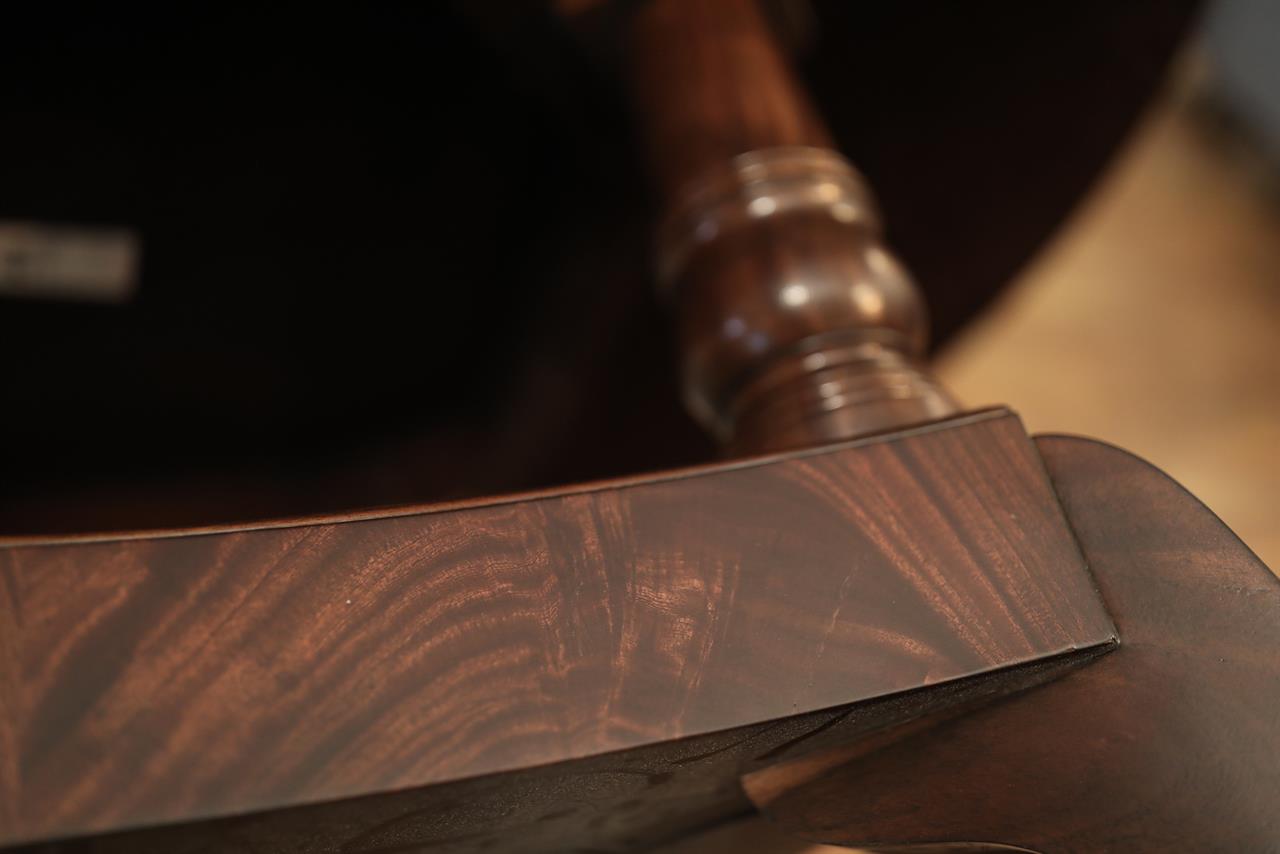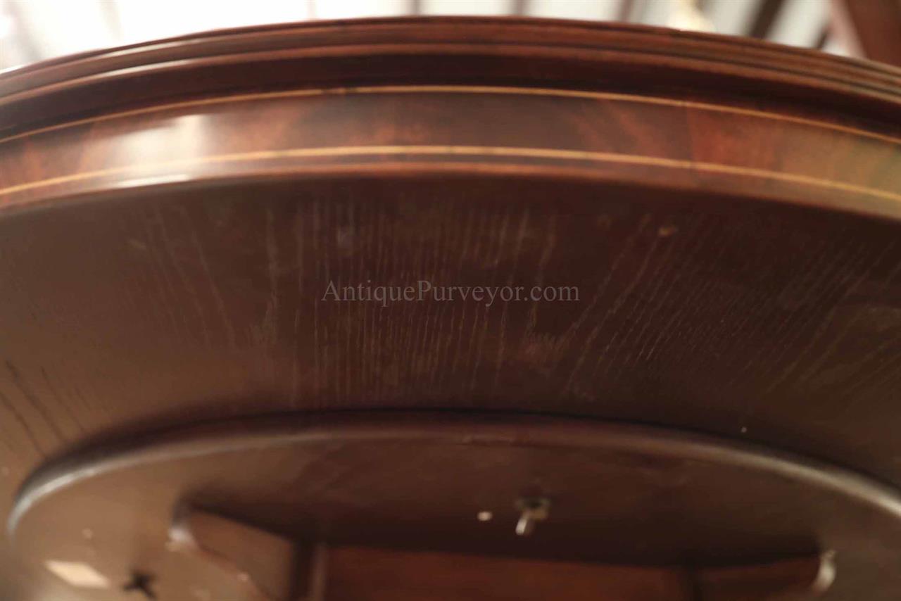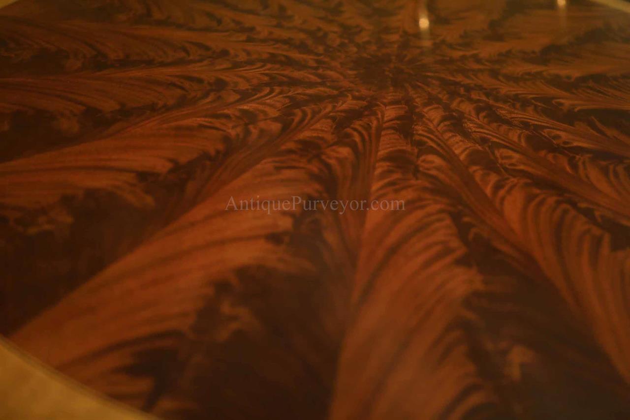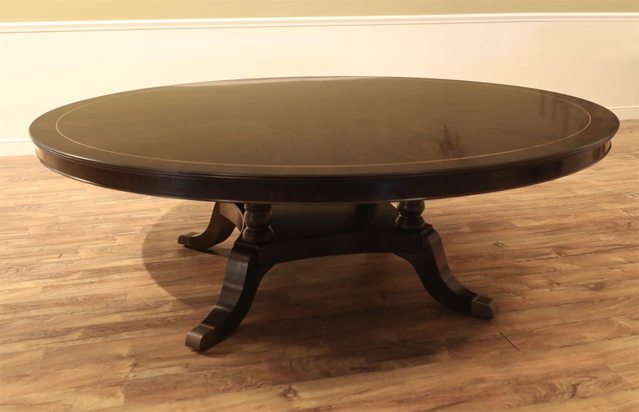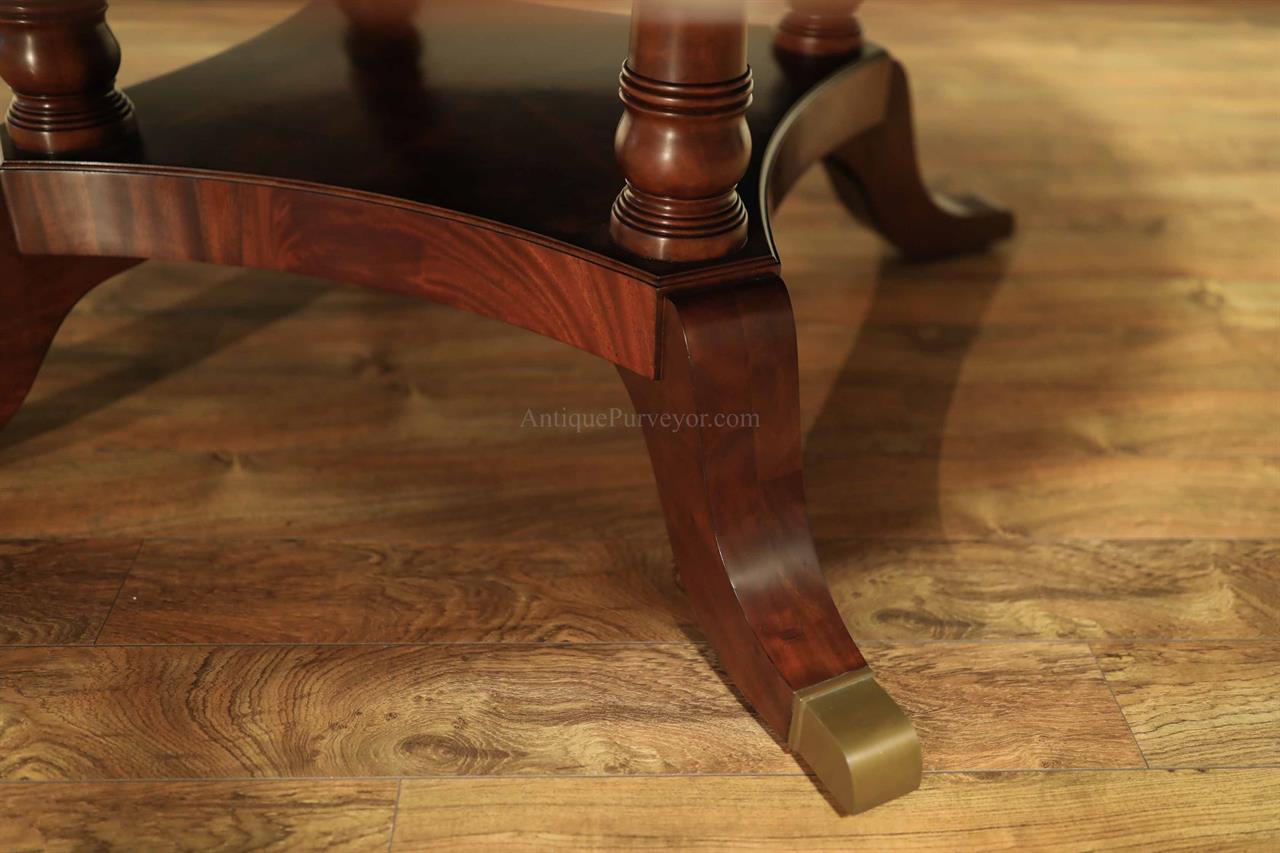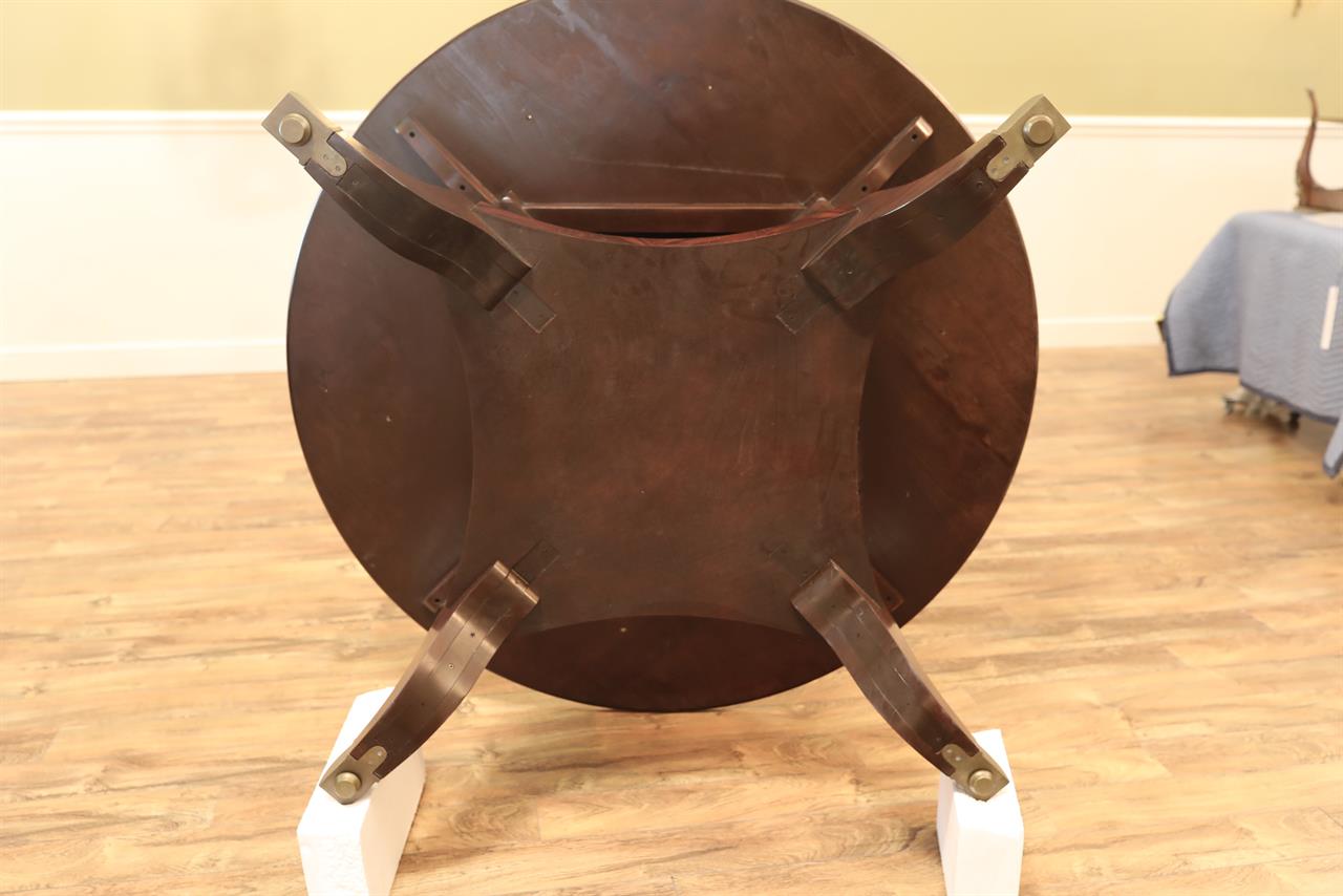New designer grade one piece 84 inch round mahogany dining table on a wide and sturdy birdcage pedestal, an AP Exclusive by AntiquePurveyor.  This table is heavy and sturdy. The field is pie-cut flame mahogany and it is bordered with a toned down satinwood inlay.  The apron on this table is also flame mahogany and it is decorated with two white pinstripes typicaly seen on18th century furniture.  This table is part of our Custom Fit Classic collection and we offer this style table in many different sizes so if this table is to big we can provide you with something smaller.  The table will comfortably seat 10 people.  The feet are capped with a custom forged tarnished brass end caps and they are fitted with solid brass levels.  This table is fit for a magestic estate or a luzury hotel foyer, its quality is second to none.  The table is built with top and bottom faces unlike most 84 inch round tables that are just decorated with an apron this table will not warp or sag and it was engineered to last many generations.  We are proud to offer this table at an amazing price point, it is our own design, we buy quantity and we import them direcly to our cost effective warehouse.  The Veneers on this table were bathed and rinsed in a proprietary solution which relaxes the grain and clears the Veneers of oil and tannins. After the Veneers are rinsed and cleaned they are ironed flat and finally pressed into a pie-cut decorated top.  This cleaning process greatly reduces the chances of checking and crazing over time.  The finish is a razor thin 4mil lacquer finish which will show open woodgrain upon close inspection but the open grain disappears when you walk around the table and admire it from a normal distance.  This razor thin finish also helps reduce any chance of crazing and cracking as it ages in your home as it will flex as the wood moves with humidity changes.
